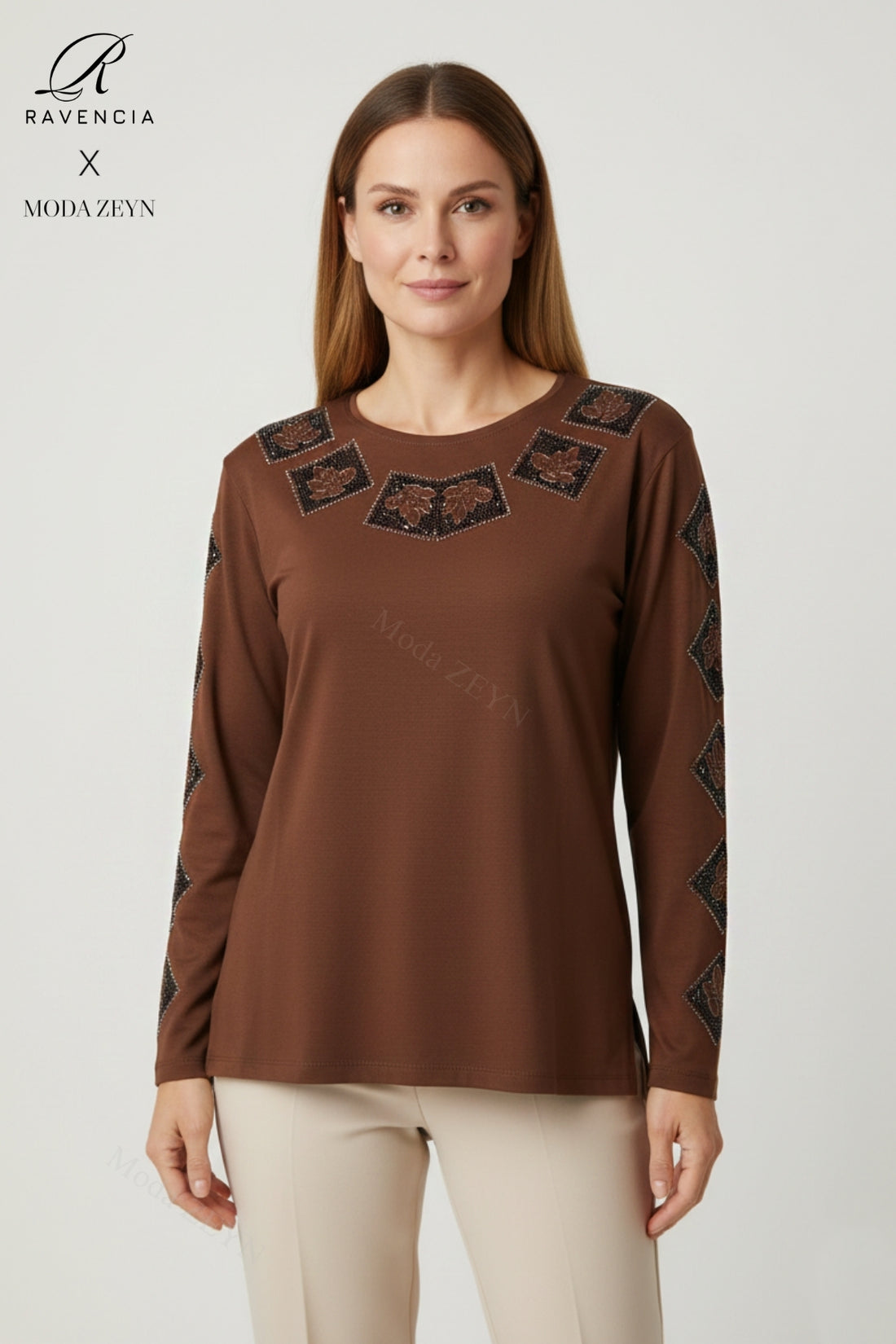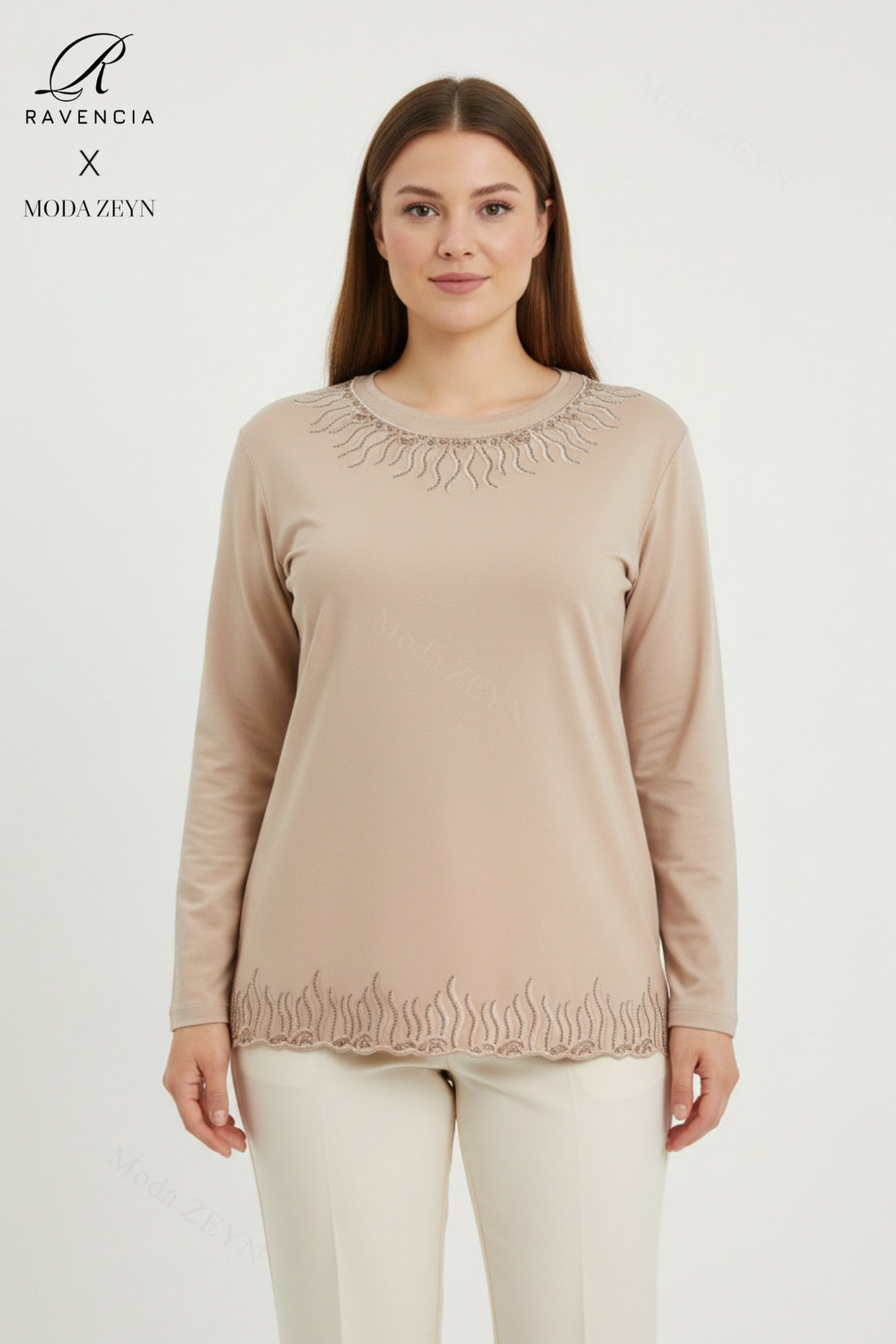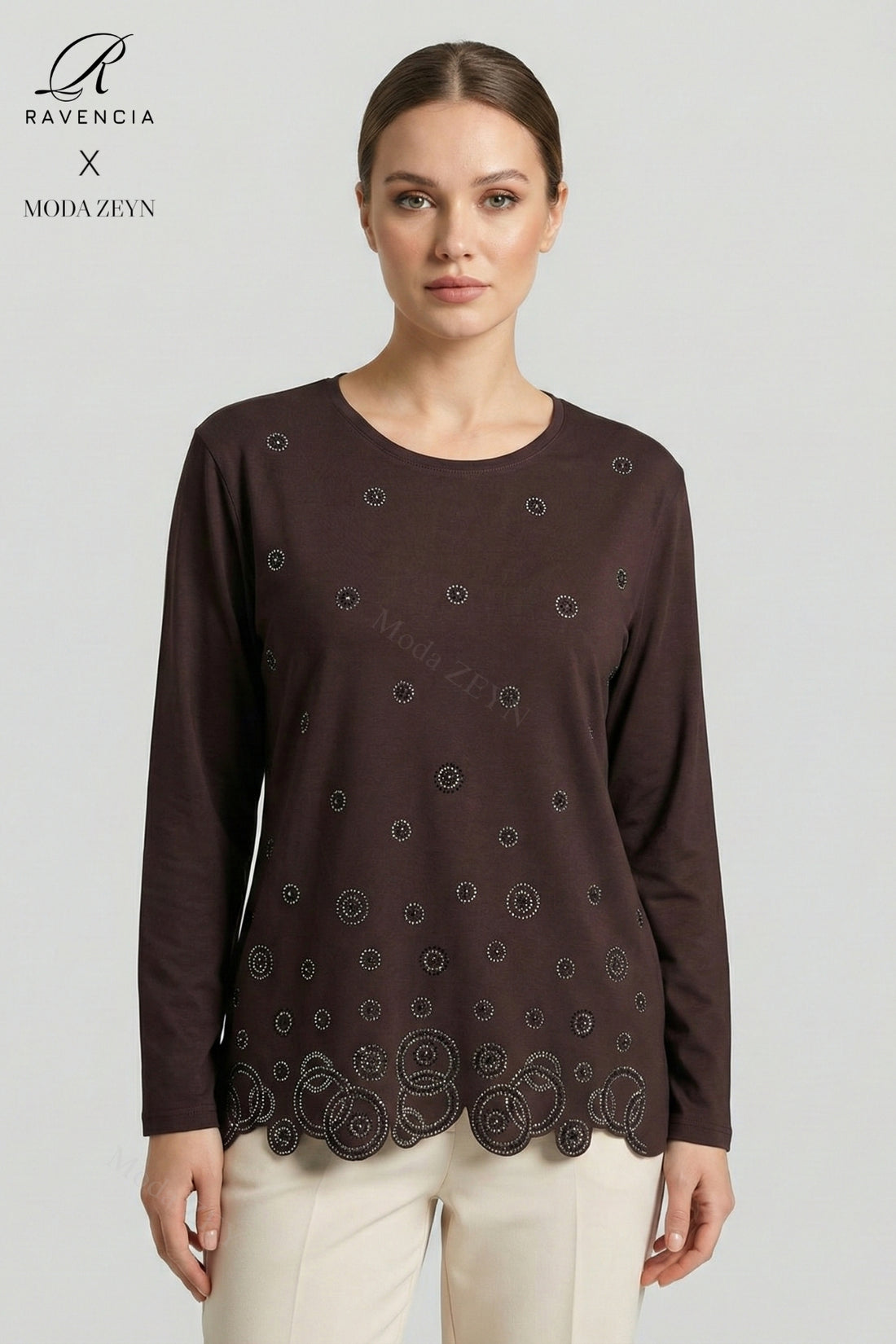 Kadın Halka Şerit Desen Taşlı Işlemeli Yırtmaçlı Likralı Viskon Anne Penye Bluz