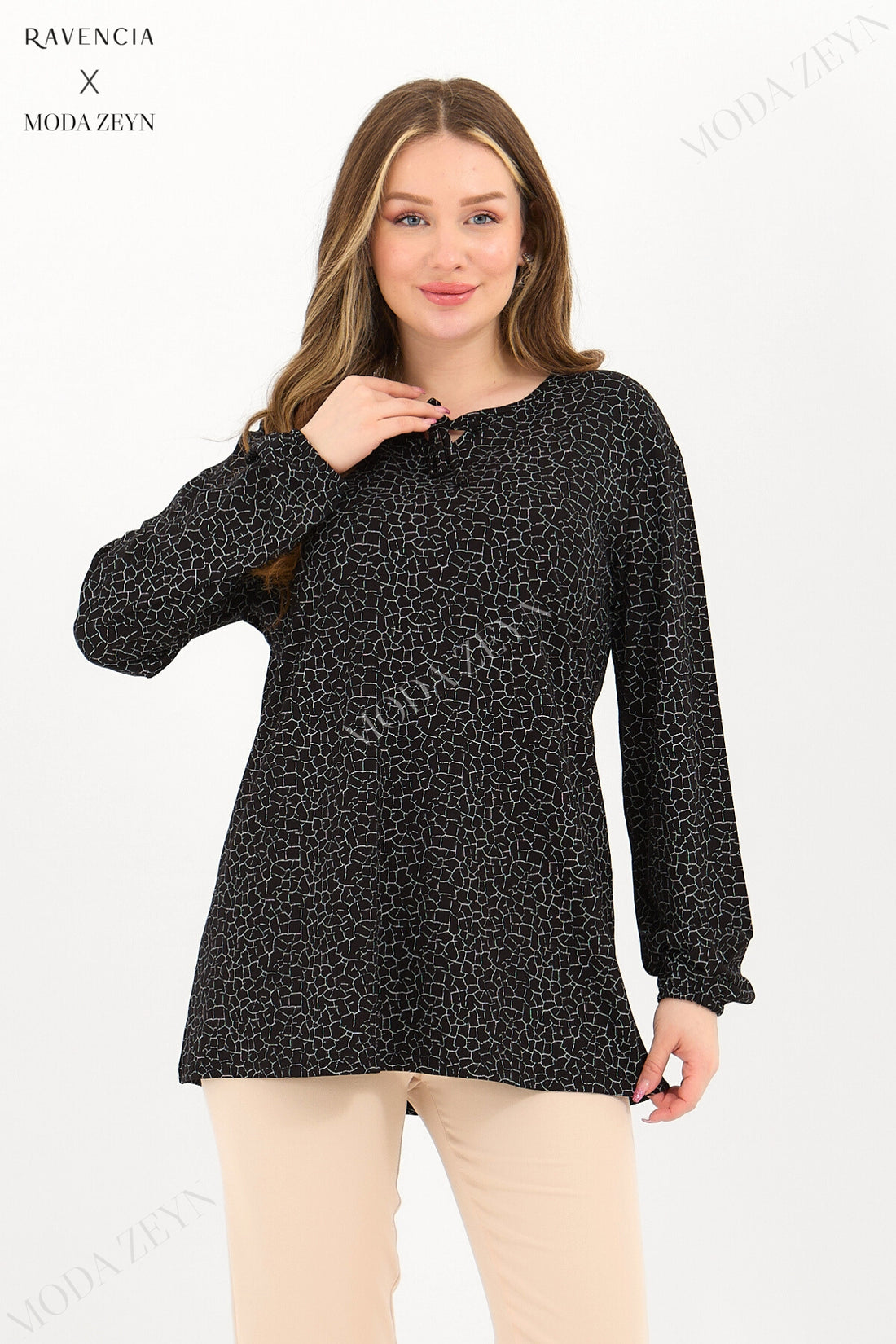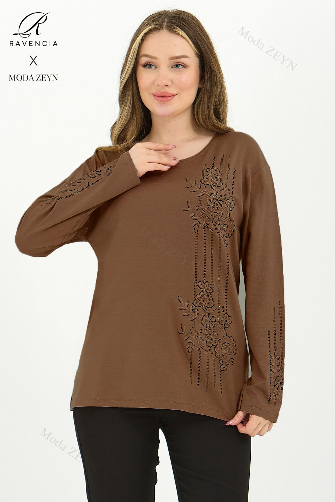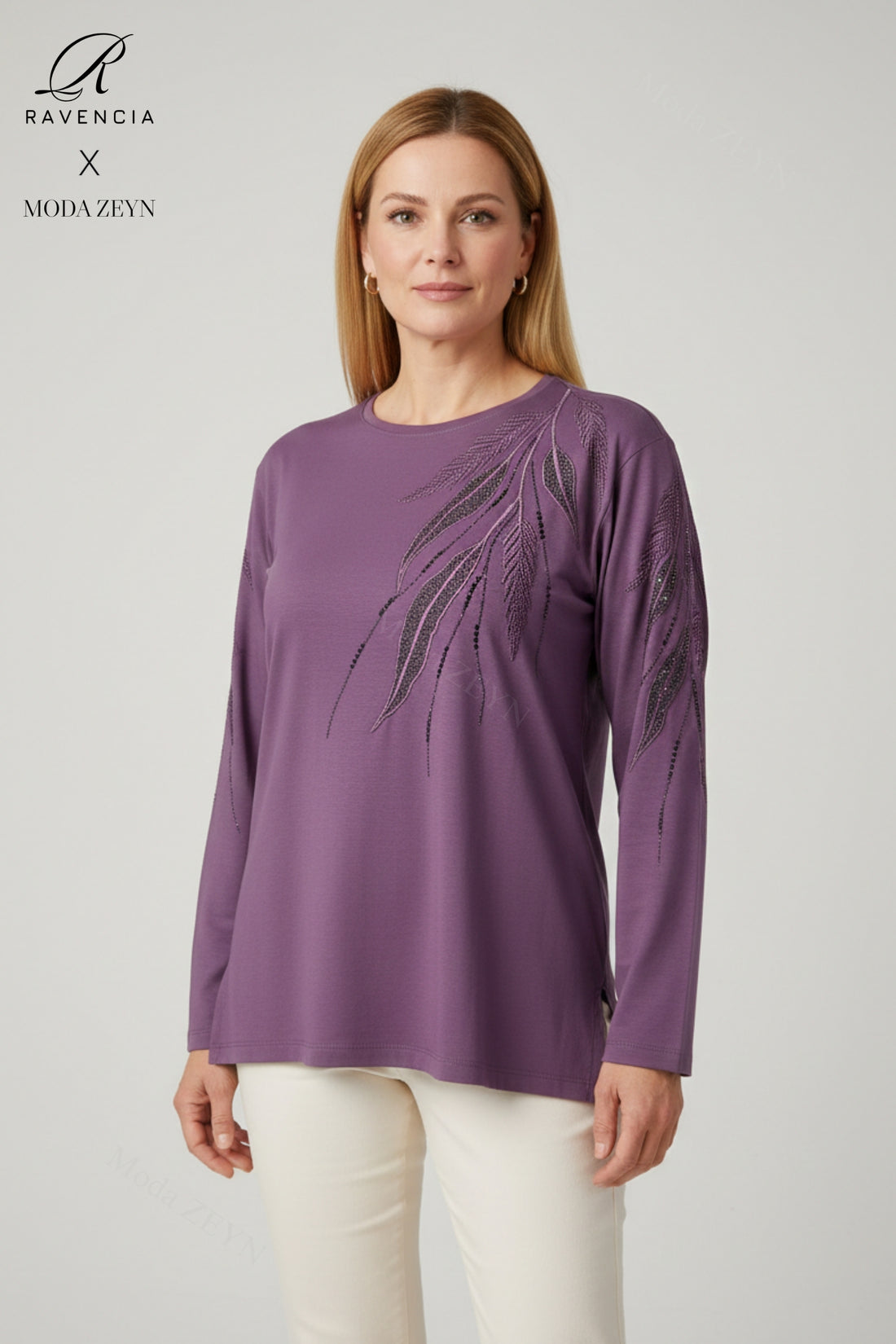 Kadın Halka Şerit Desen Taşlı Işlemeli Yırtmaçlı Likralı Viskon Anne Penye Bluz