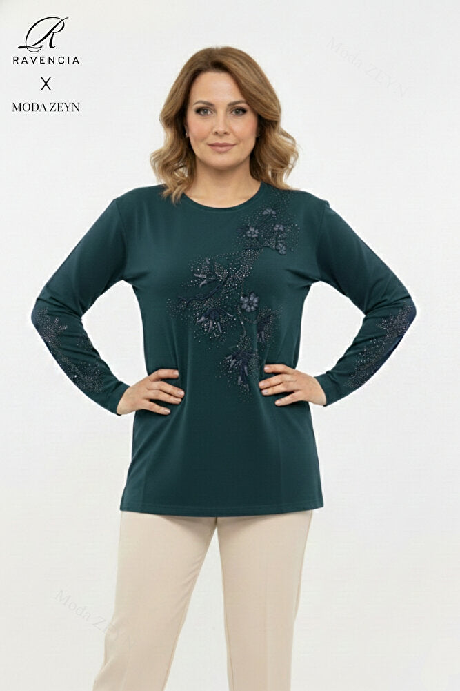 Kadın Orta Yaş Ve Üzeri Viskon Yeni Kaplama Desen Taşlı Işlemeli Likralı Zümrüt Anne Penye Bluz