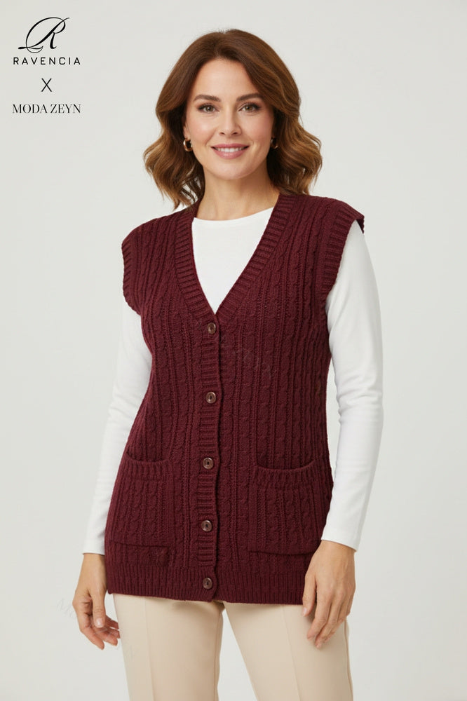 Kadın V Yaka Kalın Yün Saç Örgü Triko Düğmeli Cepli Anne Yelek