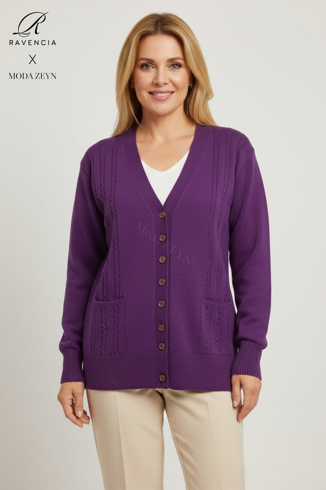 Kadın V Yaka Düğmeli Triko Anne Hırka