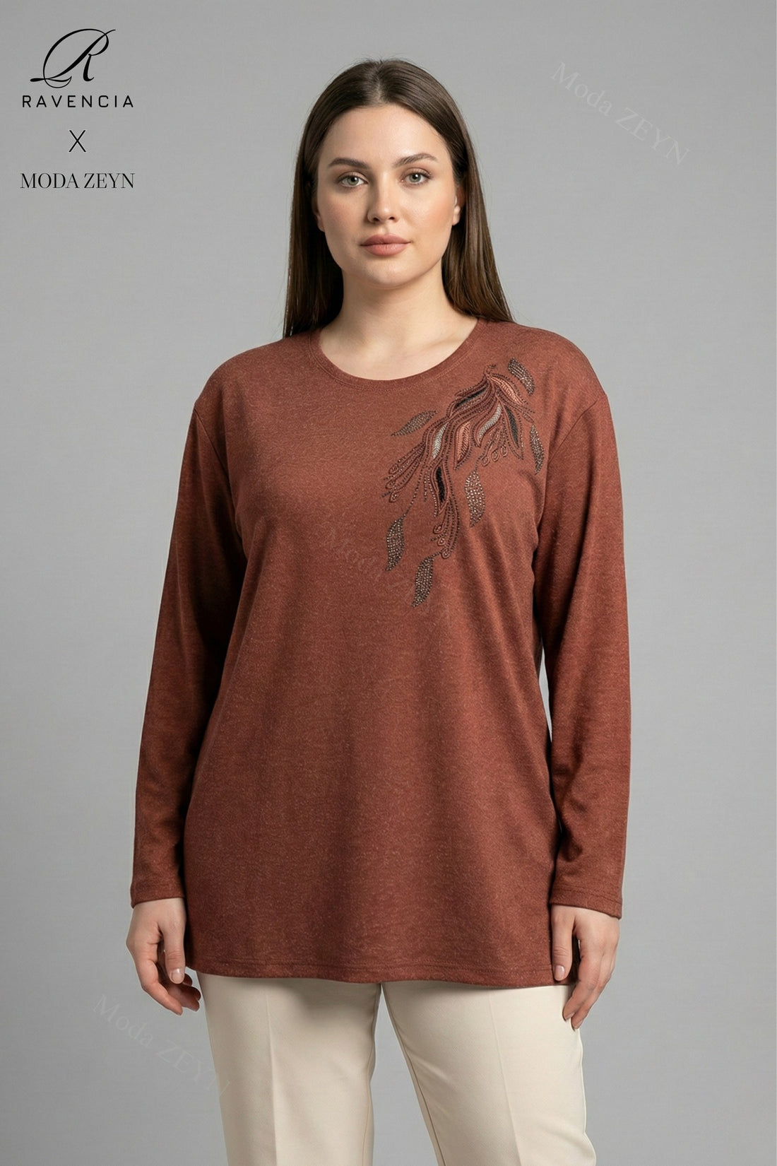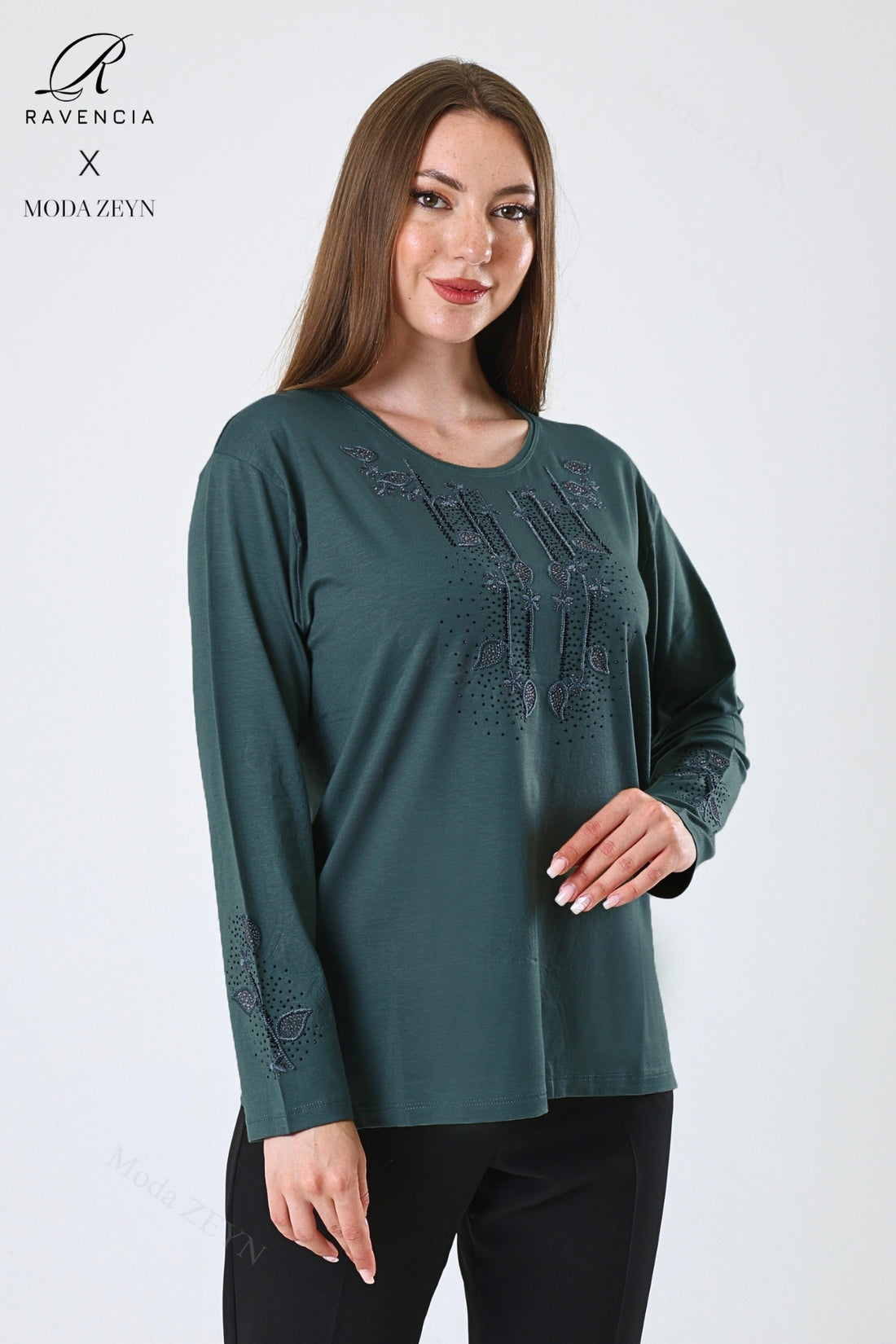 Kadın Yaprak Desenli Taşlı Yırtmaçlı Nakış İşlemeli Likralı Viskon Anne Penye Bluz