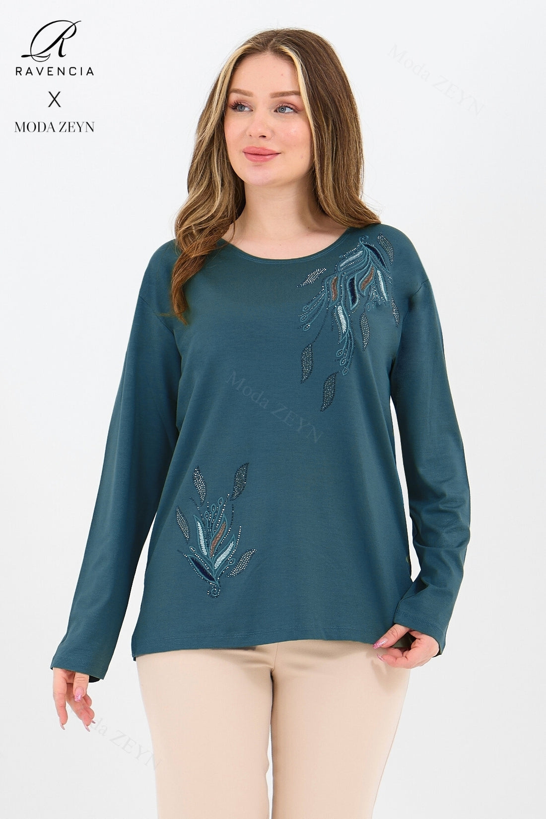 Kadın Viskon Renkli Yaprak Desen Taşlı İşlemeli Likralı Anne Penye Bluz