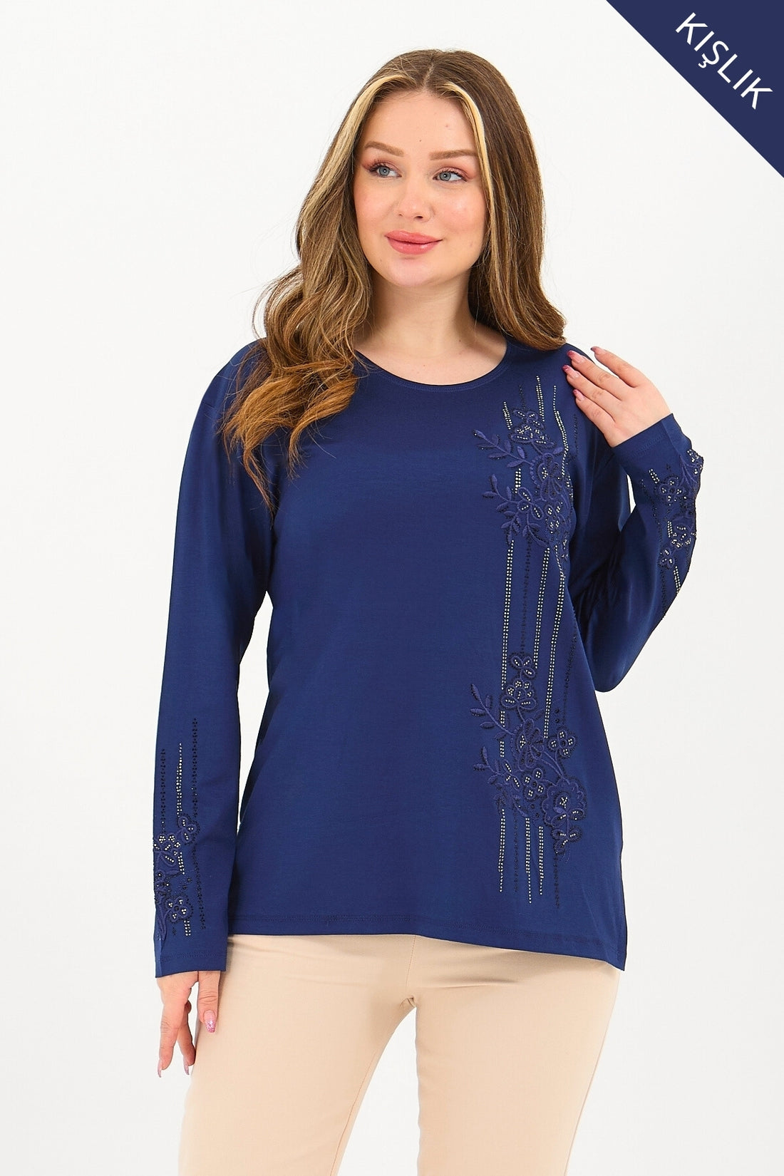 Kadın Kışlık Viskon Şerit Desen Taşlı Işlemeli Likralı Anne Penye Bluz