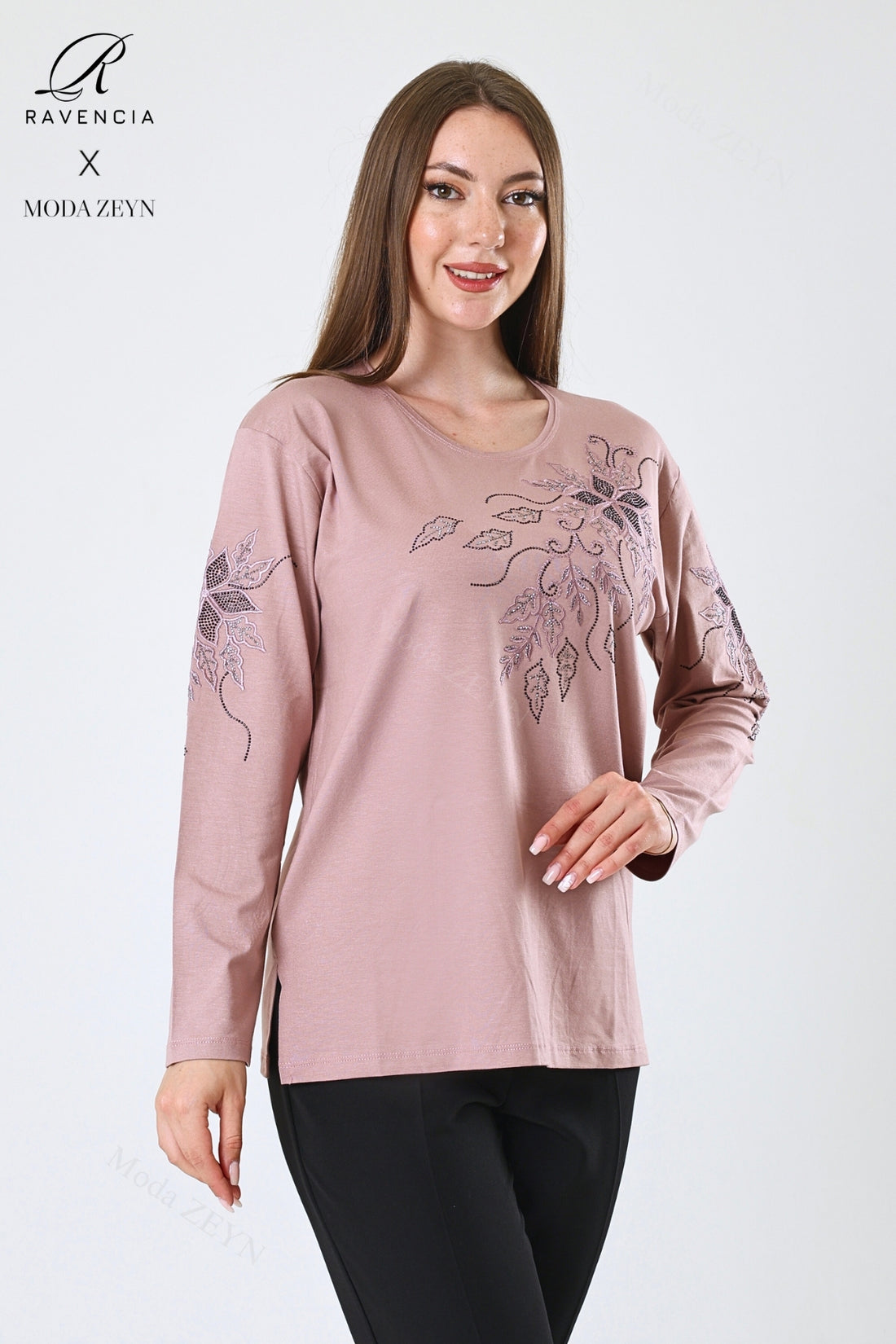 Kadın Çift Damla Dal Desenli Taşlı Işlemeli Yırtmaçlı Likralı Viskon Anne Penye Bluz