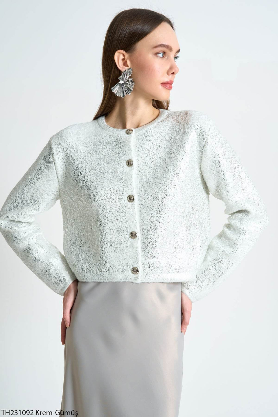 Kadın Gold Düğme Detaylı Varaklı Triko GümüşHırka