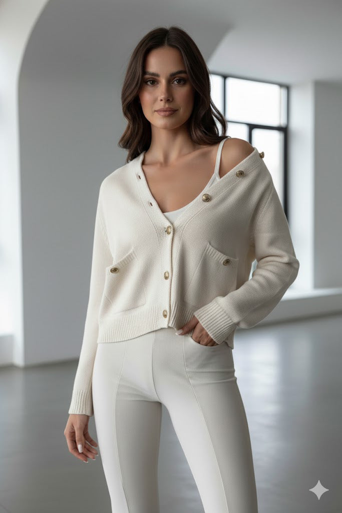 Gold düğme detaylarıyla zarif bir ışıltı sunan bu hırka, krem tonuyla sade ve şık bir...