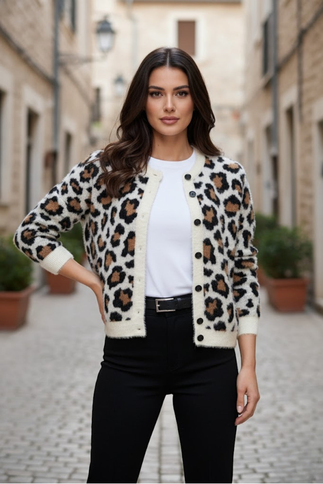 Leopar deseniyle cesur ve modern bir stil sunan bu triko hırka, yumuşak dokusuyla gün boyu...