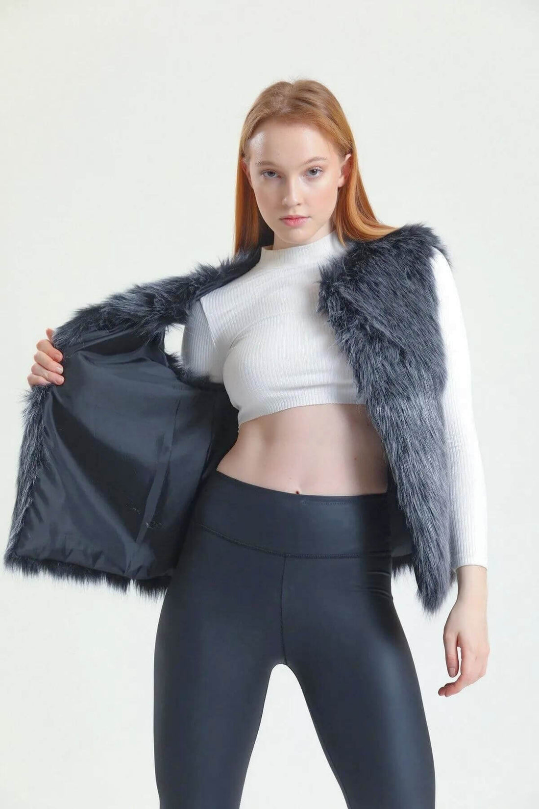 Kadın premium suni kürk antrasit yelek, lüks ve sofistike bir stile sahiptir. Yumuşak suni kürk...