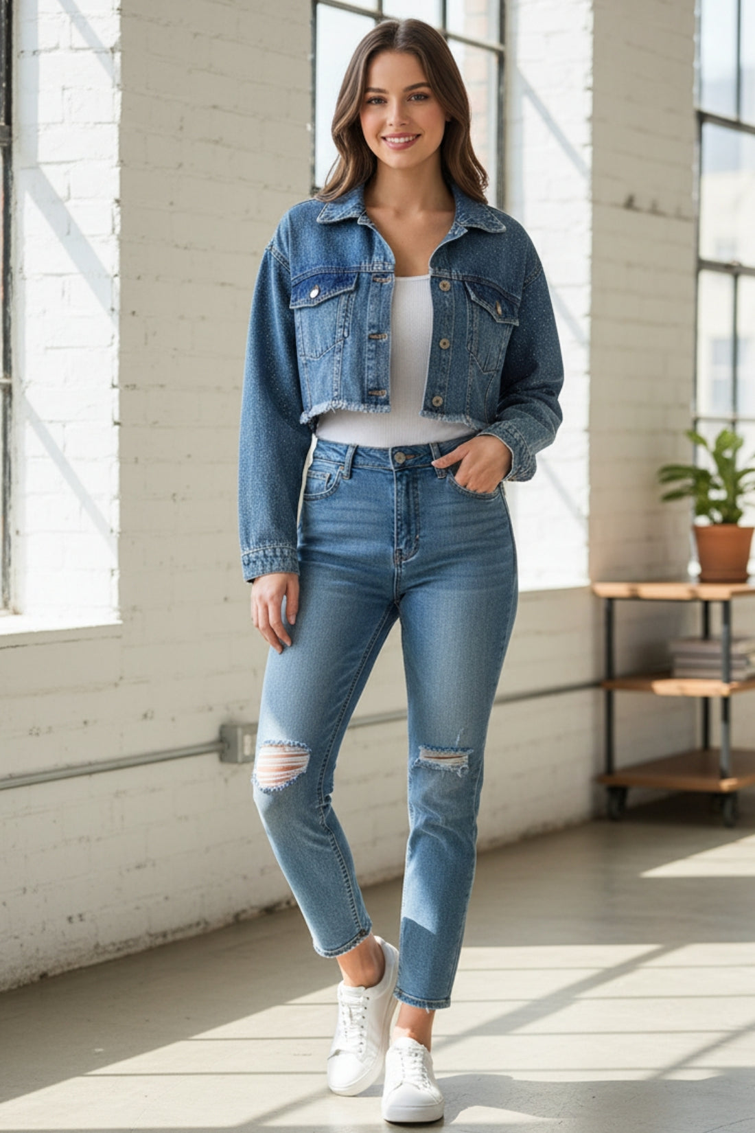 Kadın taşlı oversize mavi kot ceket, modern ve iddialı bir stile sahiptir. Taş işlemeleriyle ışıltılı...