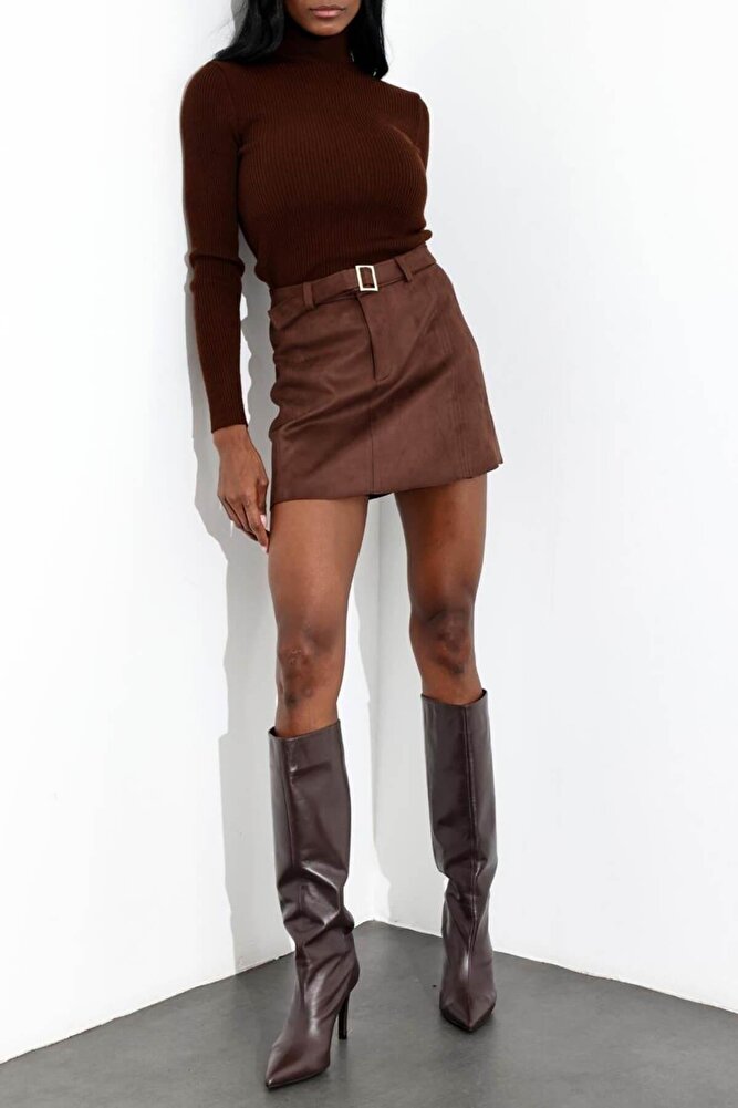 Kadın Premium Kalite Süet Kemerli Likralı Acı Kahve Etek