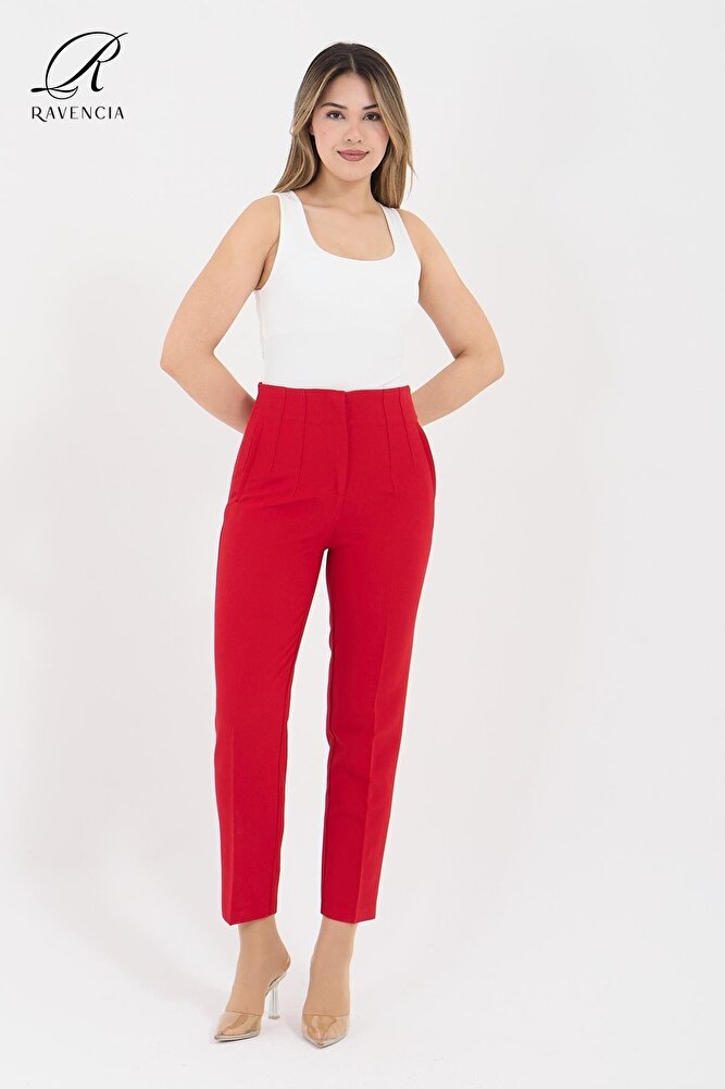 Kadın Model Yüksek Bel Kumaş Koyu Kırmızı Pantolon