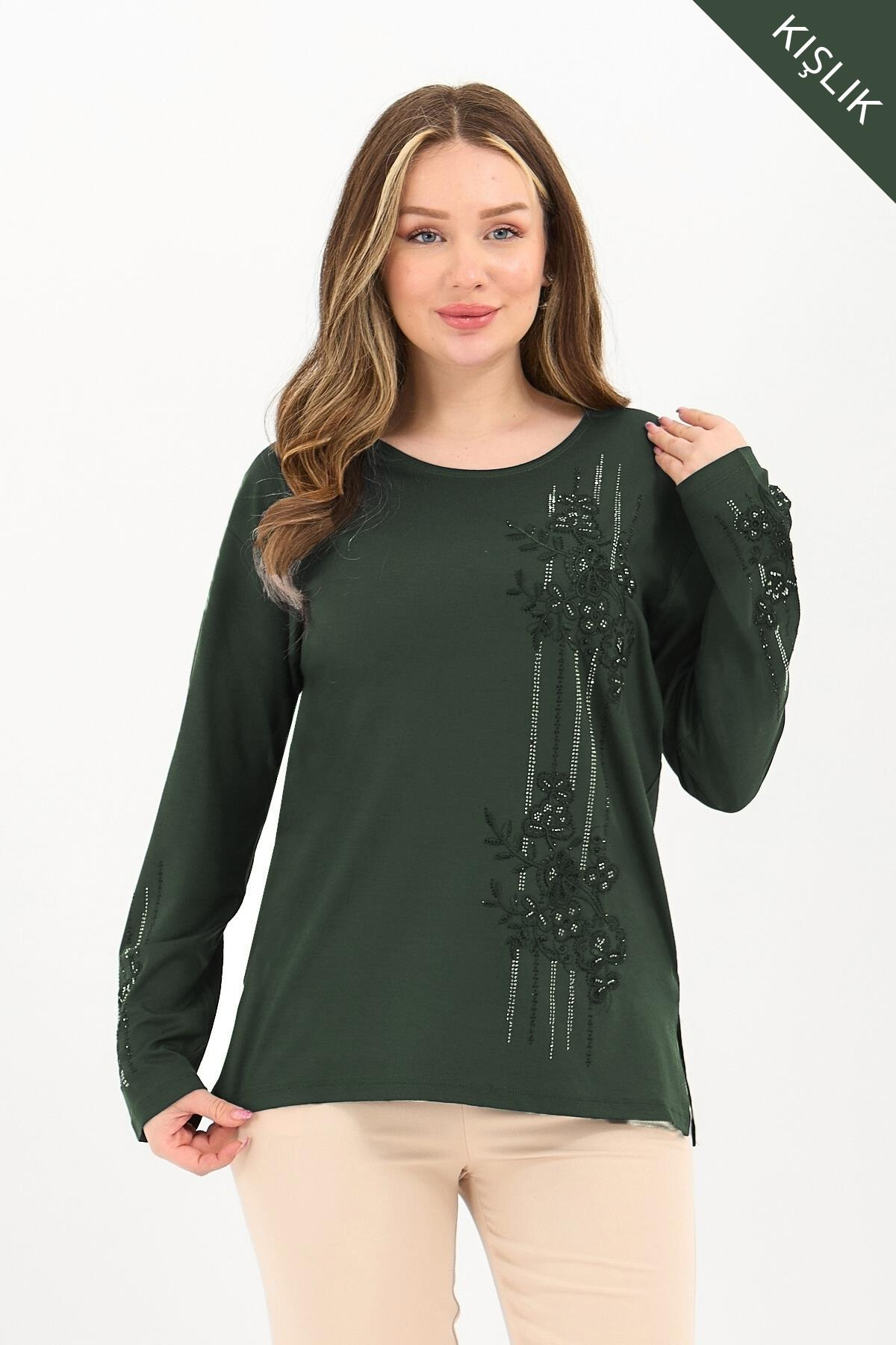 Kışlık Kadın Orta Yaş Ve Üzeri Yonca Şerit Desen Taşlı Işlemeli Likralı Haki Anne Penye Bluz