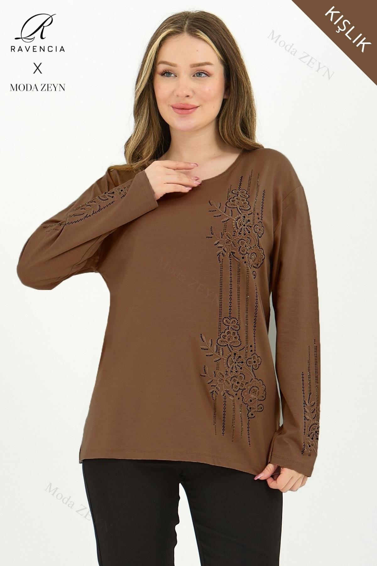 Kışlık Kadın Orta Yaş Ve Üzeri Yonca Şerit Desen Taşlı Işlemeli Likralı Koyu Kahverengi Anne Penye Bluz