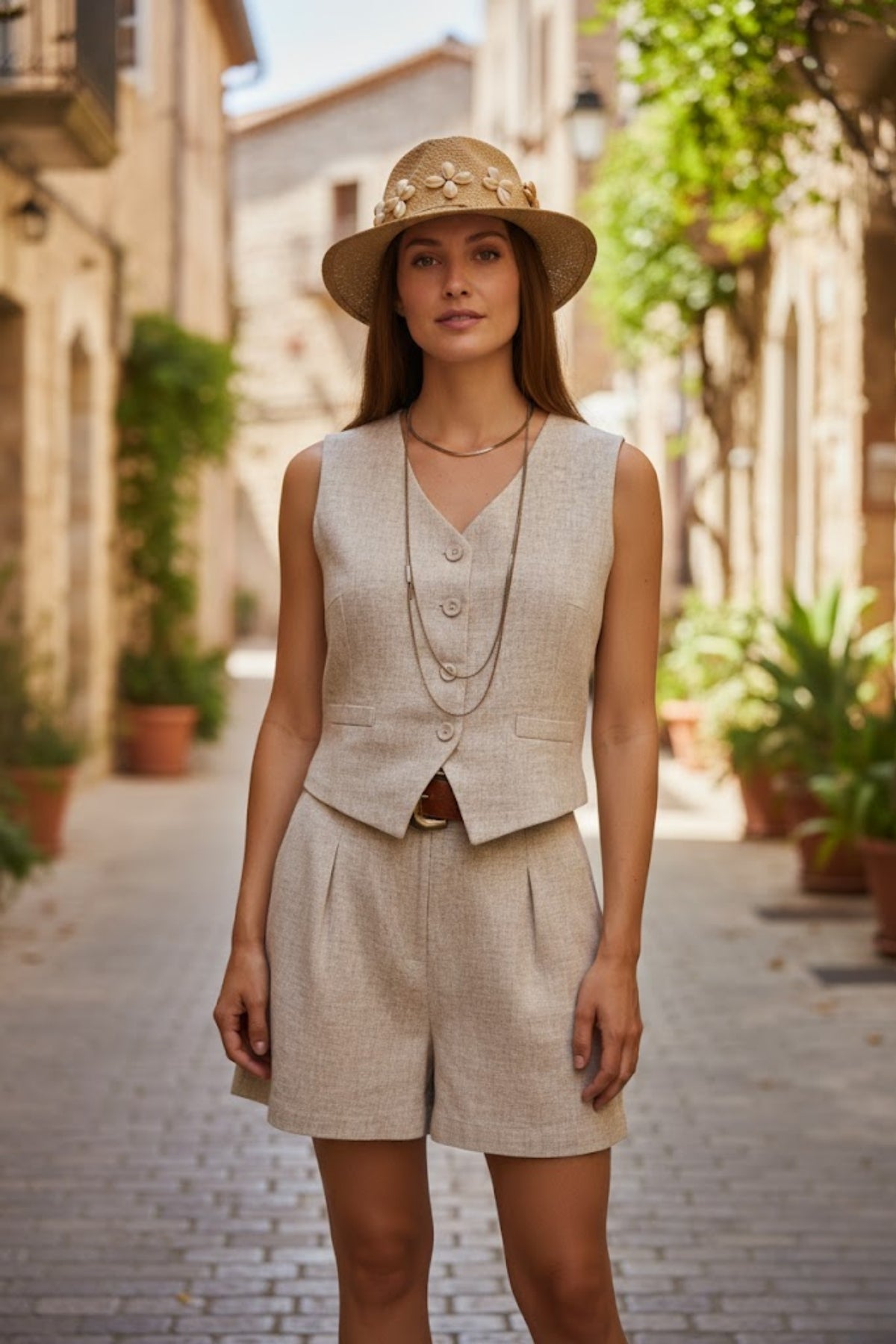 Kadın %100 keten şort yelek takım, doğal ve sofistike bir stile sahiptir.