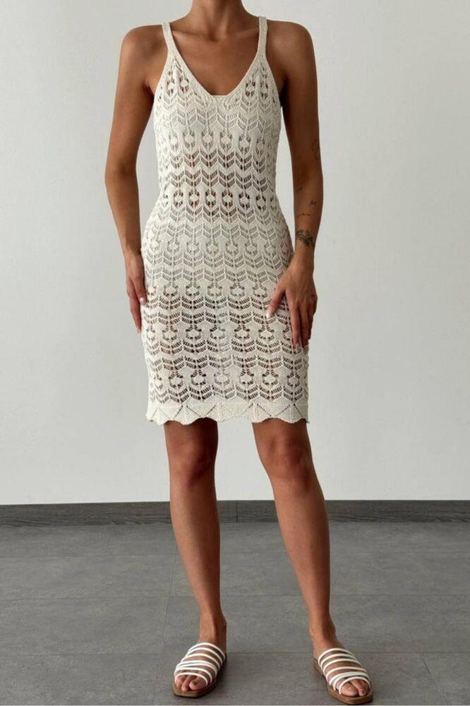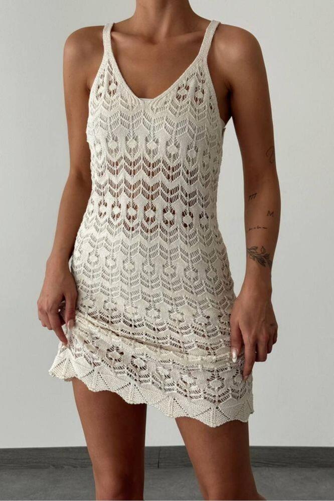 Kadın Ajurlu Askılı Krem Plaj Elbisesi