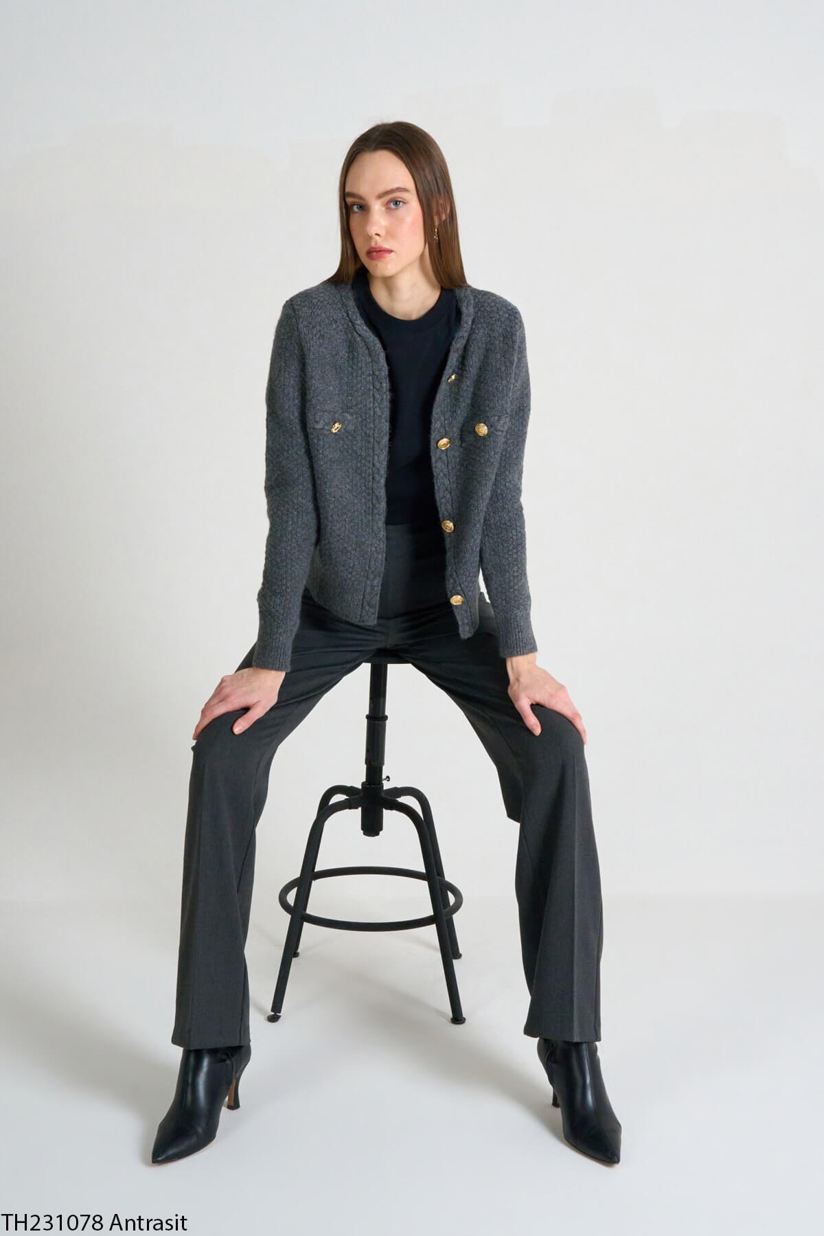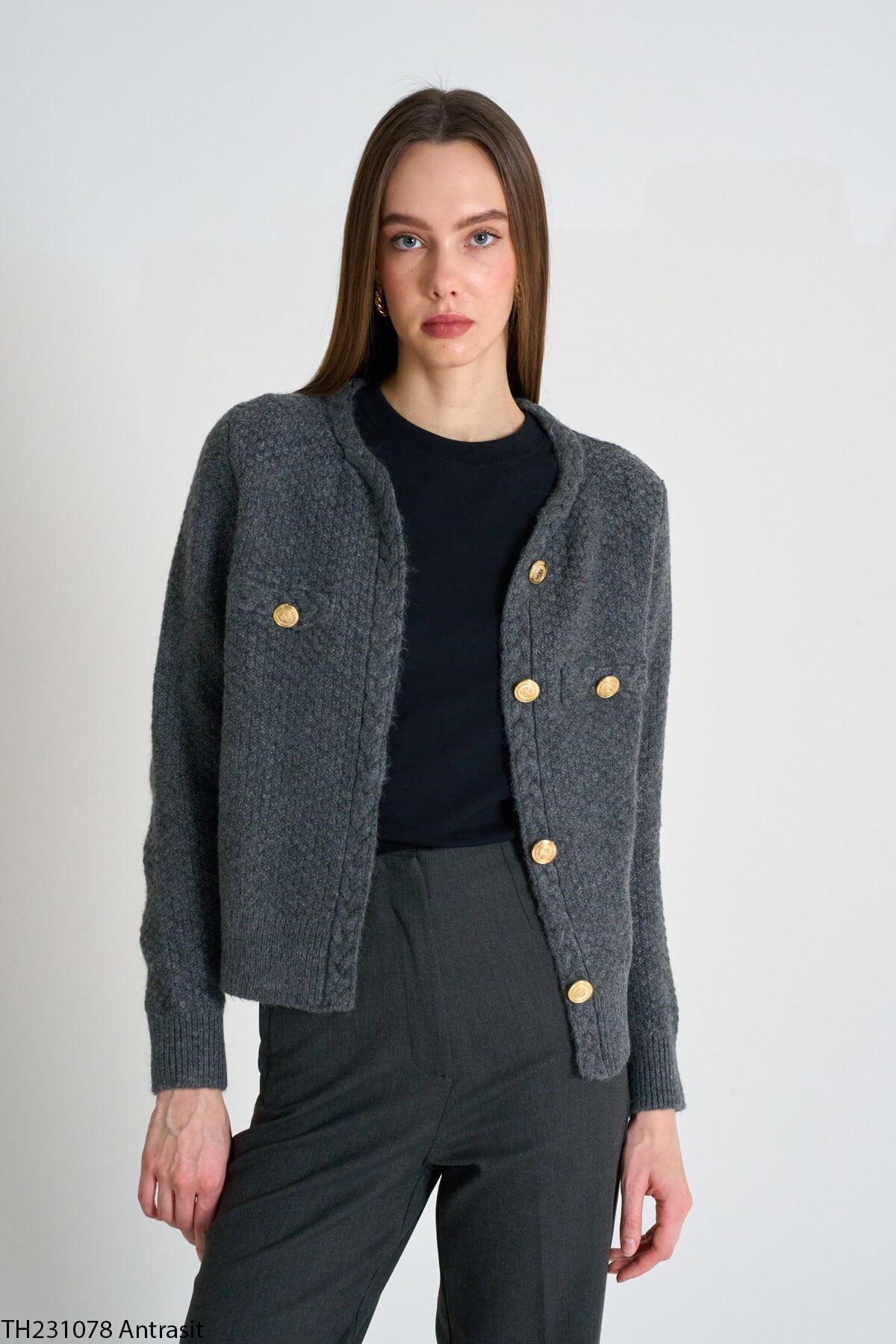 Kadın antrasit saç örgülü düğmeli triko hırka, klasik ve şık bir stile sahiptir.