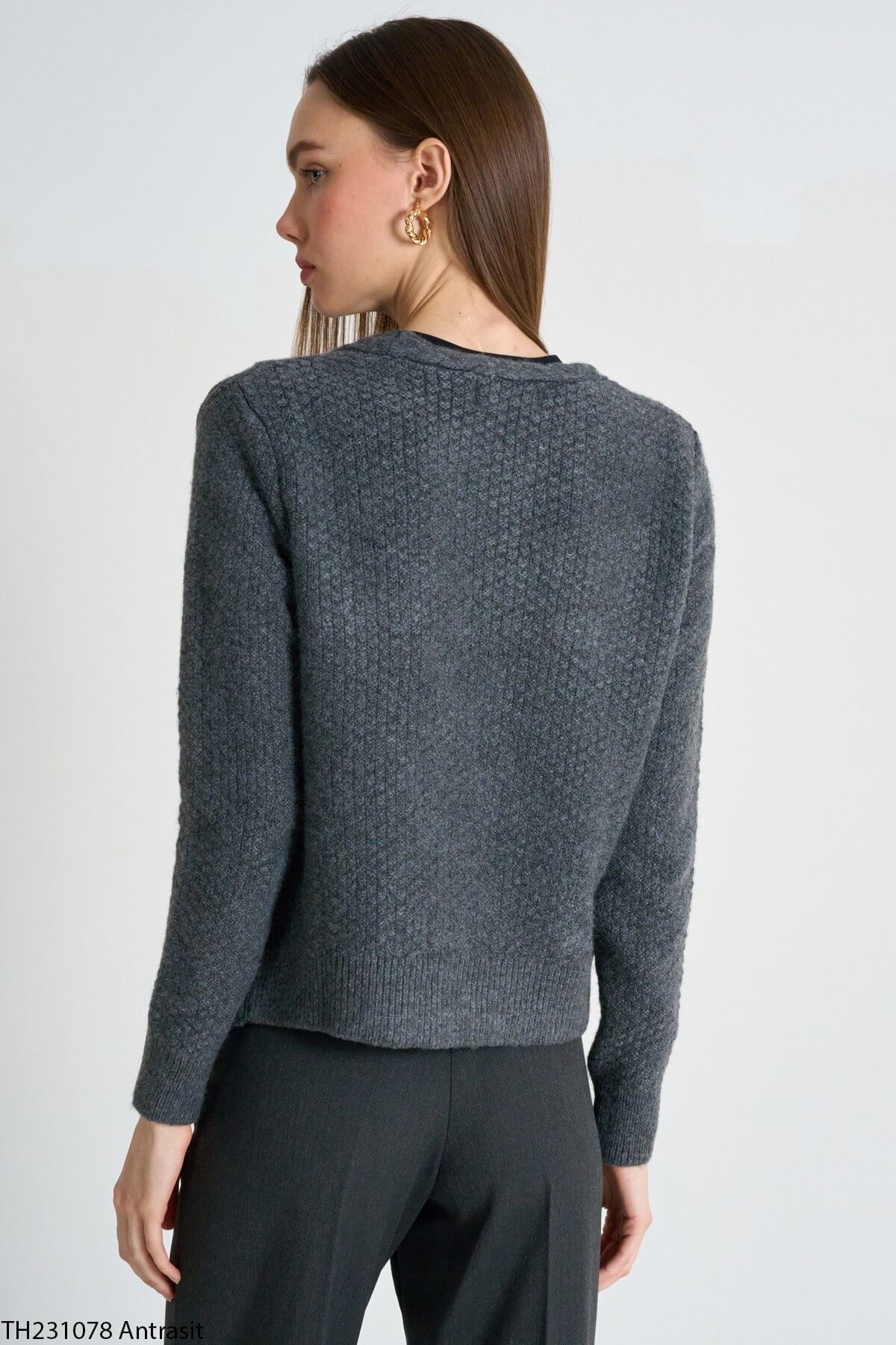Kadın Antrasit Saç Örgülü Düğmeli Triko Hırka