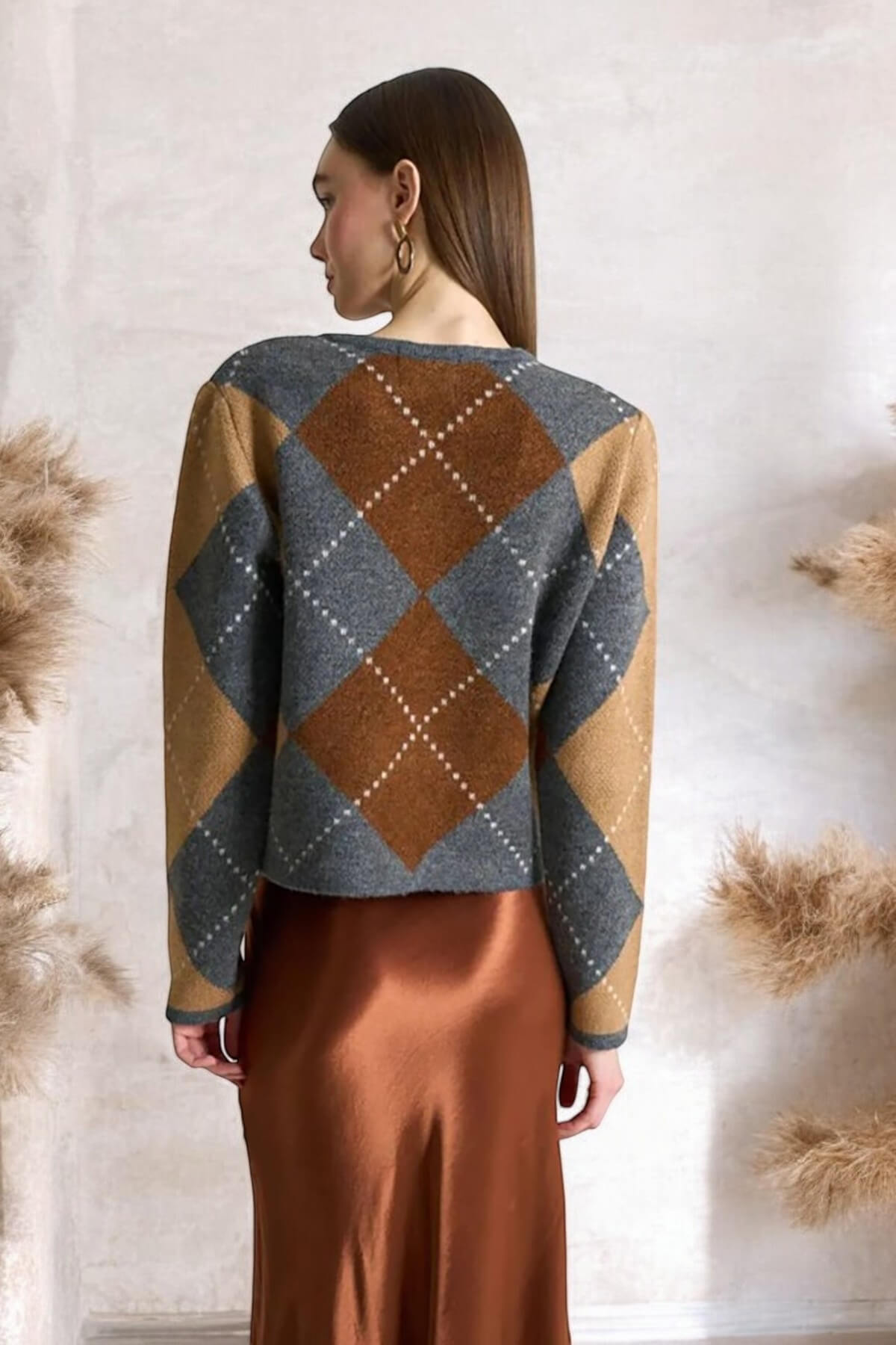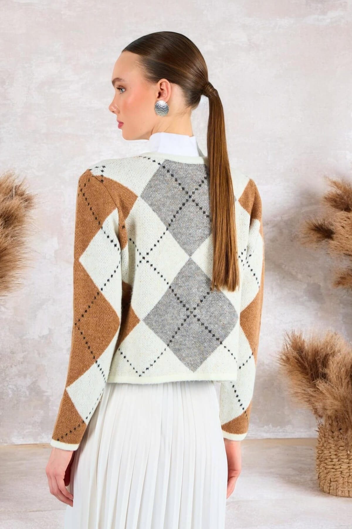 Kadın bisiklet yaka baklava desenli gold düğmeli hırka, zarif ve sofistike bir stile sahiptir.