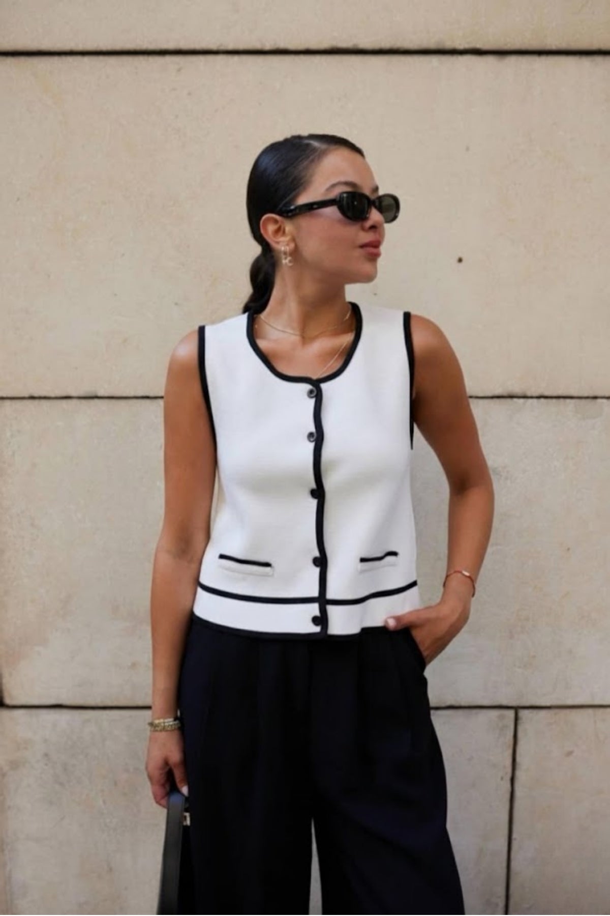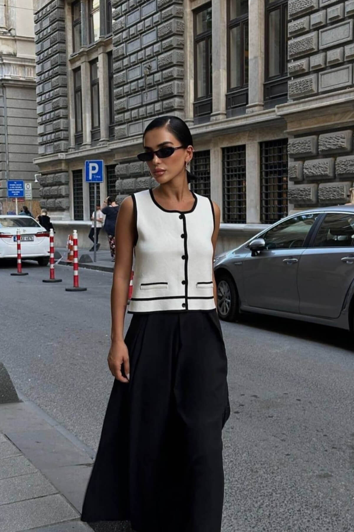 - Modern çizgileriyle öne çıkan bu çelik örme triko yelek, şerit detaylarıyla sportif ve şık bir duruş sunar.
