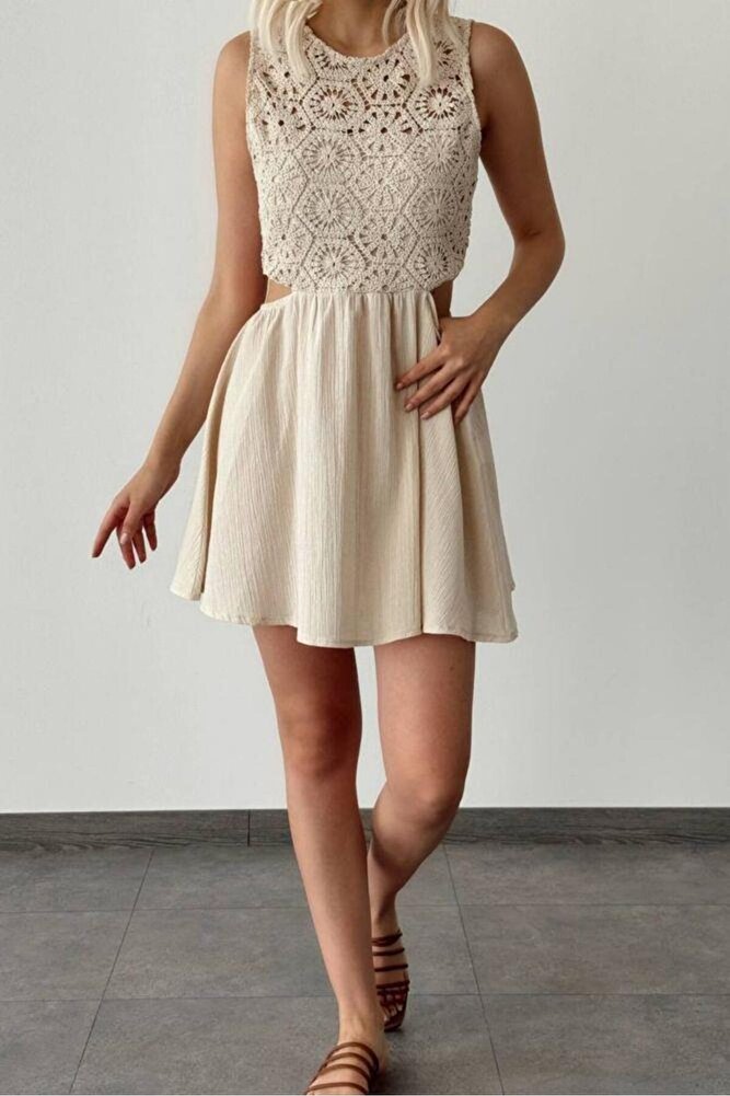 Kadın cut-out ajurlu fermuarlı %100 pamuk krem elbise, feminen ve modern bir stile sahiptir.