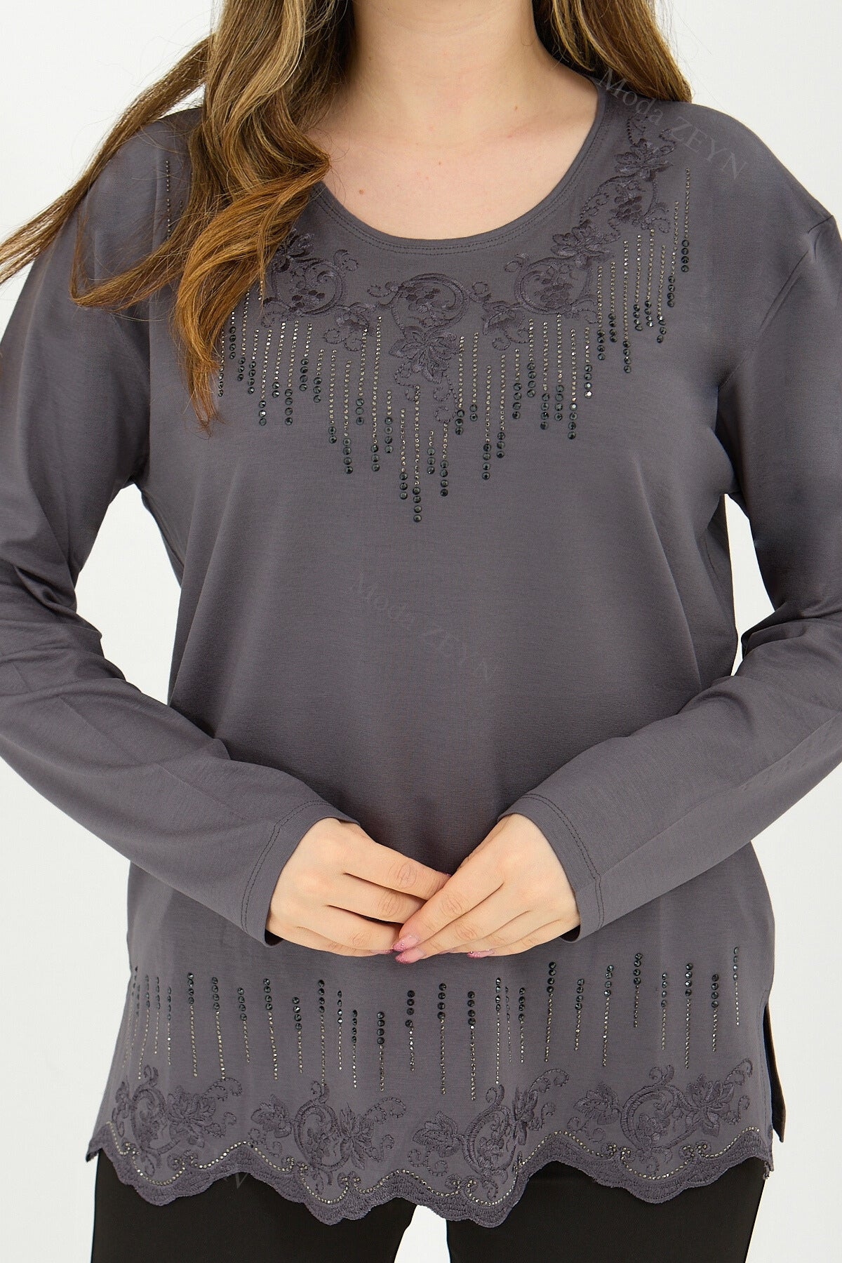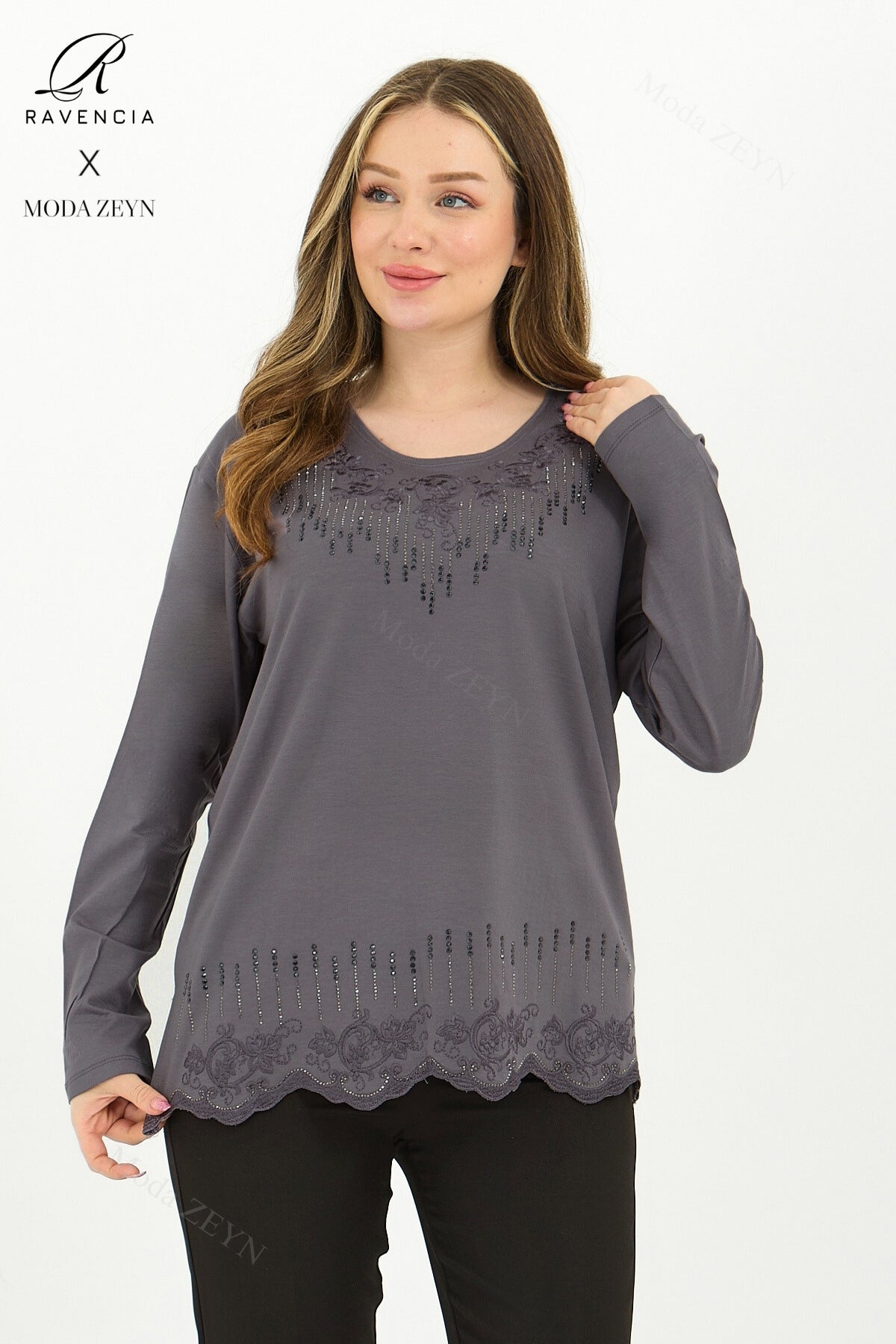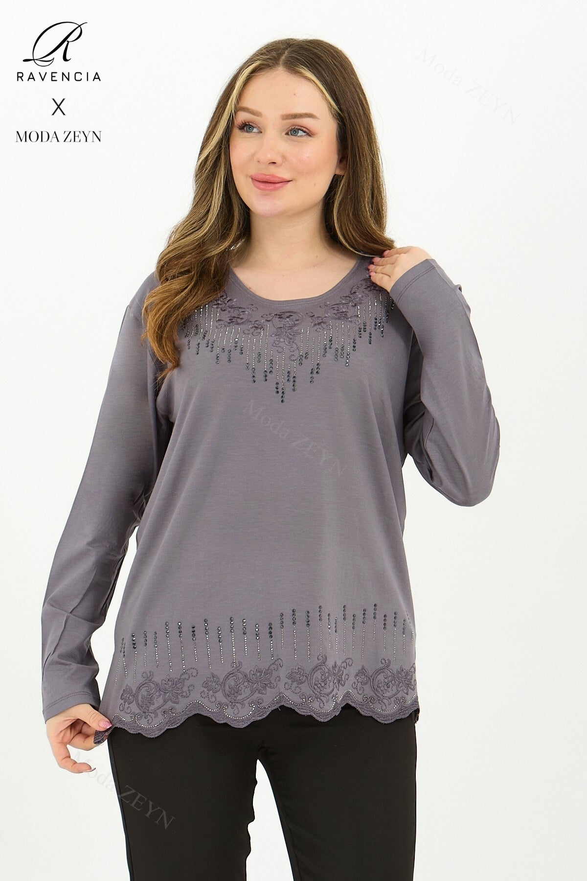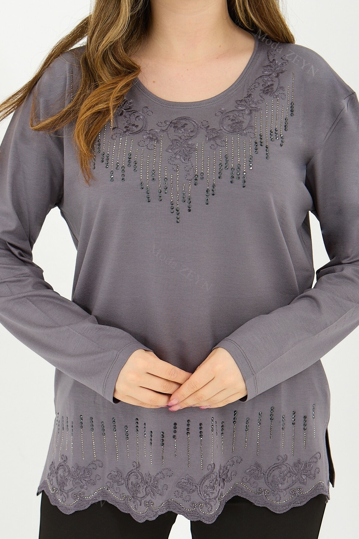 Gardırobunuzun en değerli parçası olmaya aday bu özel tasarım bluz, yüksek kaliteli viskon penye kumaşı ve göz alıcı taş işlemeleriyle şıklığı zahmetsizce yakalamanızı sağlar.
