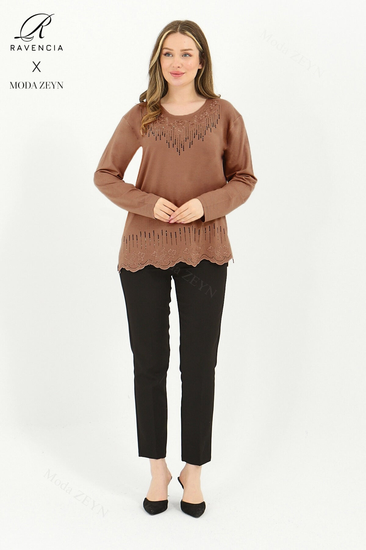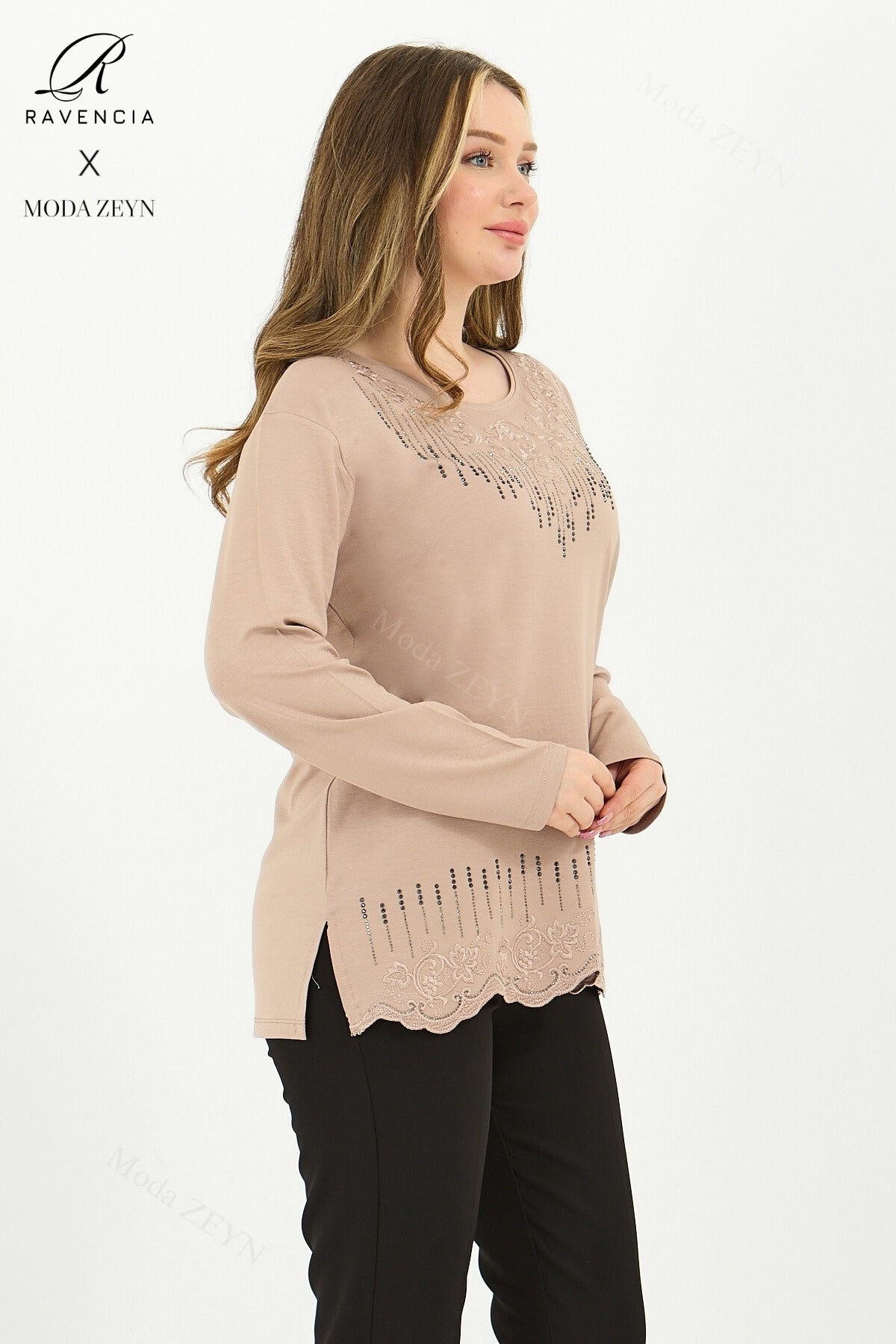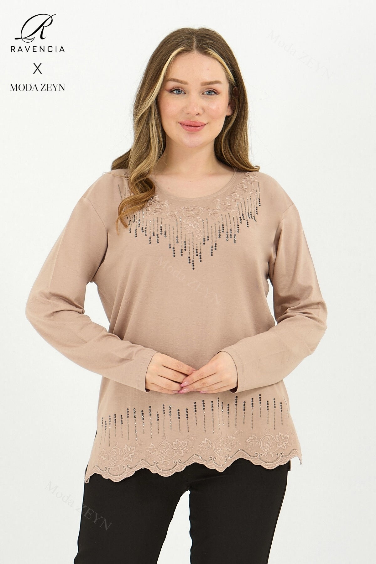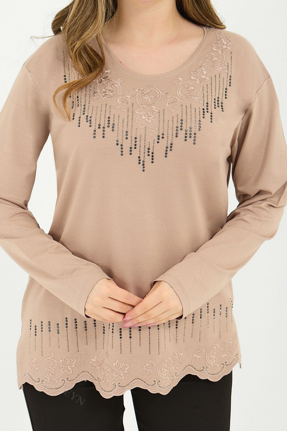 Gardırobunuzun en değerli parçası olmaya aday bu özel tasarım bluz, yüksek kaliteli viskon penye kumaşı ve göz alıcı taş işlemeleriyle şıklığı zahmetsizce yakalamanızı sağlar.