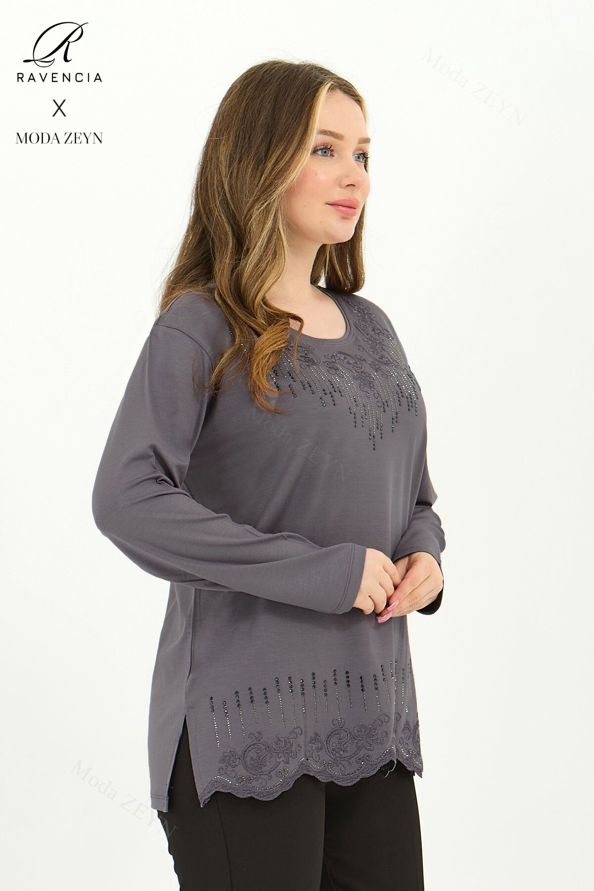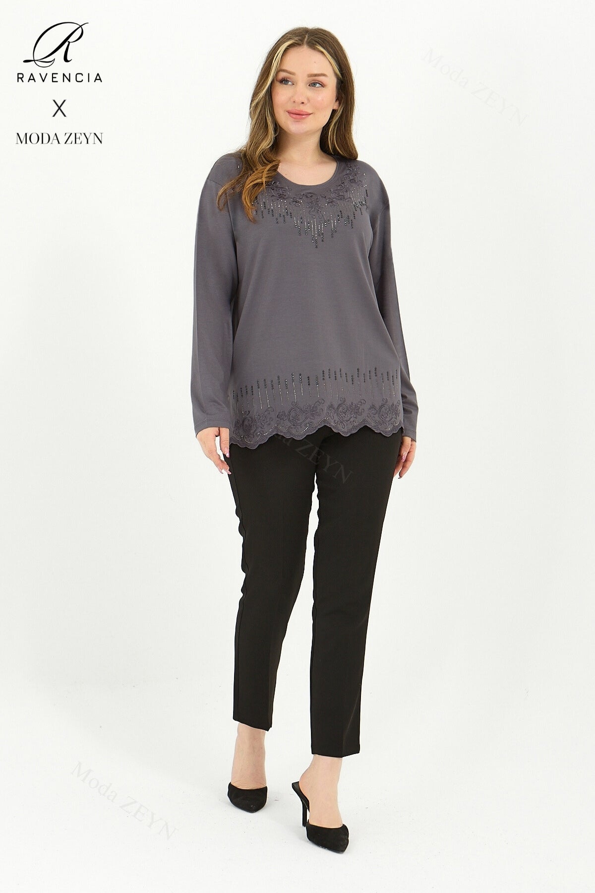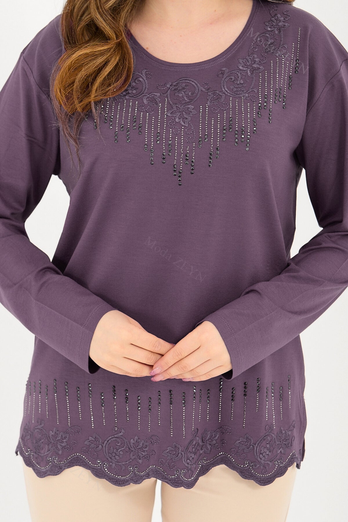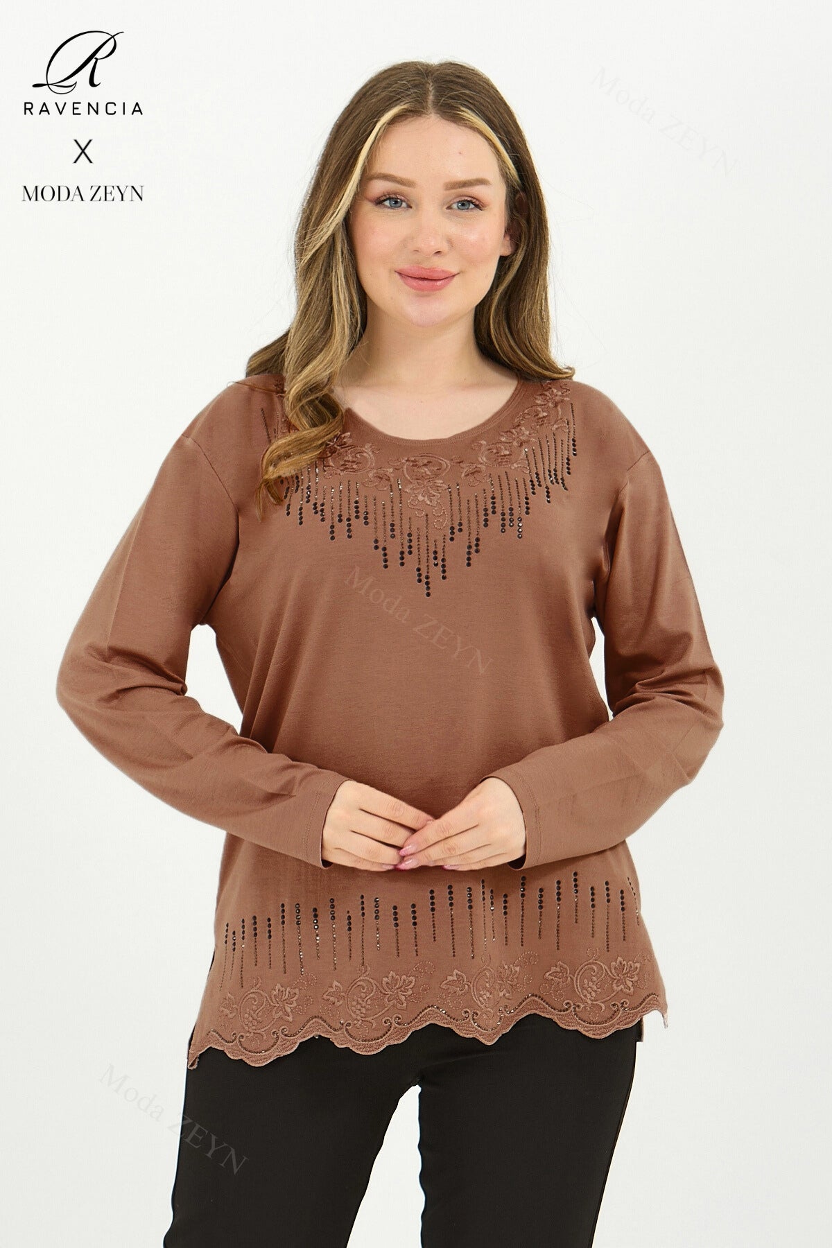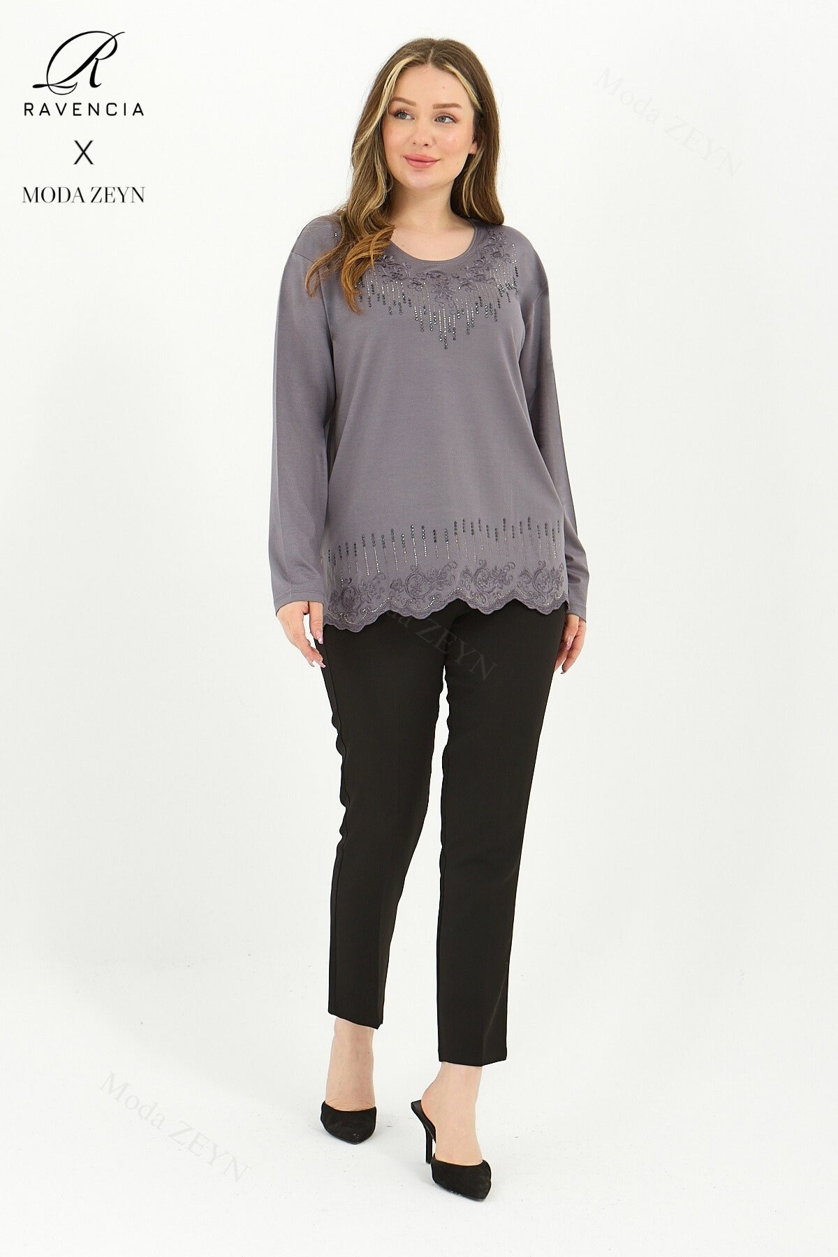 Gardırobunuzun en değerli parçası olmaya aday bu özel tasarım bluz, yüksek kaliteli viskon penye kumaşı ve göz alıcı taş işlemeleriyle şıklığı zahmetsizce yakalamanızı sağlar.
