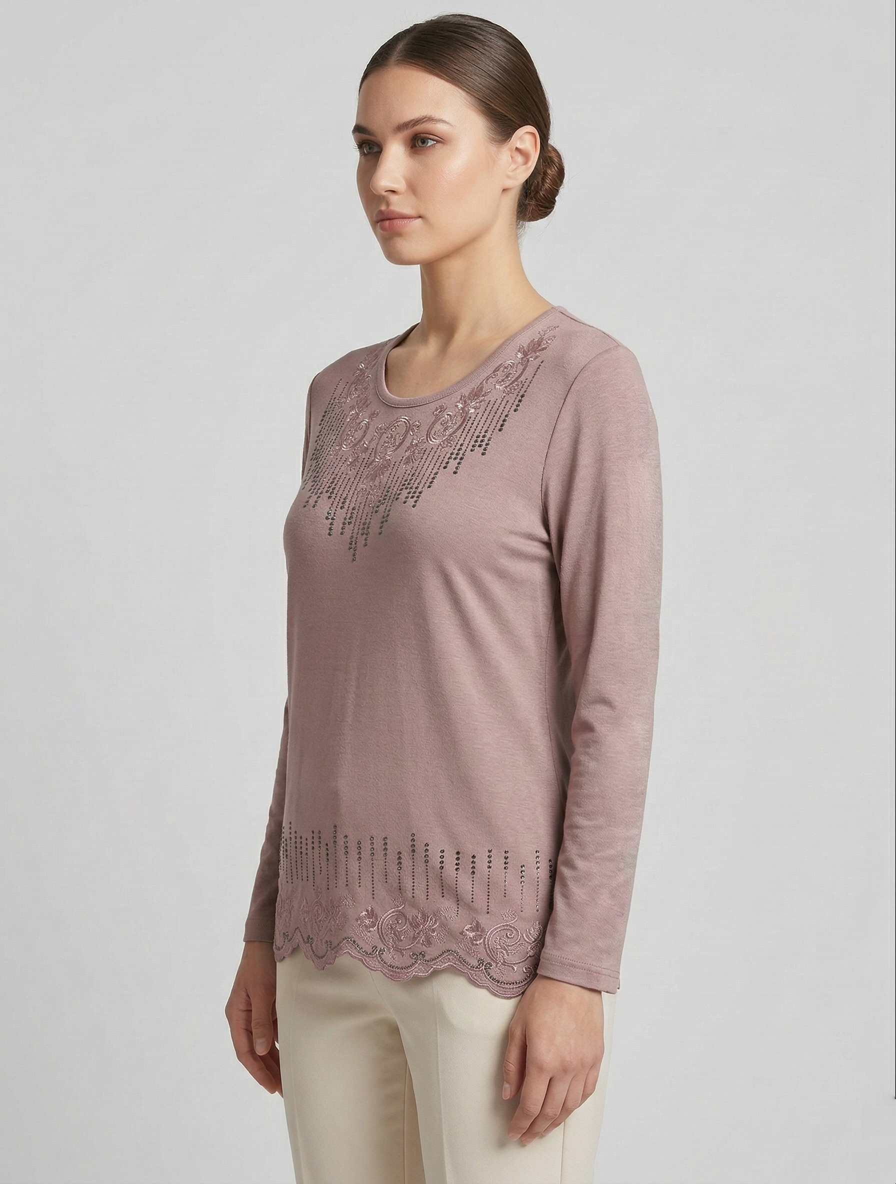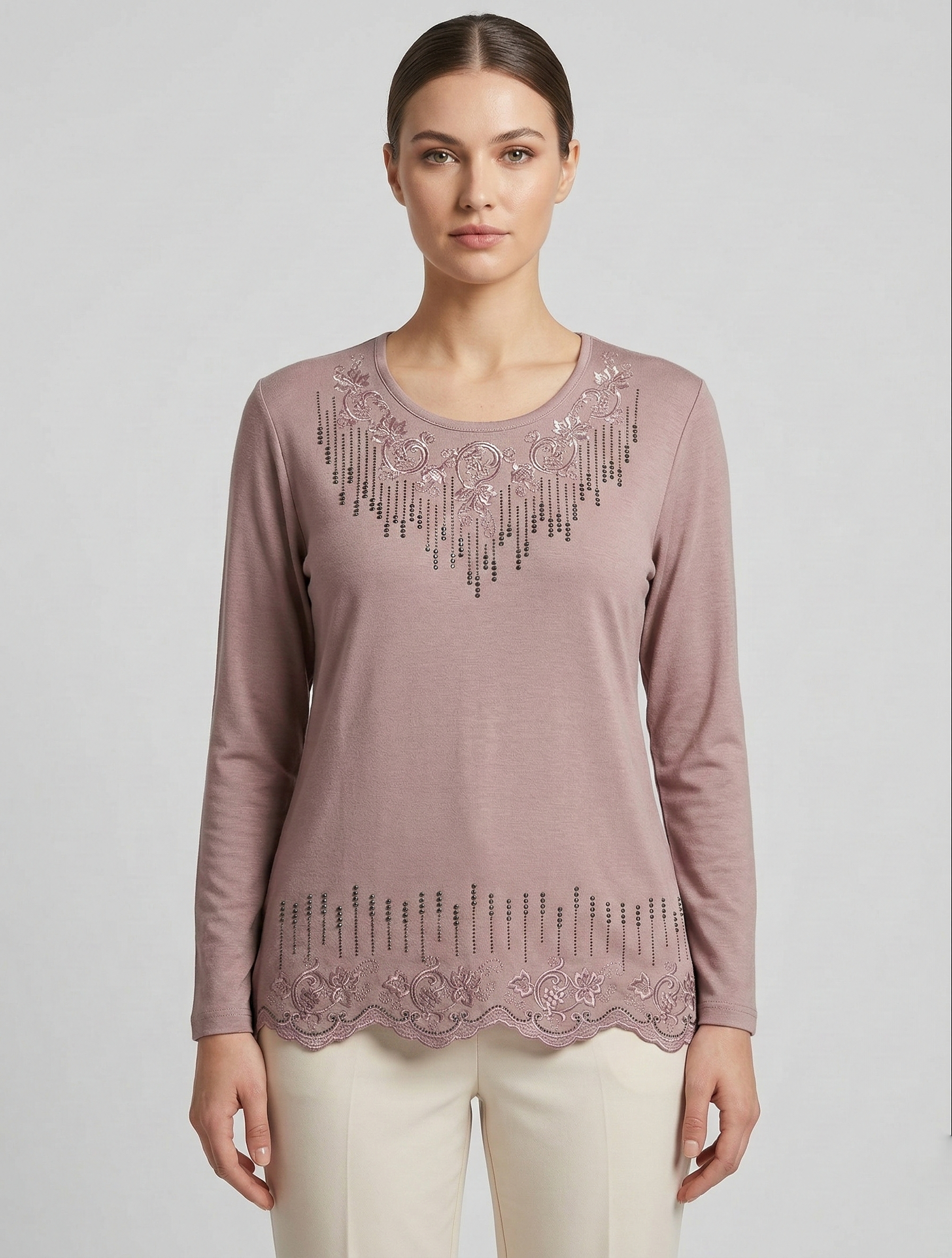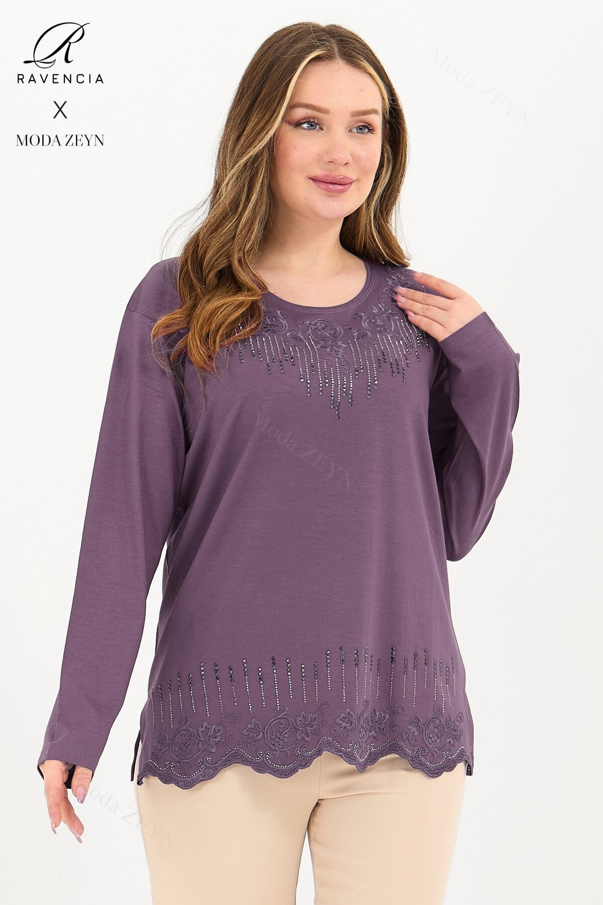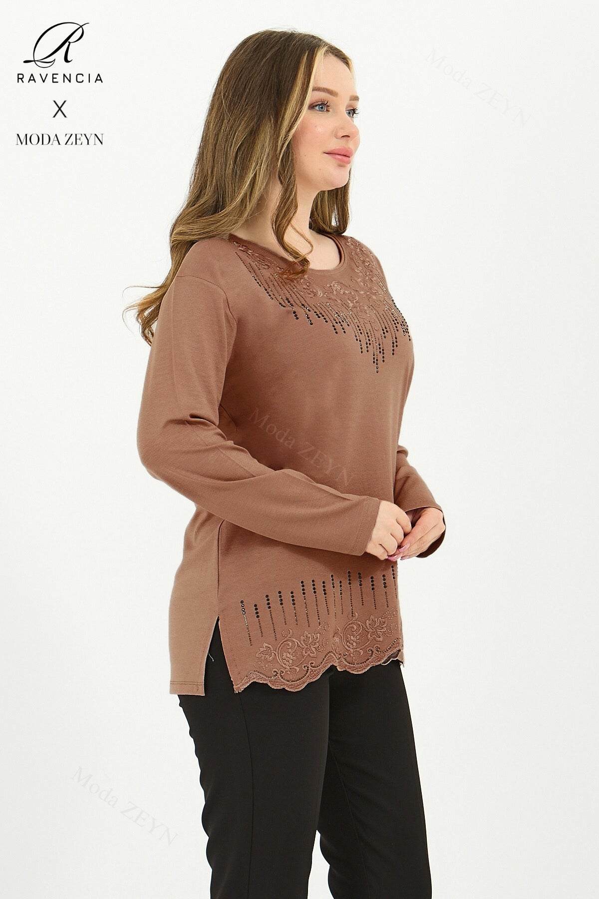 Gardırobunuzun en değerli parçası olmaya aday bu özel tasarım bluz, yüksek kaliteli viskon penye kumaşı ve göz alıcı taş işlemeleriyle şıklığı zahmetsizce yakalamanızı sağlar.