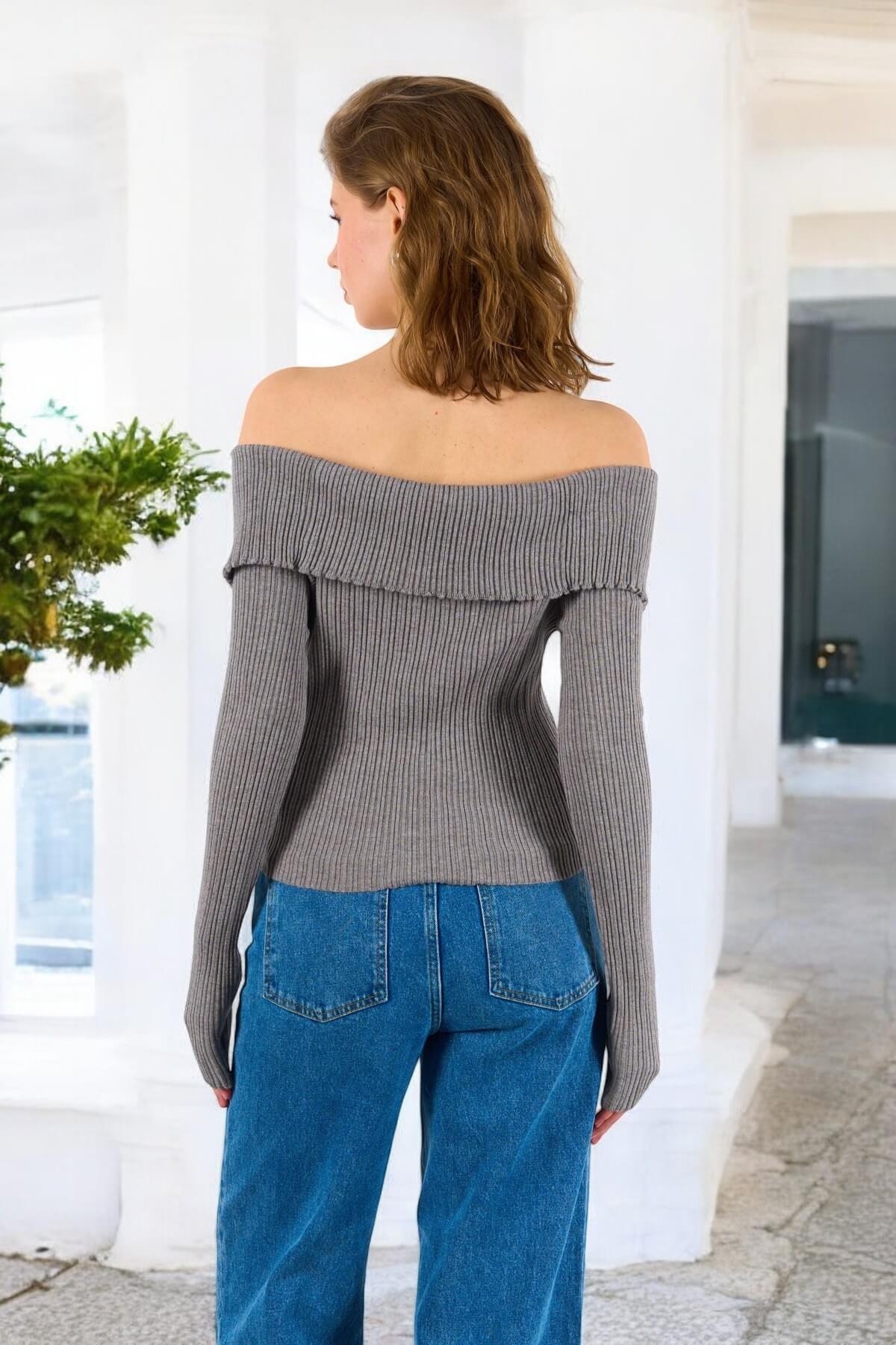 Kadın Degaje Yaka Açık Omuz Düğmeli Mevsimlik Triko Bluz