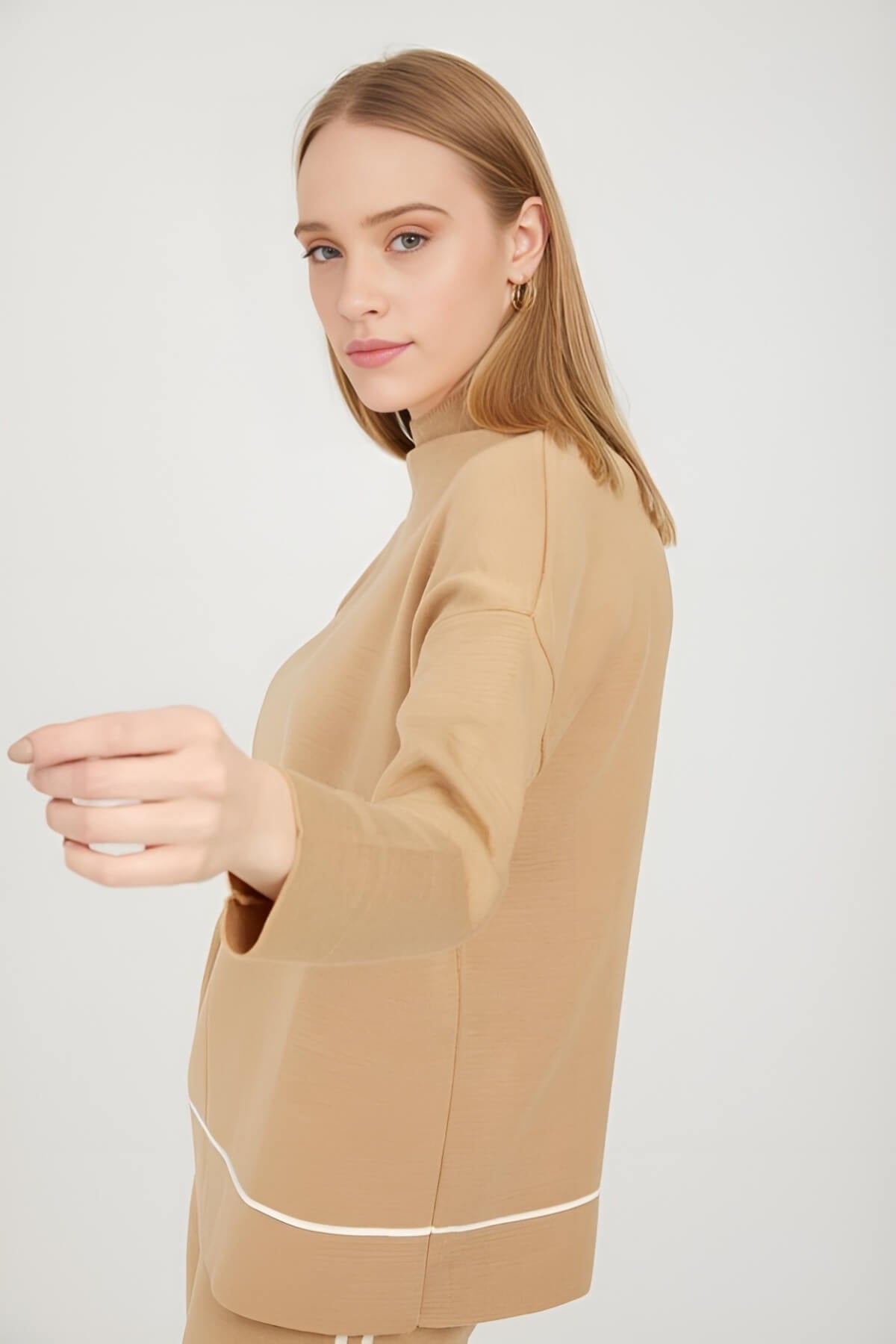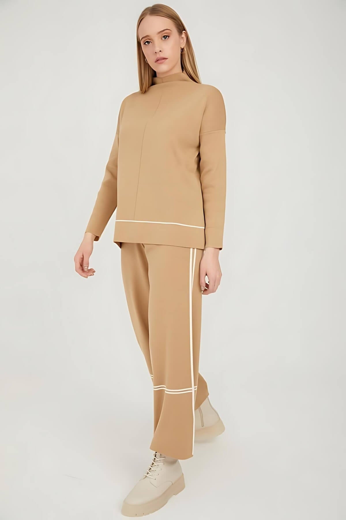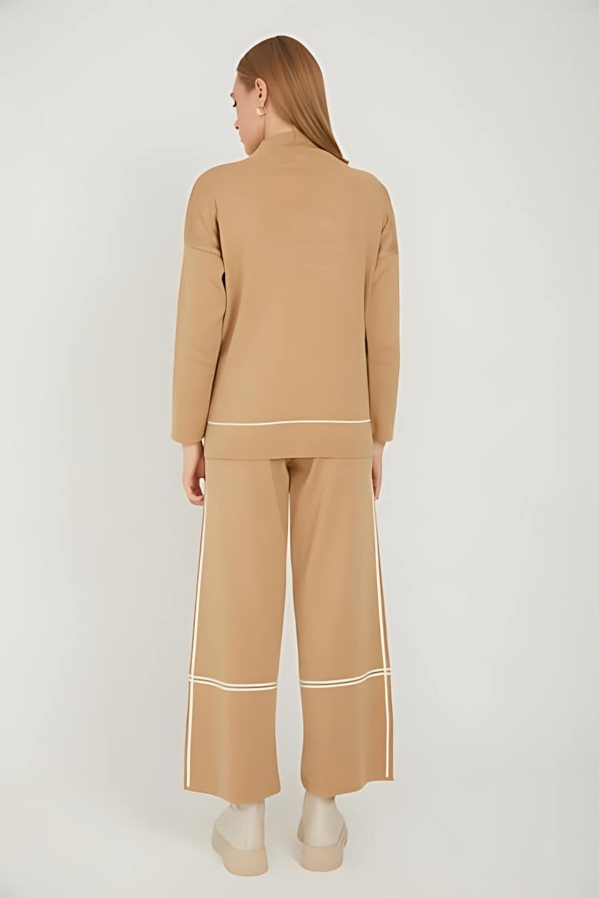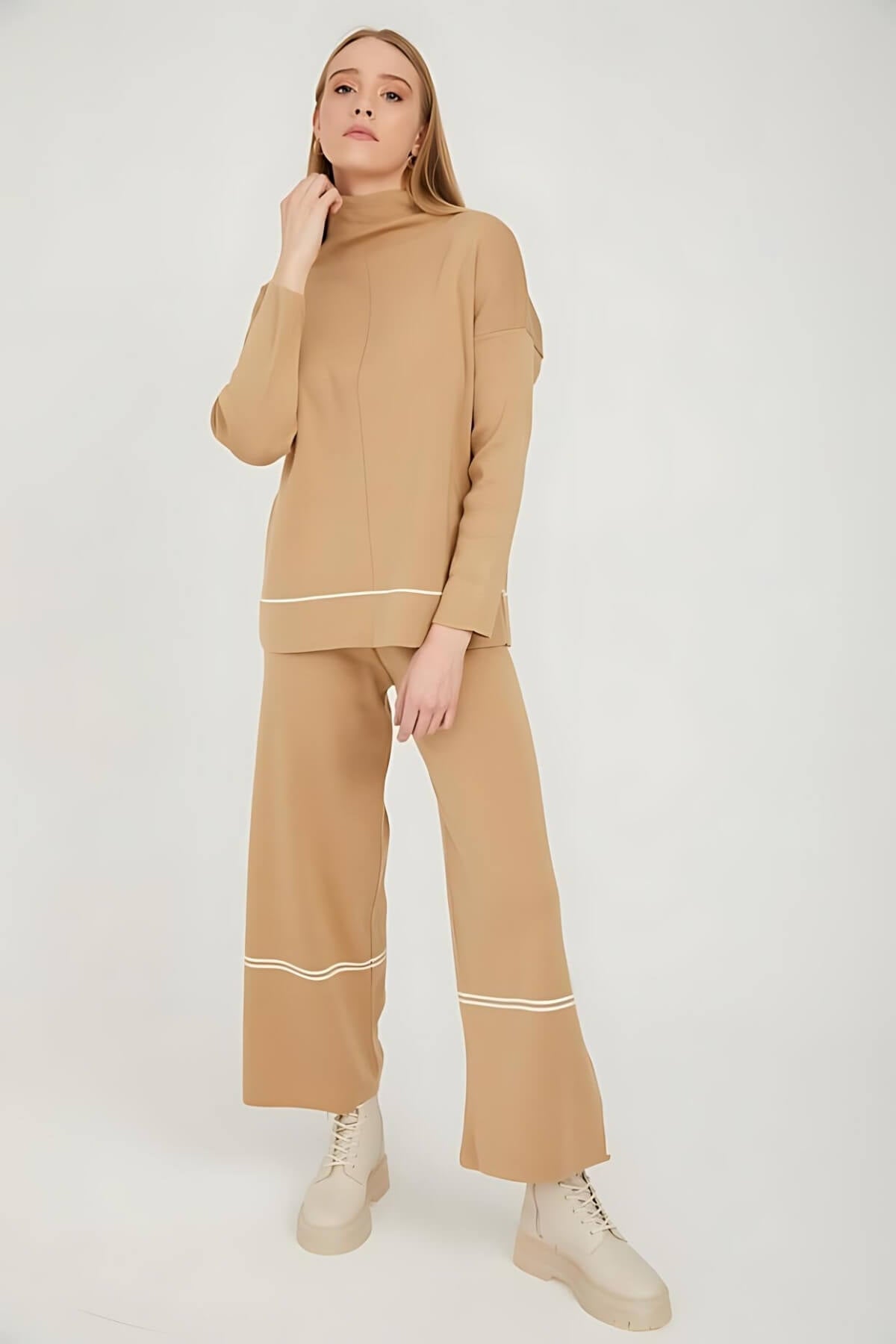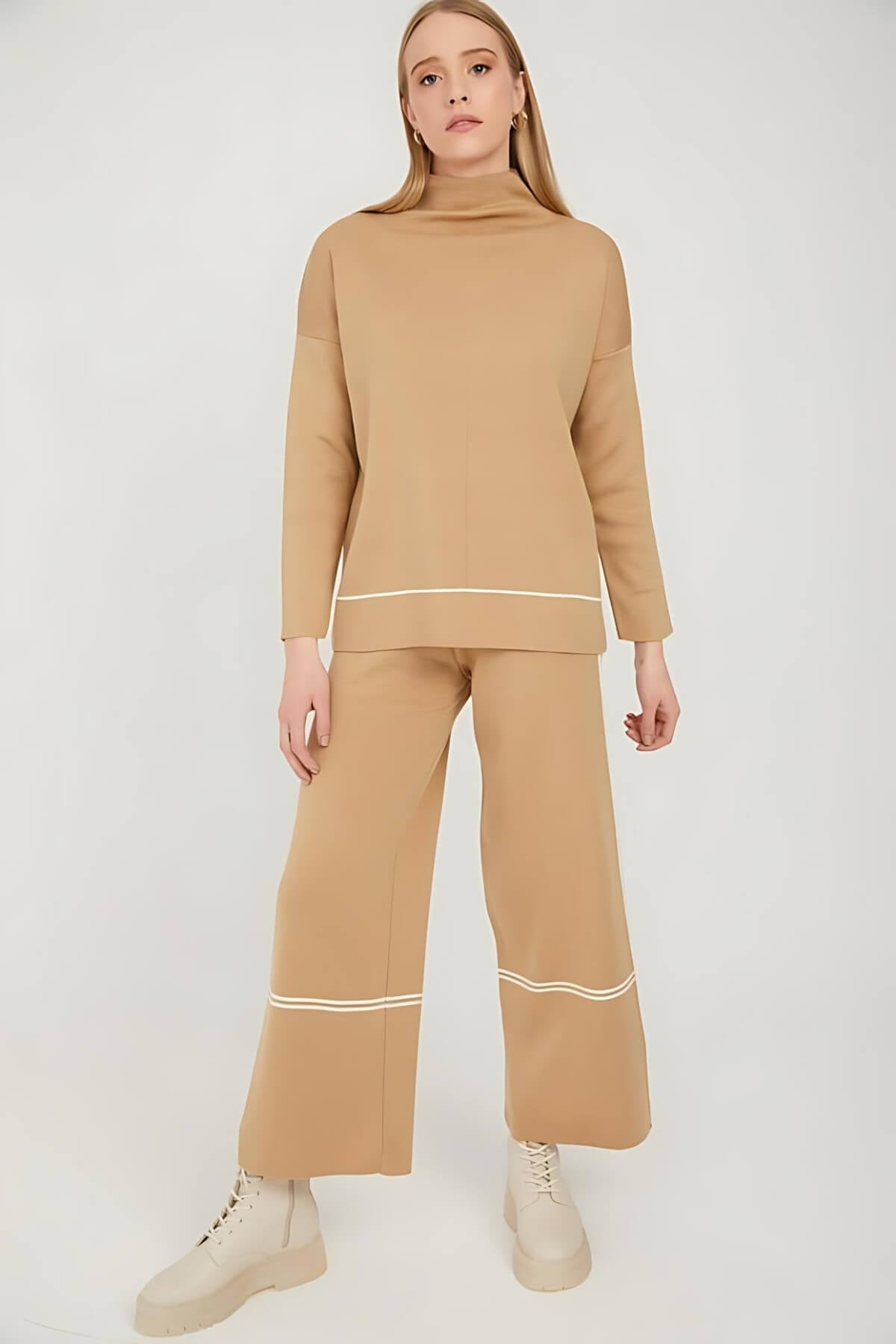 Kadın Dik Yaka Triko Şerit detaylı Kazak- Palazzo Pantolon Takım
