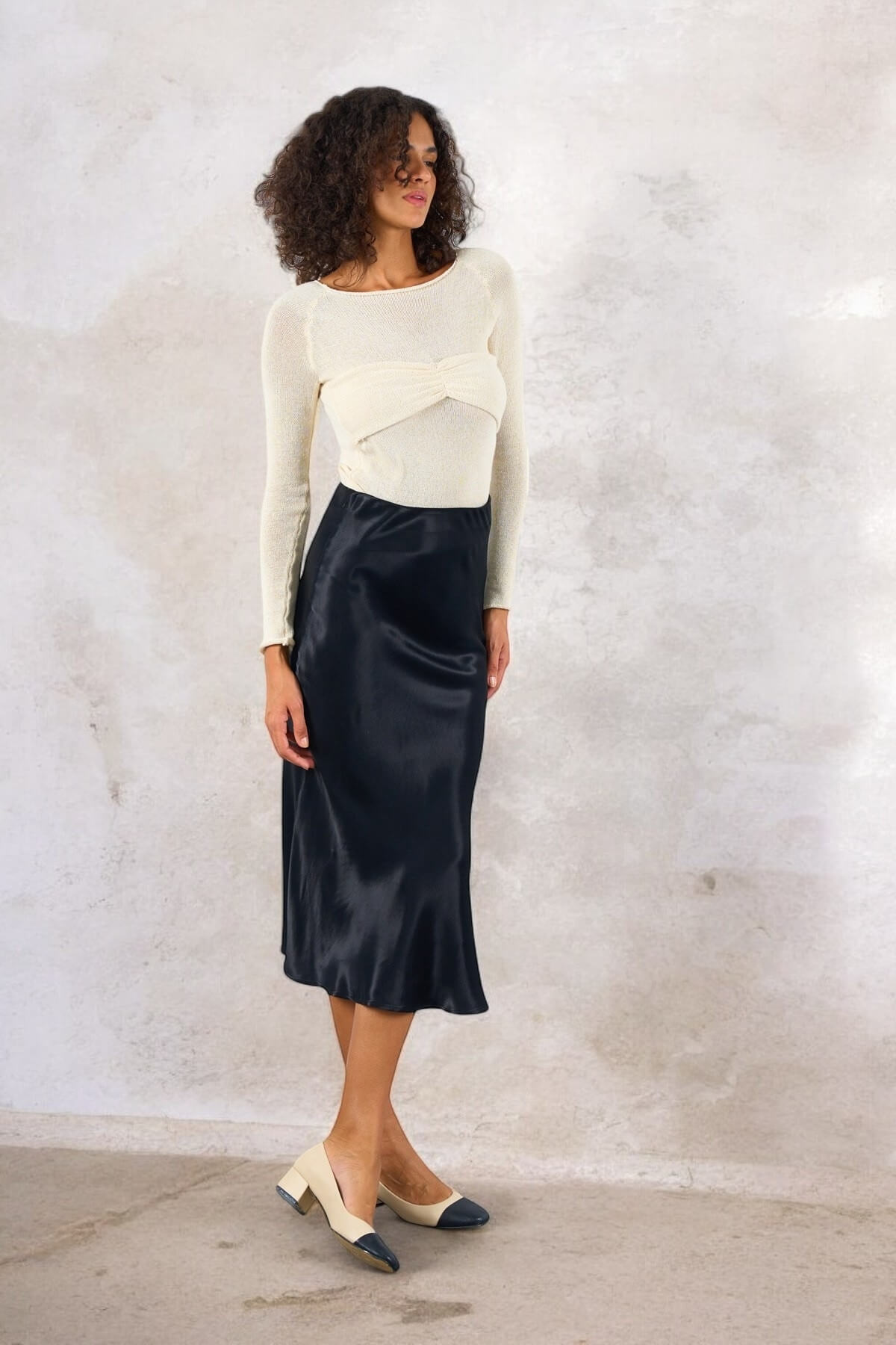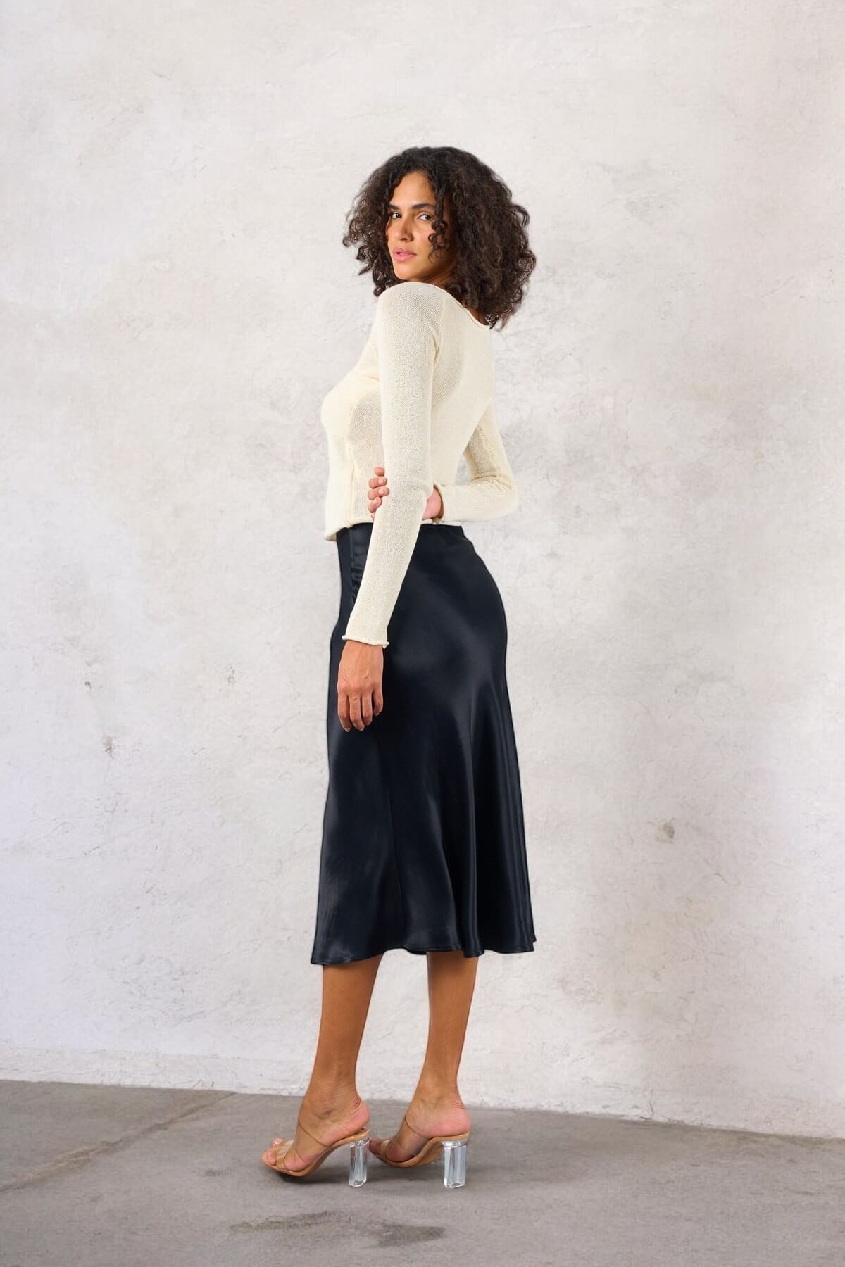 Kadın düz yüksek bel midi boy saten siyah etek, zarif ve feminen bir stile sahiptir.