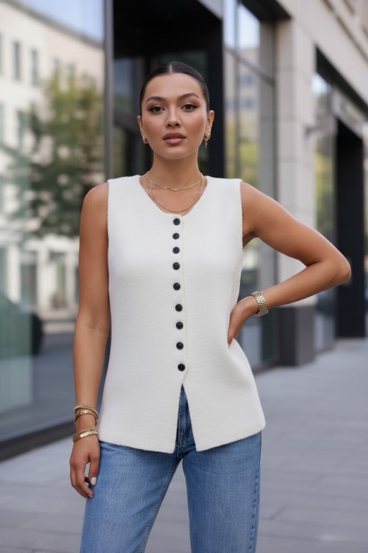 Yumuşak triko dokusuyla konfor sunan bu ekru yelek, düğme detayıyla zarif ve modern bir görünüm kazandırır.