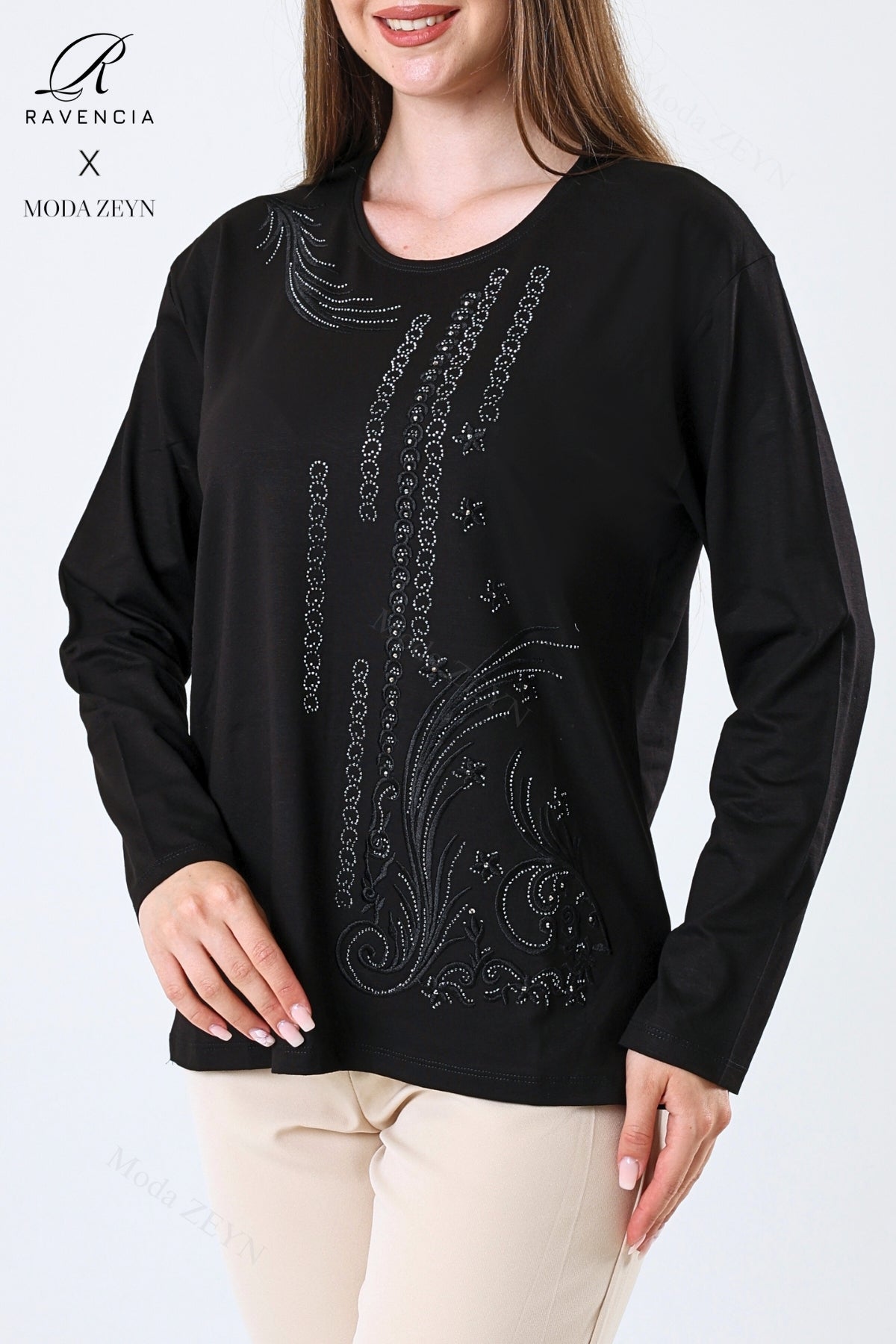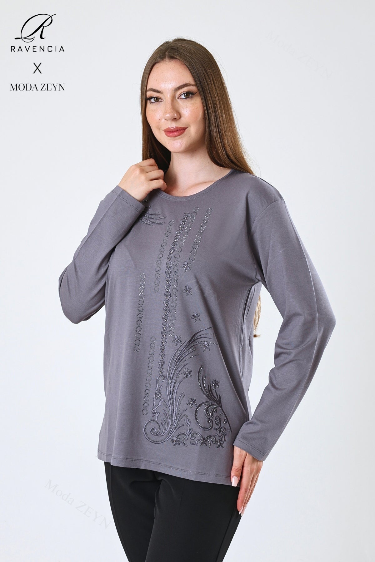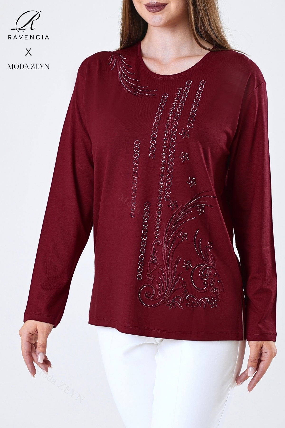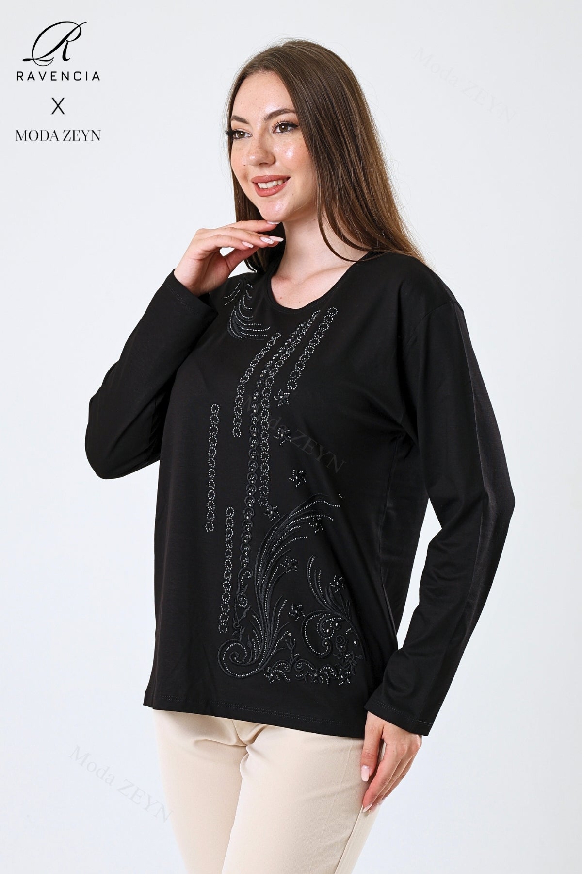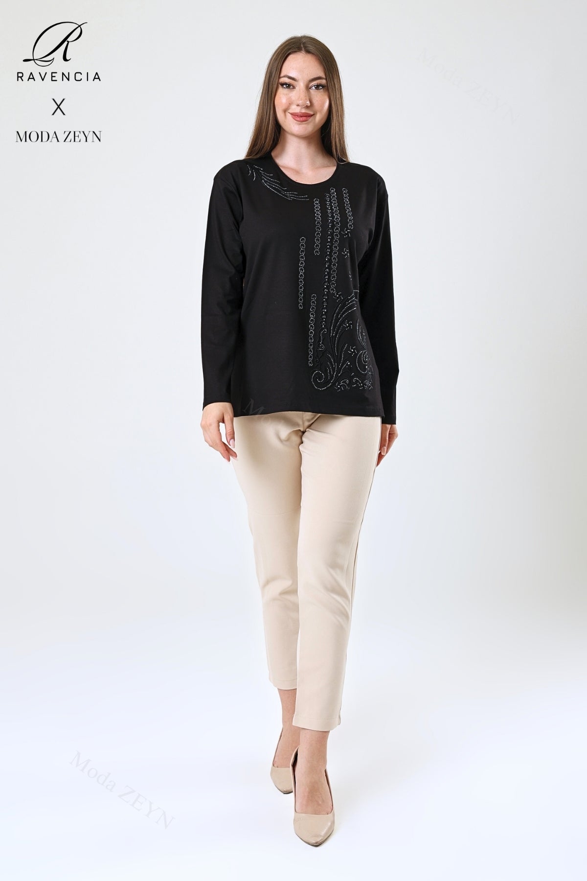 Gardırobunuzun en değerli parçası olmaya aday bu özel tasarım bluz, yüksek kaliteli viskon penye kumaşı ve göz alıcı taş işlemeleriyle şıklığı zahmetsizce yakalamanızı sağlar.