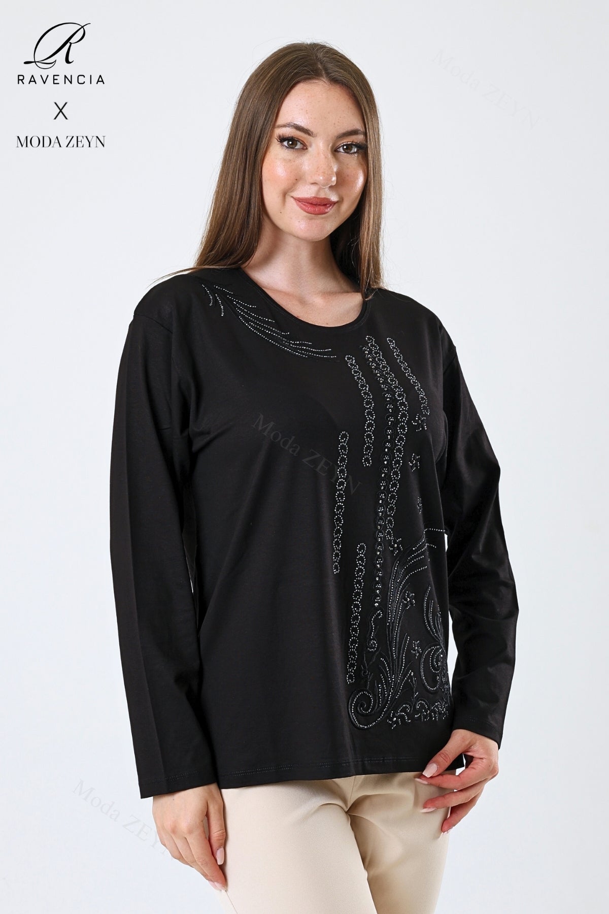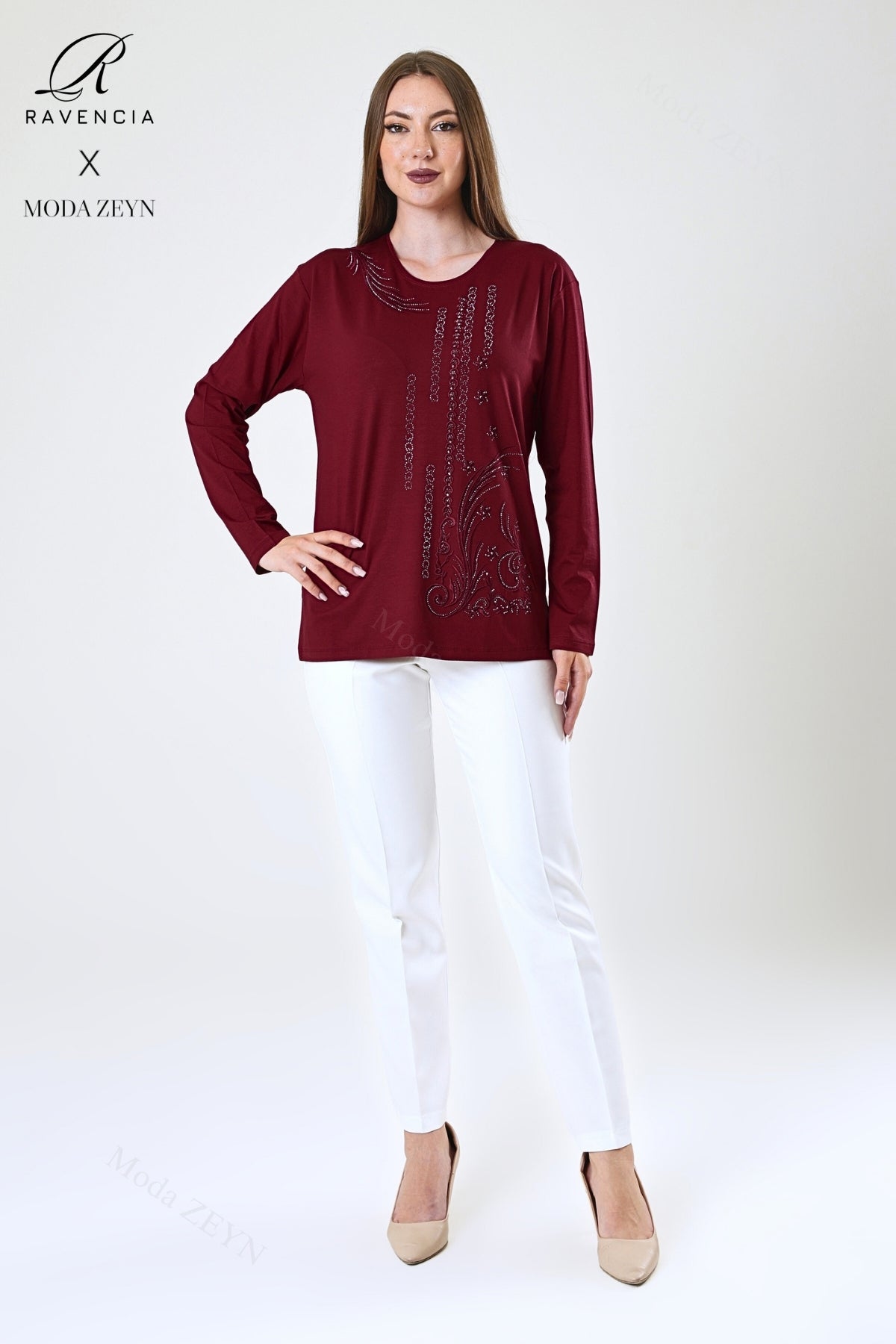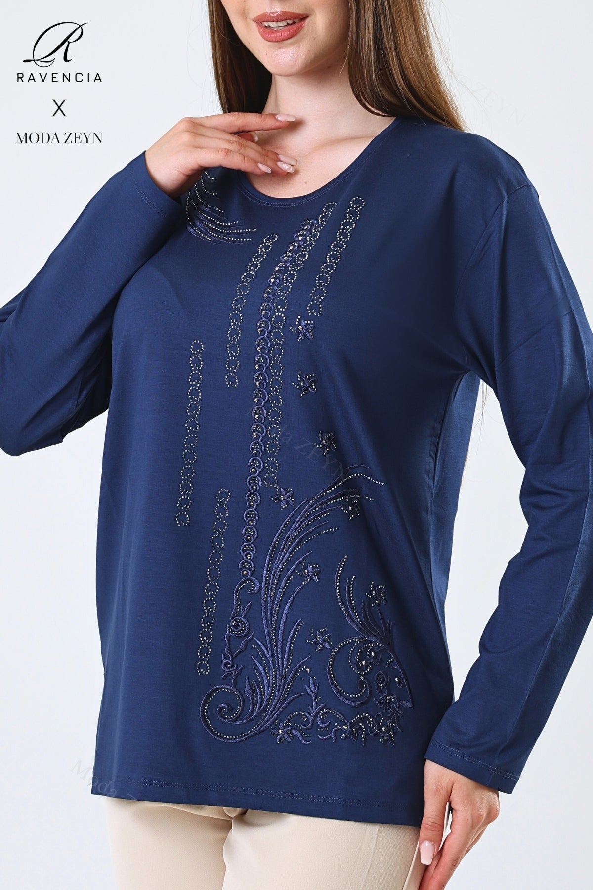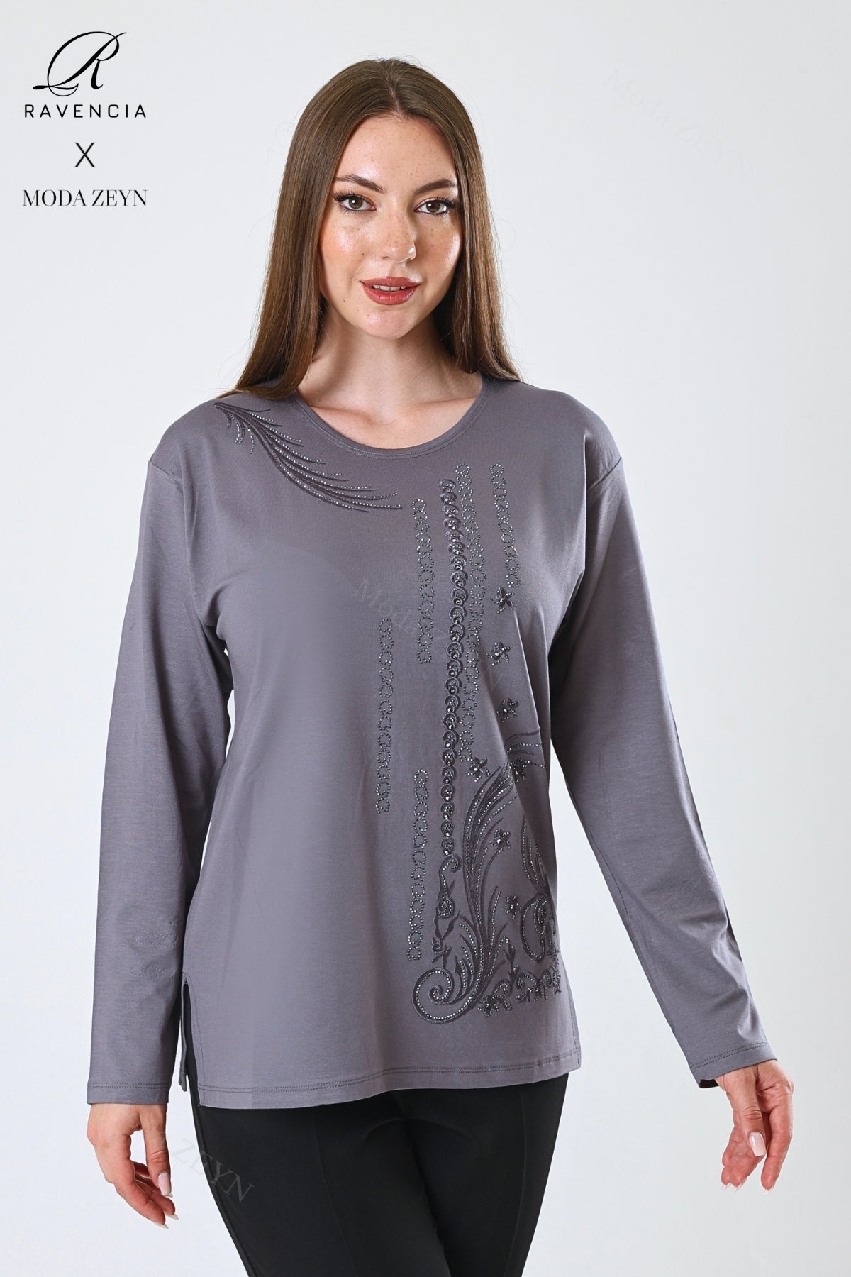 Gardırobunuzun en değerli parçası olmaya aday bu özel tasarım bluz, yüksek kaliteli viskon penye kumaşı ve göz alıcı taş işlemeleriyle şıklığı zahmetsizce yakalamanızı sağlar.