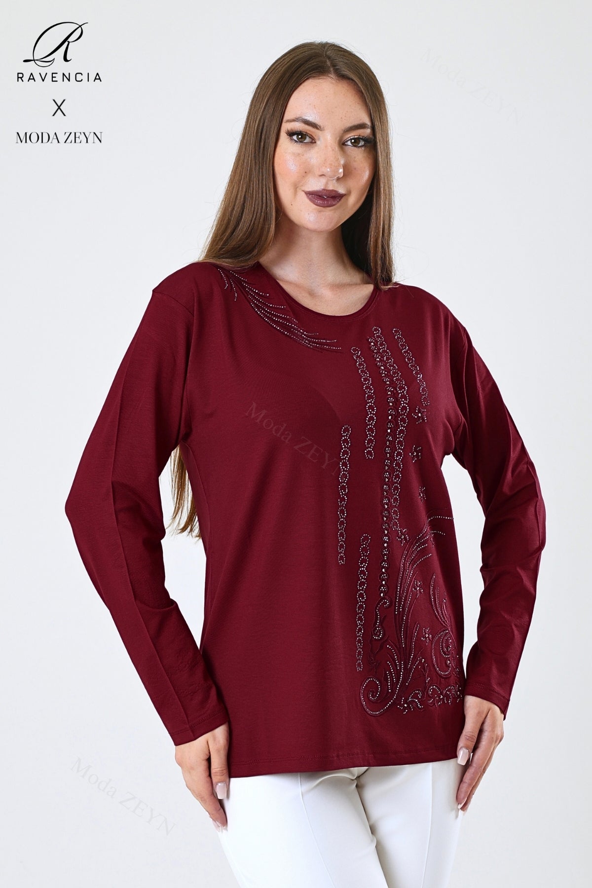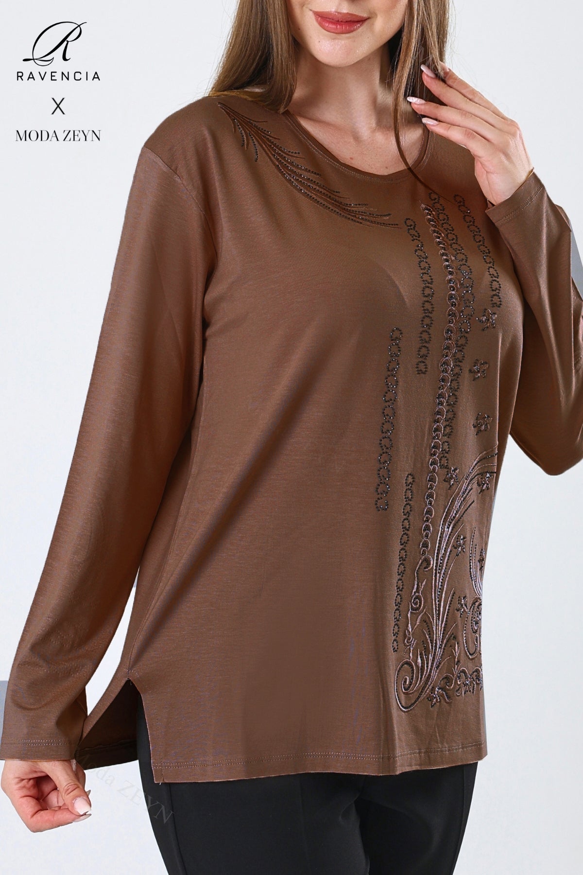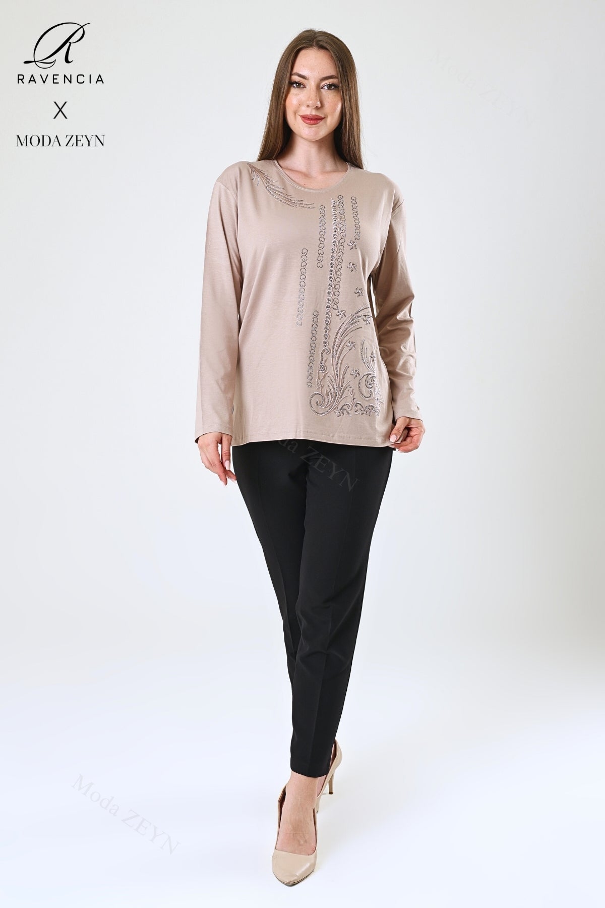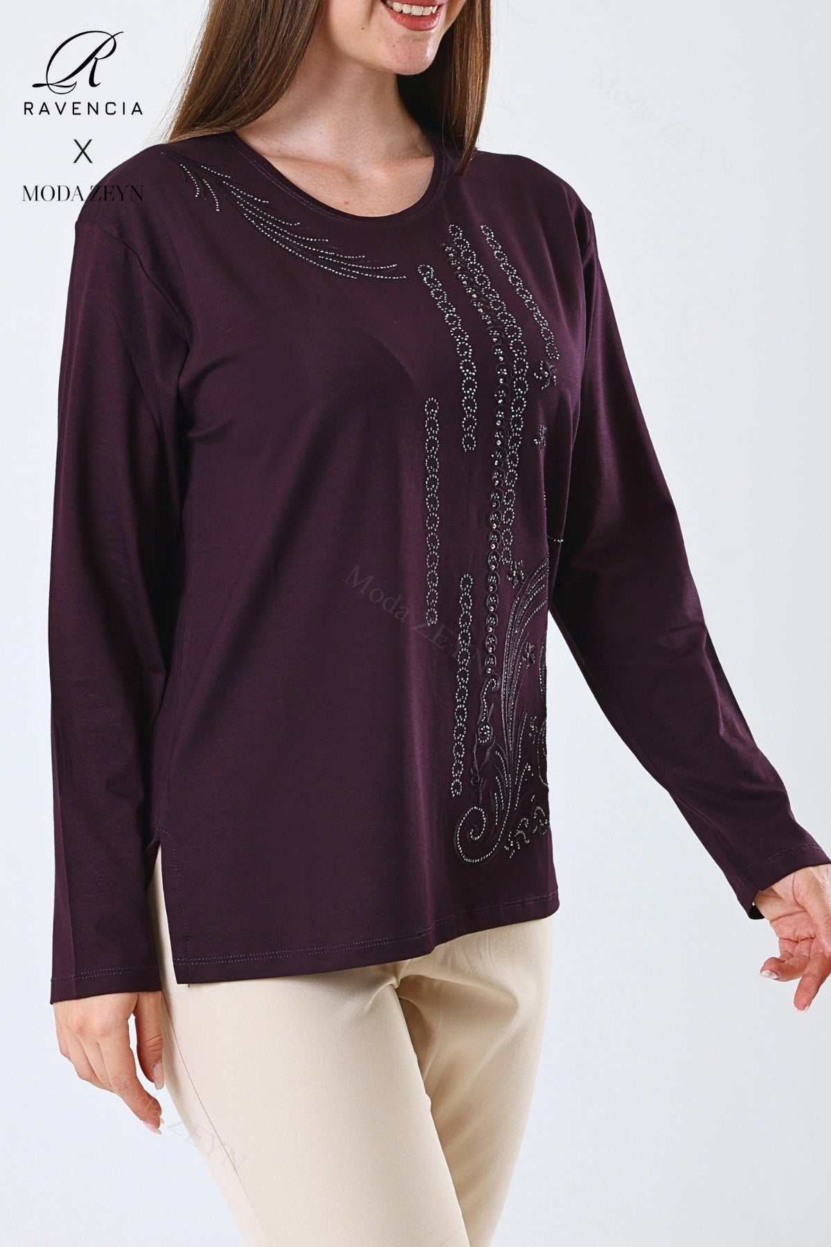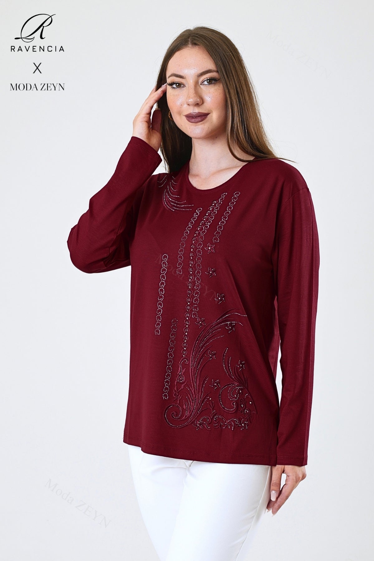 Gardırobunuzun en değerli parçası olmaya aday bu özel tasarım bluz, yüksek kaliteli viskon penye kumaşı ve göz alıcı taş işlemeleriyle şıklığı zahmetsizce yakalamanızı sağlar.