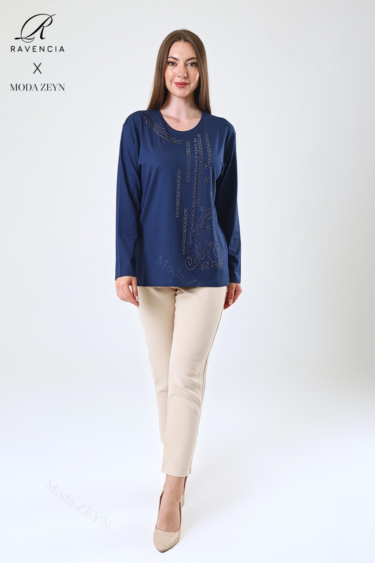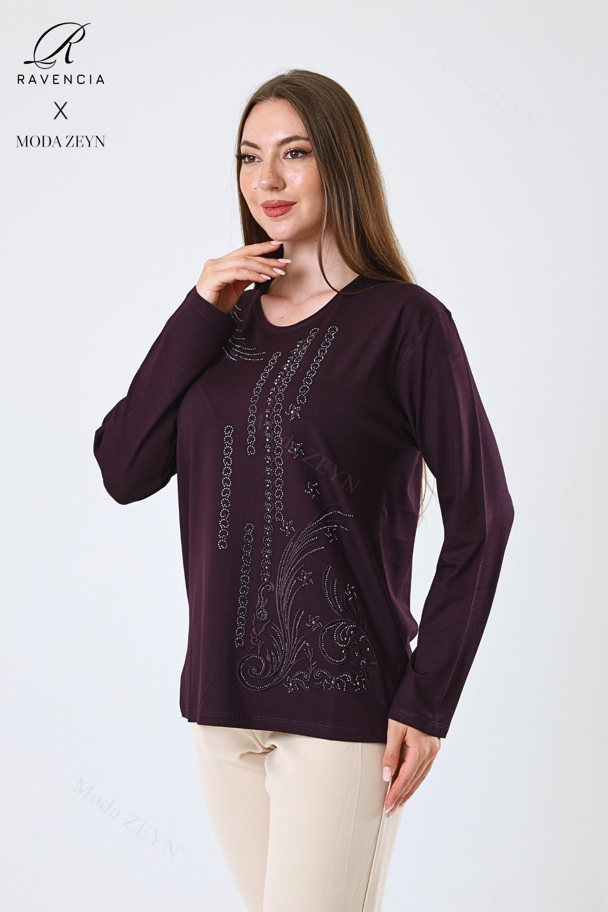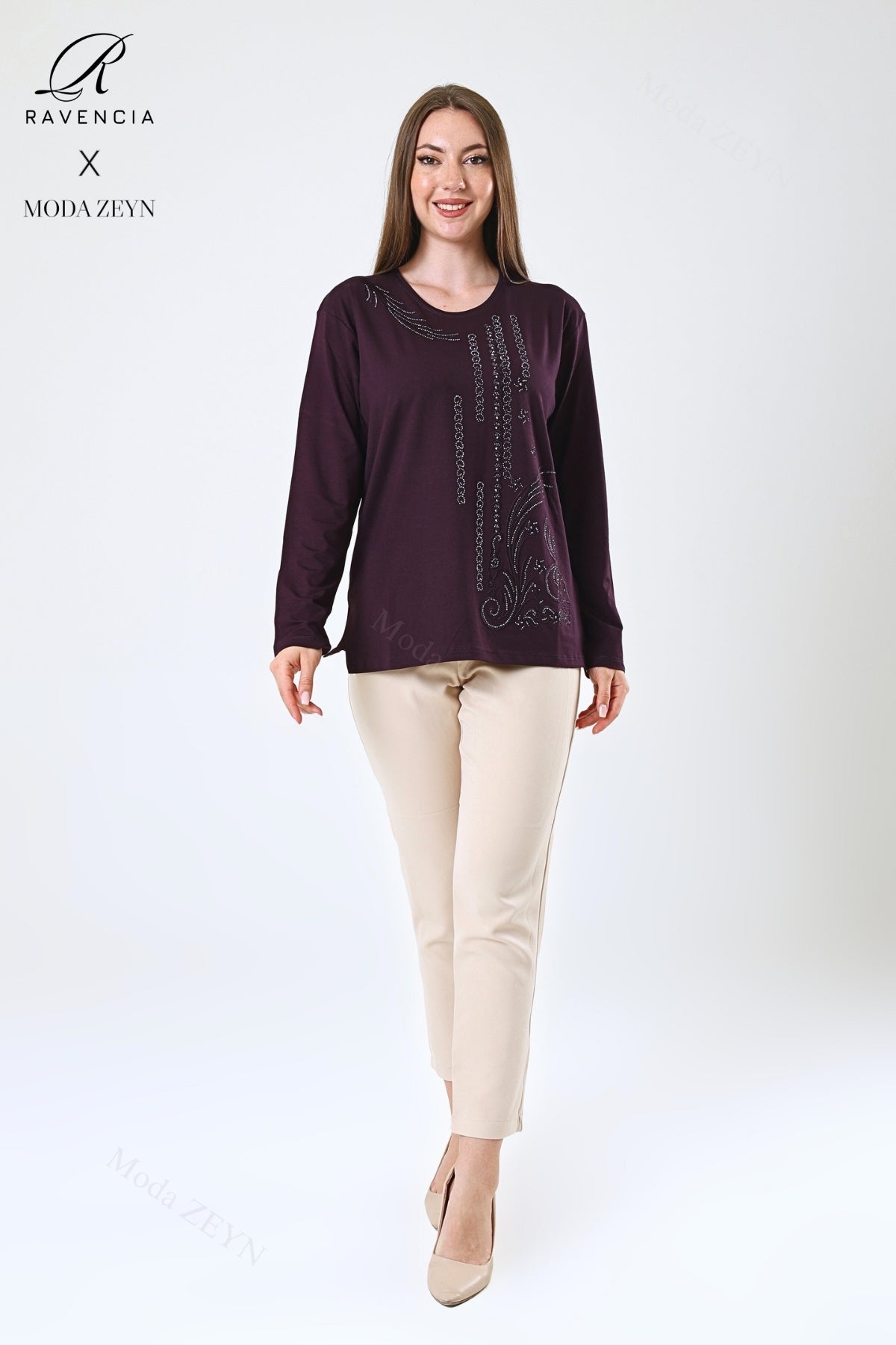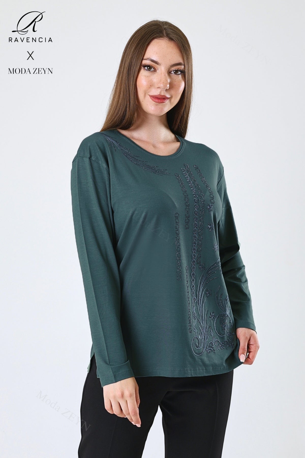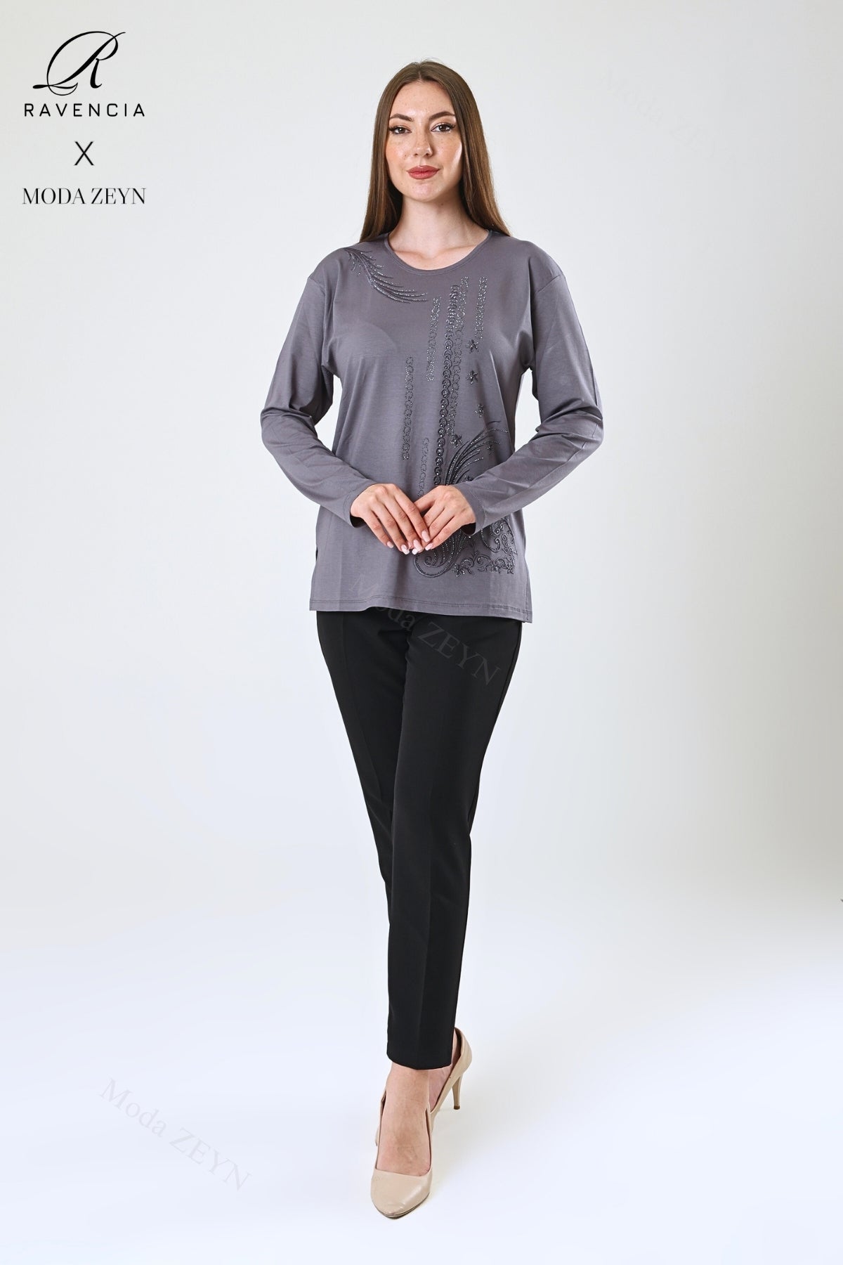 Gardırobunuzun en değerli parçası olmaya aday bu özel tasarım bluz, yüksek kaliteli viskon penye kumaşı ve göz alıcı taş işlemeleriyle şıklığı zahmetsizce yakalamanızı sağlar.