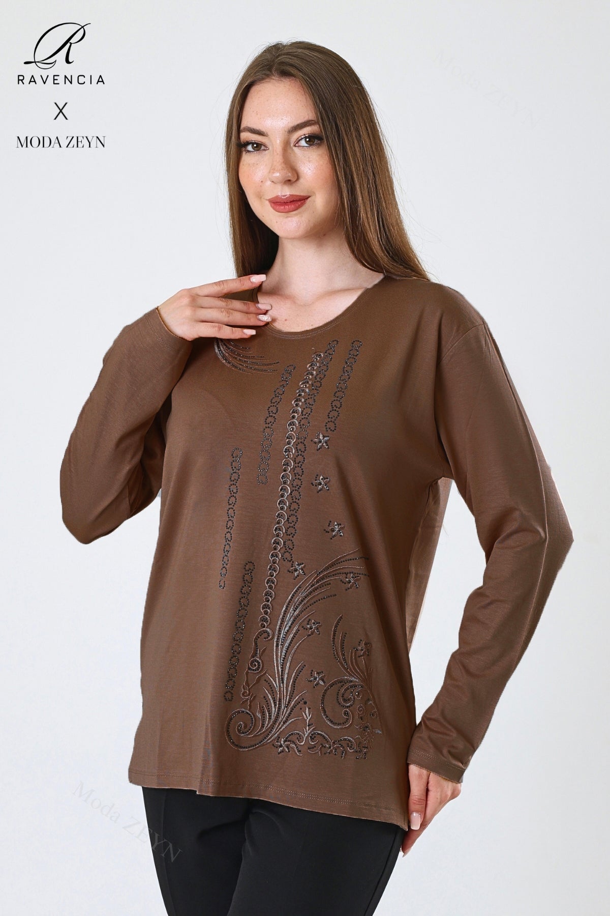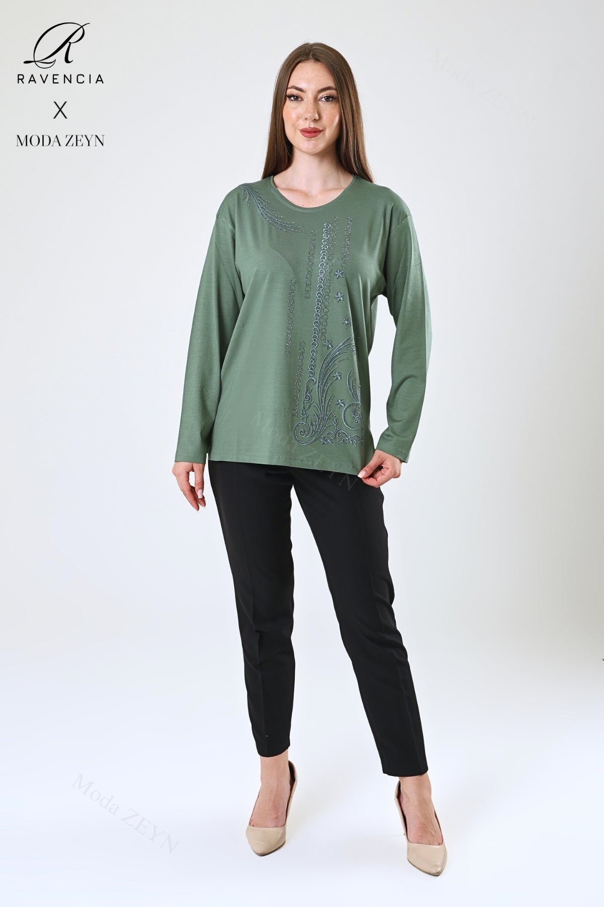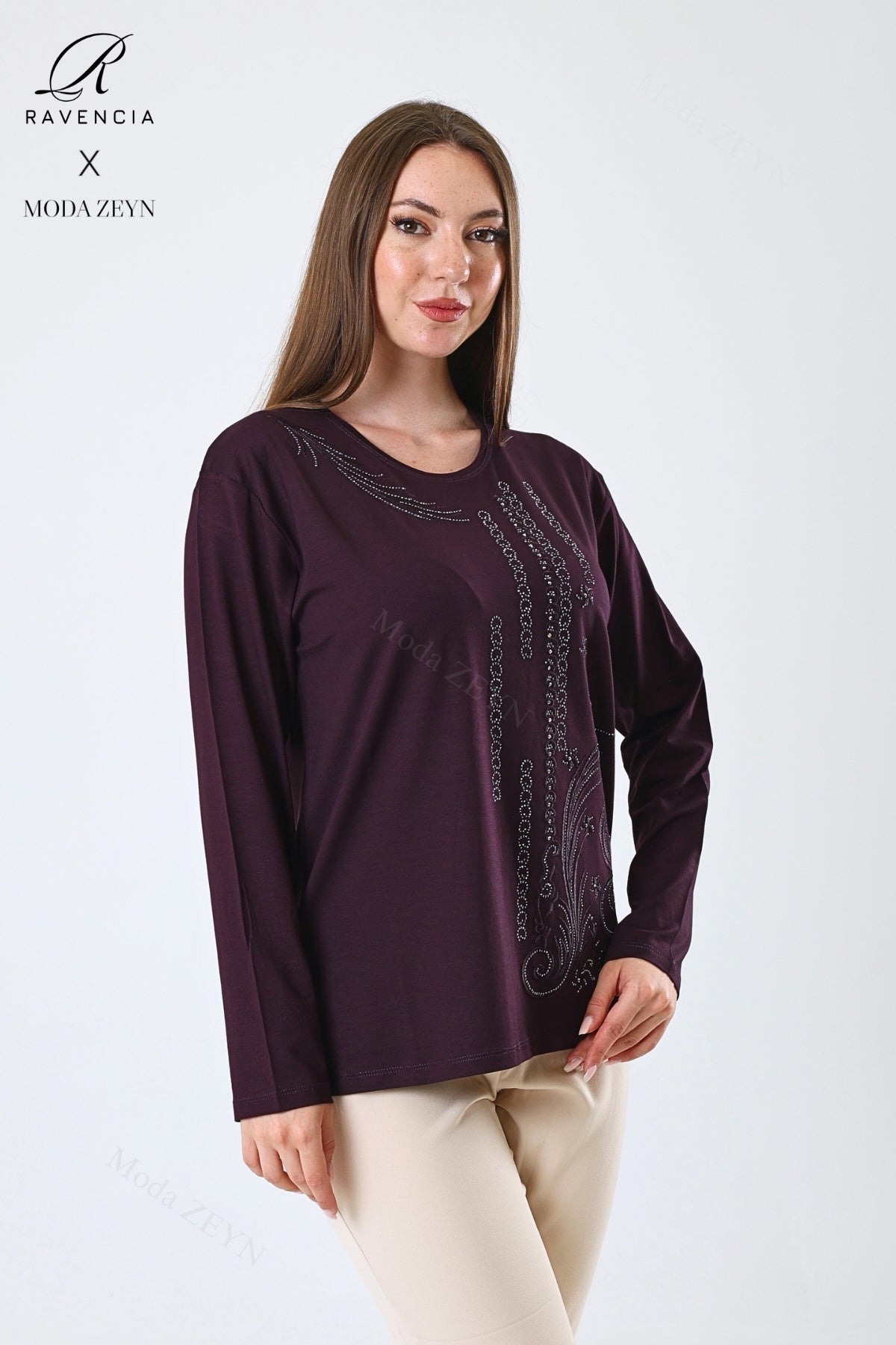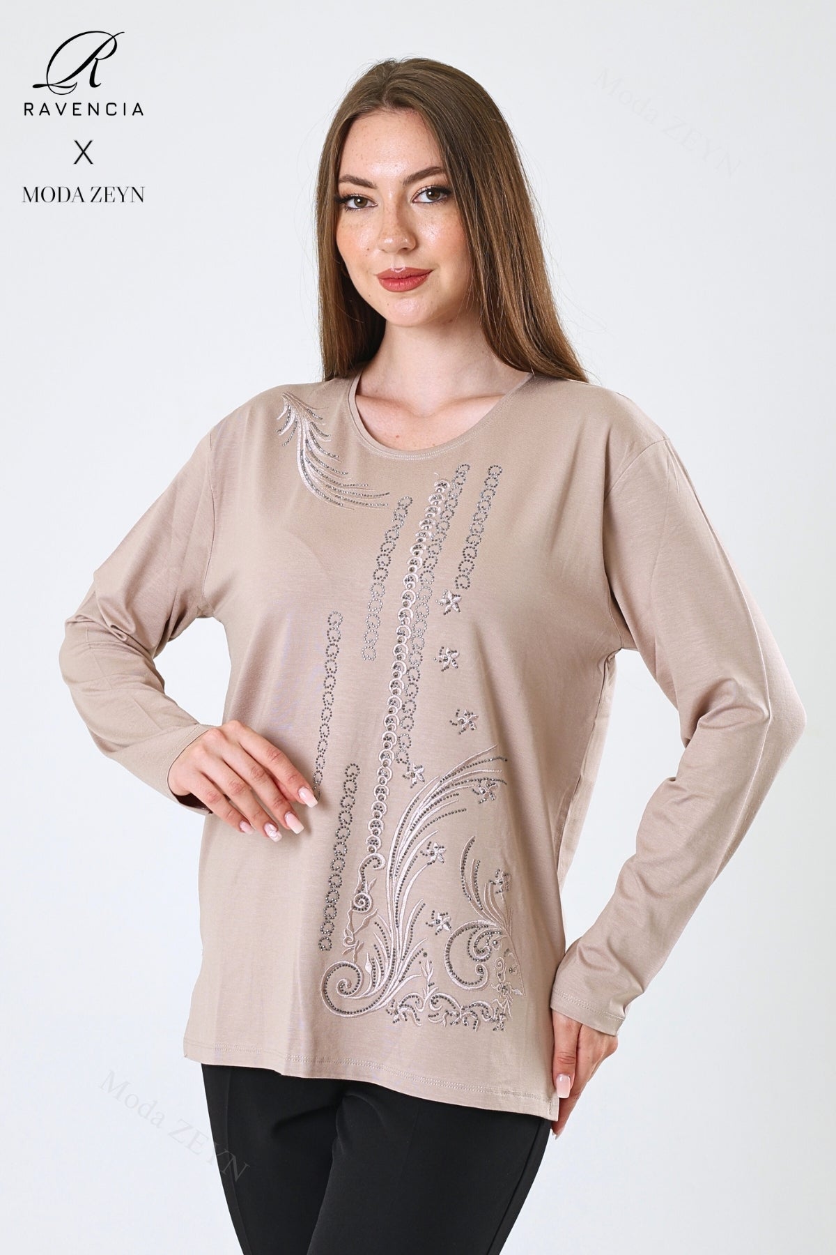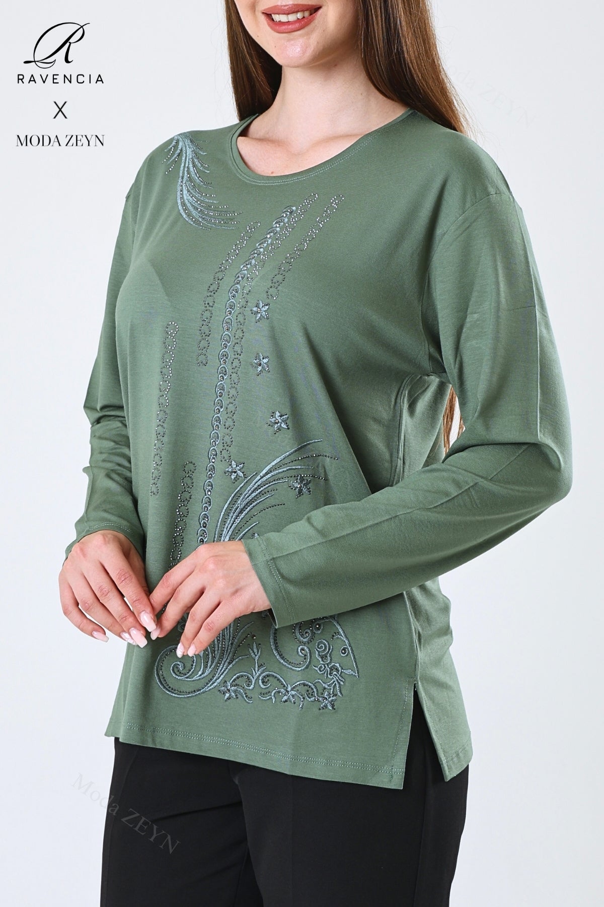 Gardırobunuzun en değerli parçası olmaya aday bu özel tasarım bluz, yüksek kaliteli viskon penye kumaşı ve göz alıcı taş işlemeleriyle şıklığı zahmetsizce yakalamanızı sağlar.