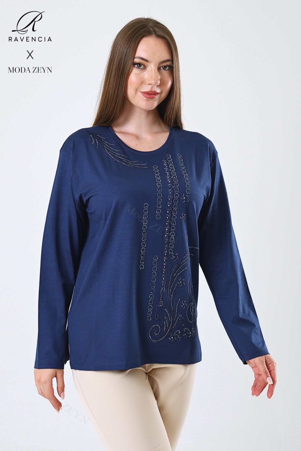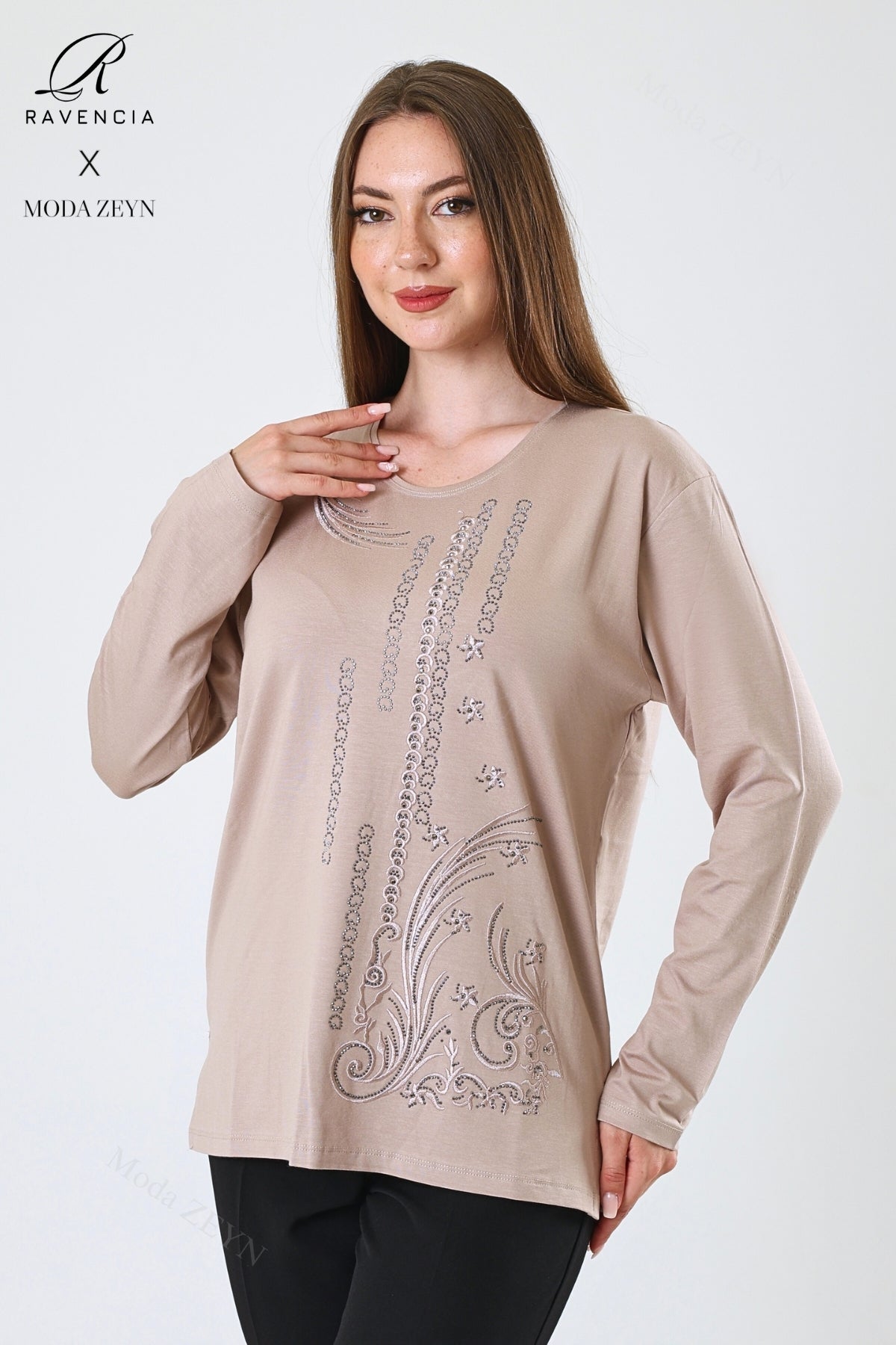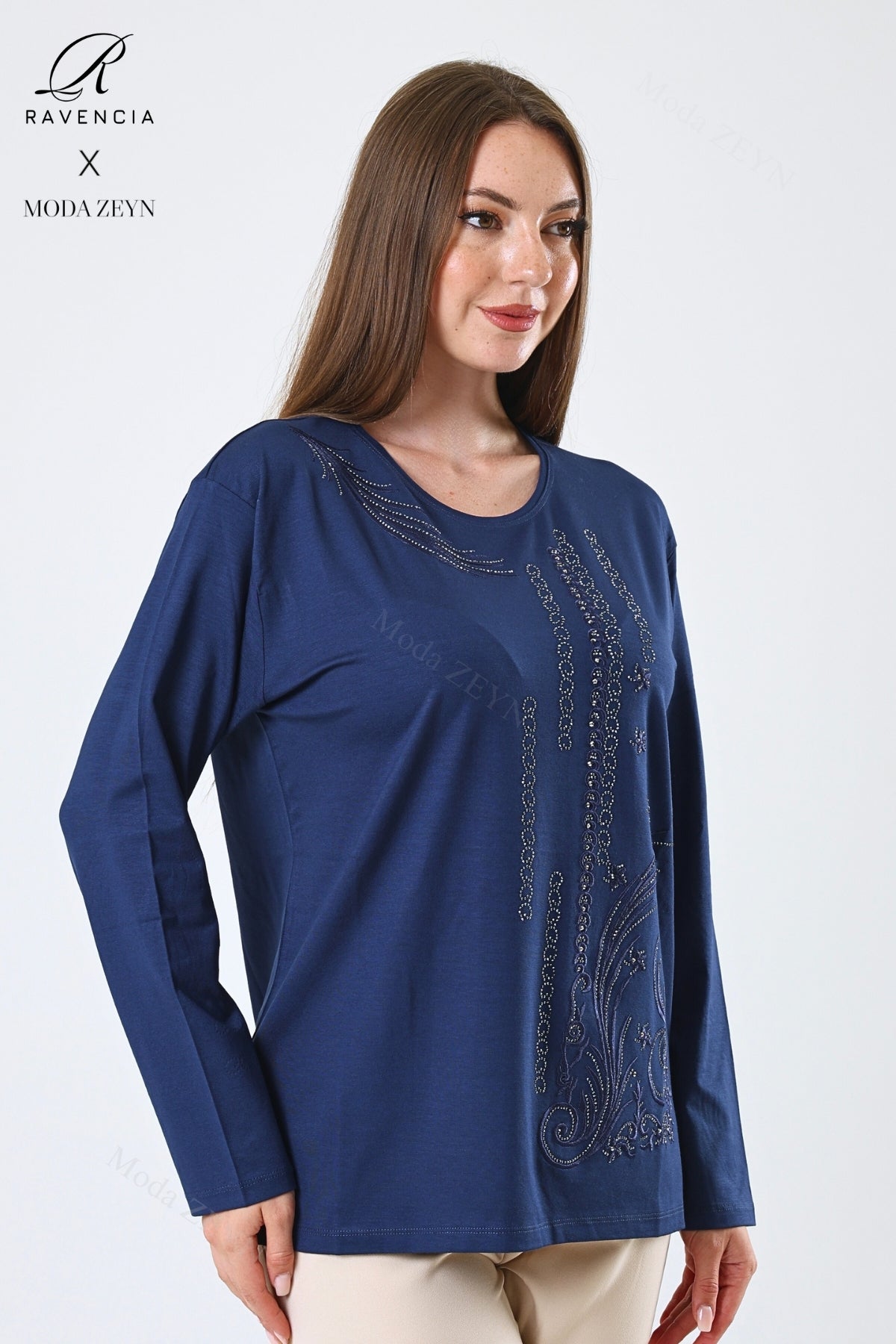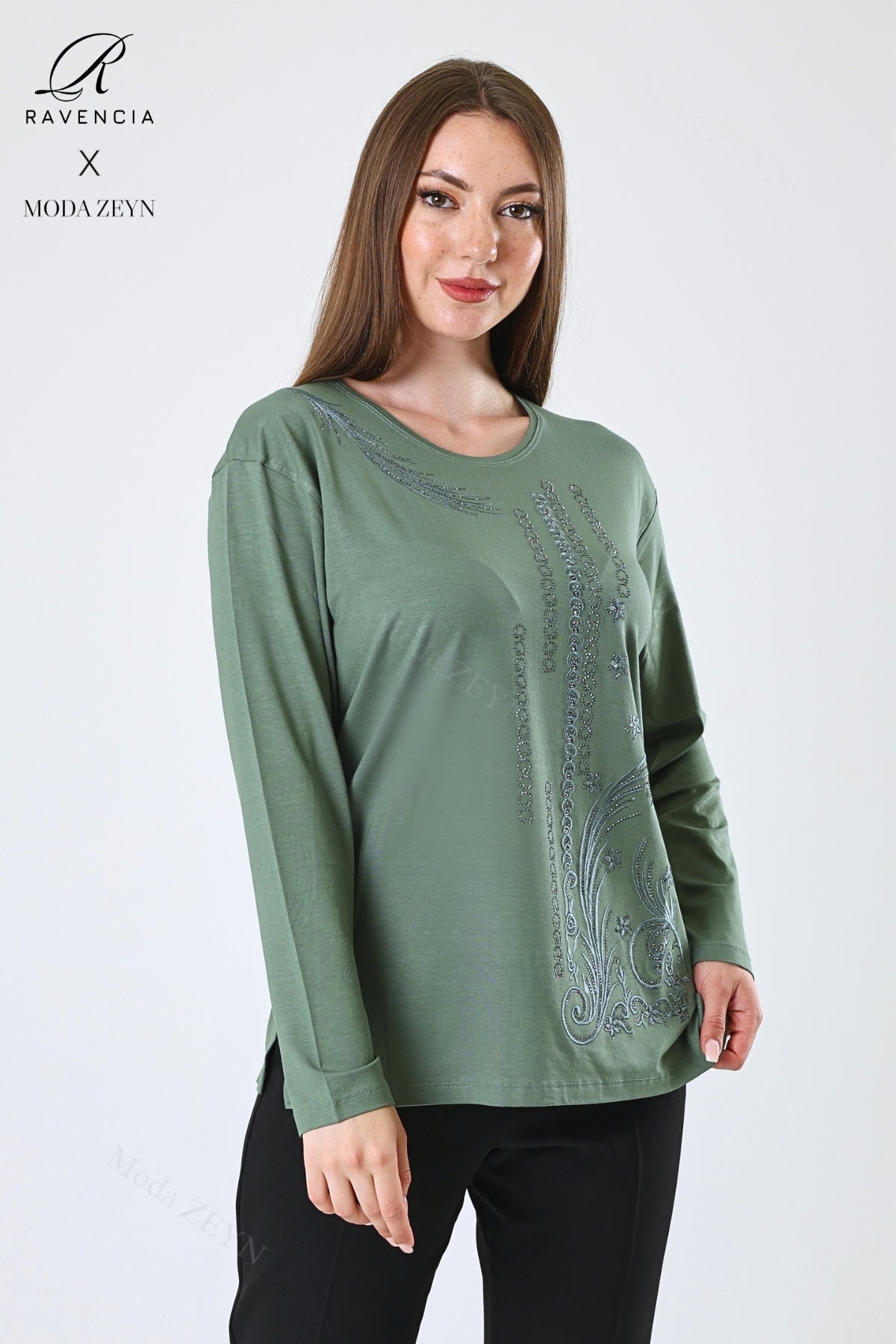 Gardırobunuzun en değerli parçası olmaya aday bu özel tasarım bluz, yüksek kaliteli viskon penye kumaşı ve göz alıcı taş işlemeleriyle şıklığı zahmetsizce yakalamanızı sağlar.