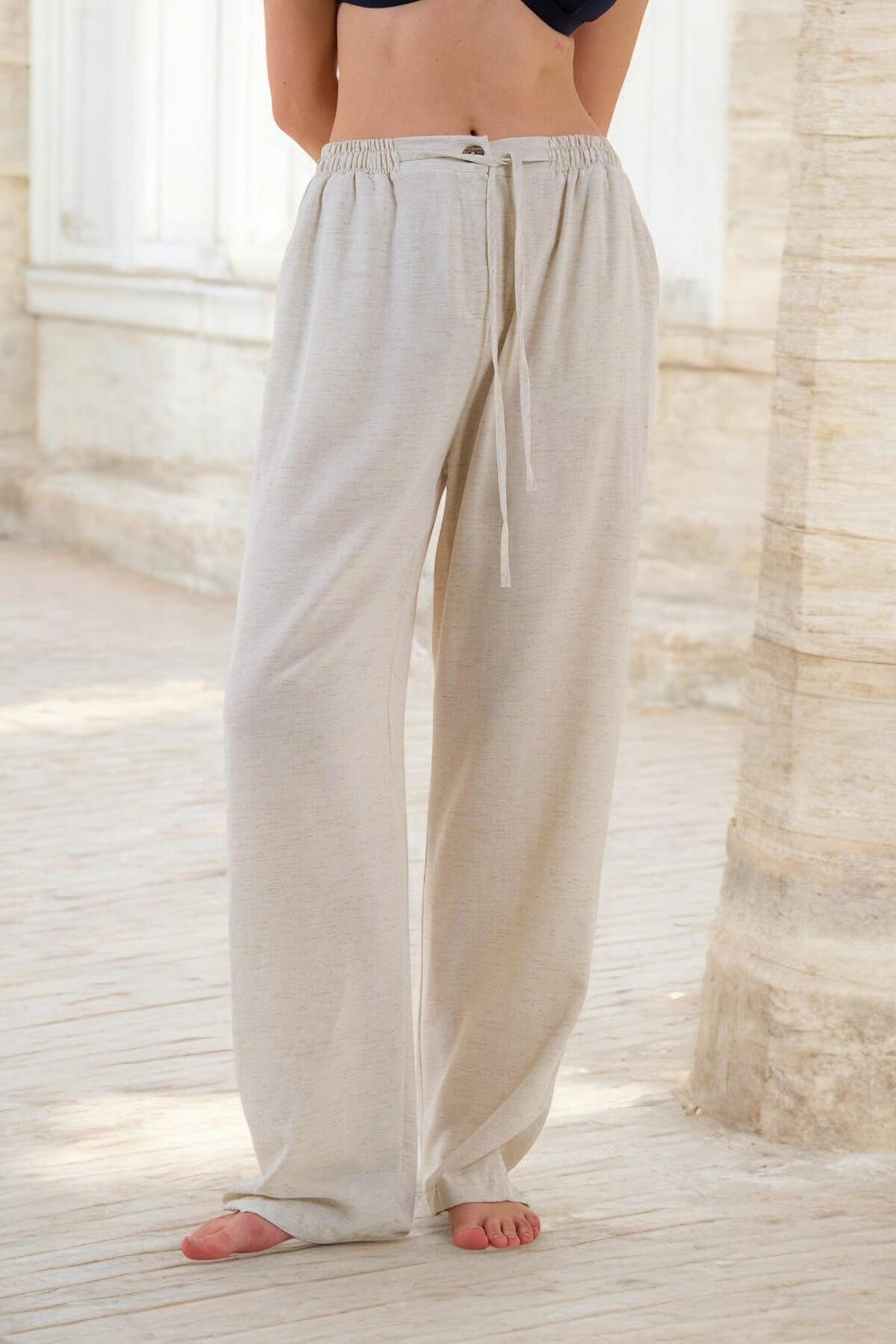 Kadın ham keten bol kesim beli lastikli krem pantolon, doğal ve rahat bir stile sahiptir.
