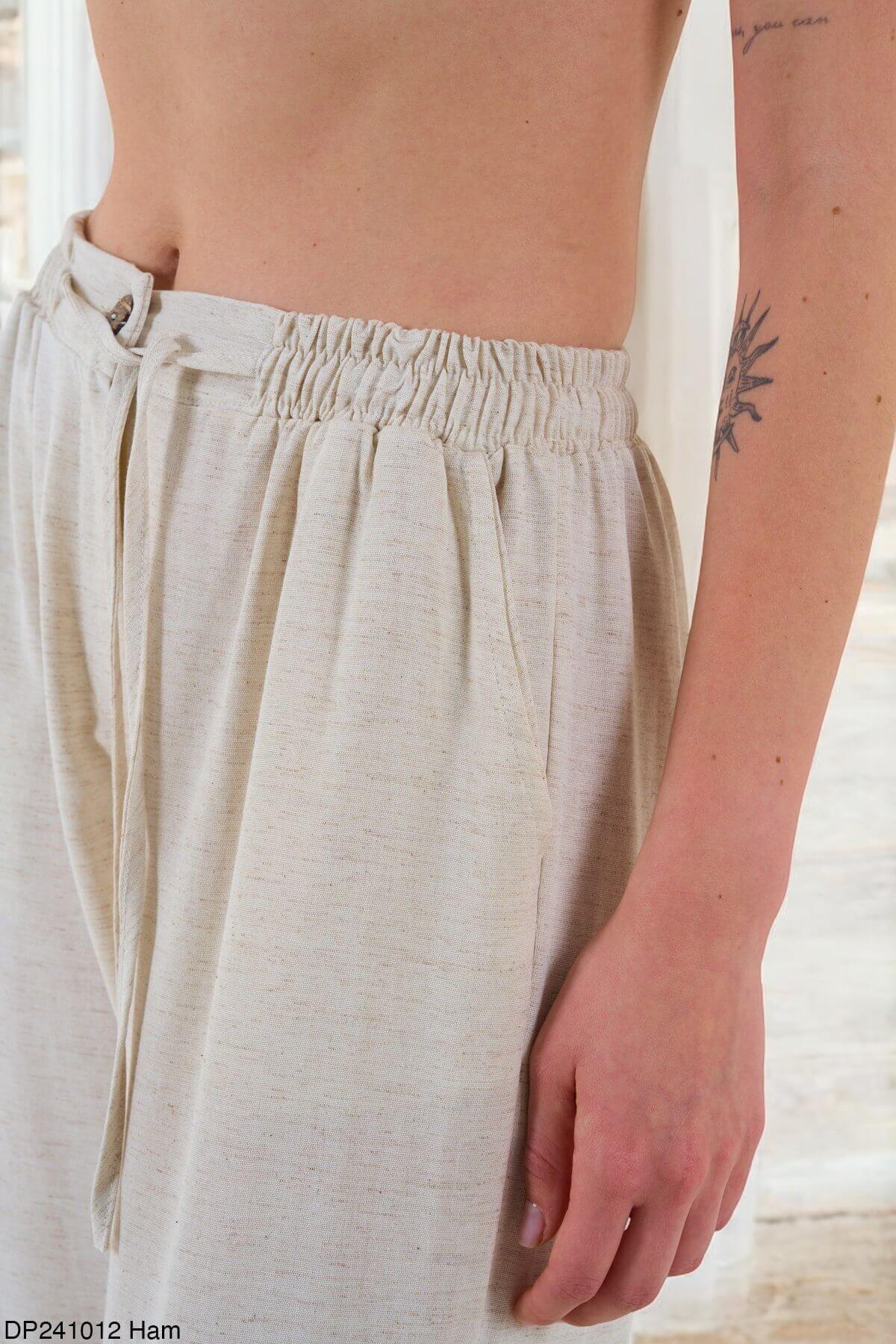 Kadın Ham Keten Bol Kesim Beli Lastikli Krem Pantolon