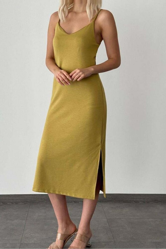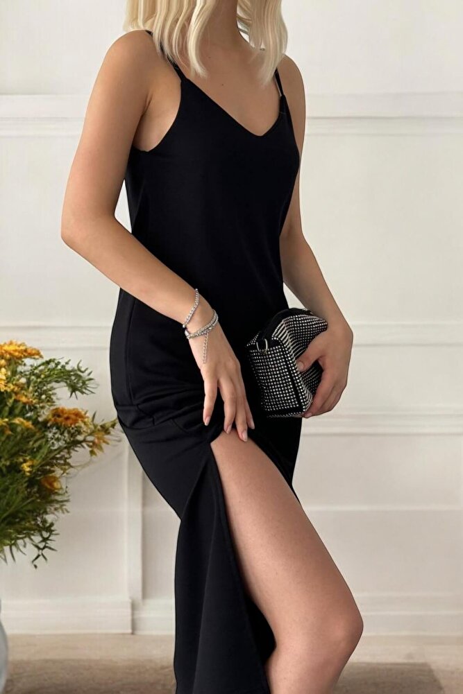 Kadın ip askılı çift yırtmaç detaylı modal kumaş elbise, zarif ve modern bir stile sahiptir.