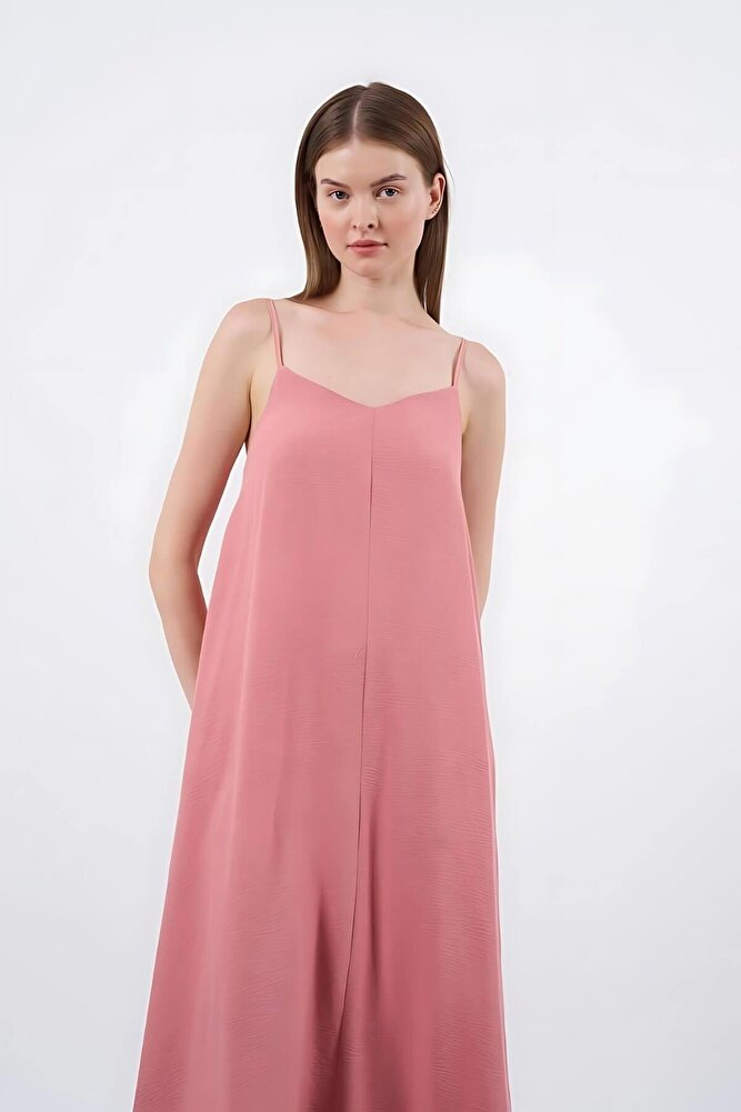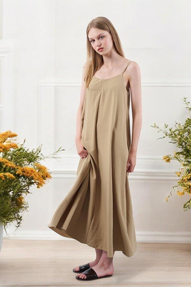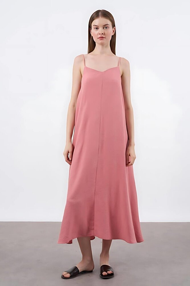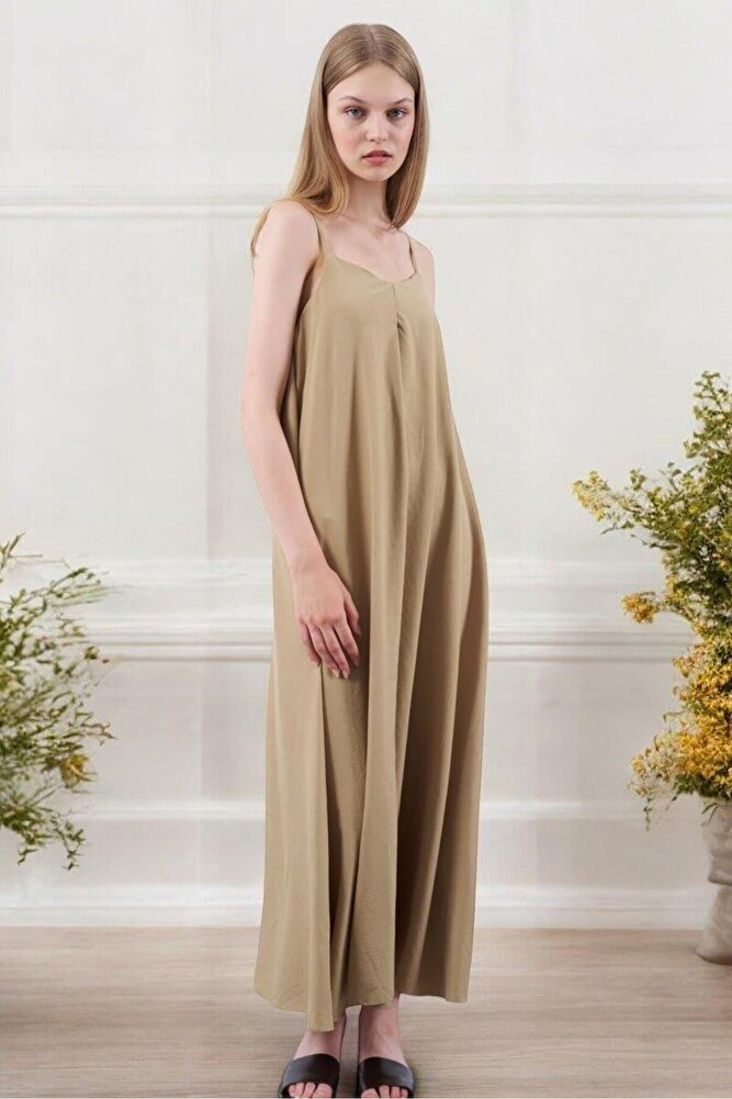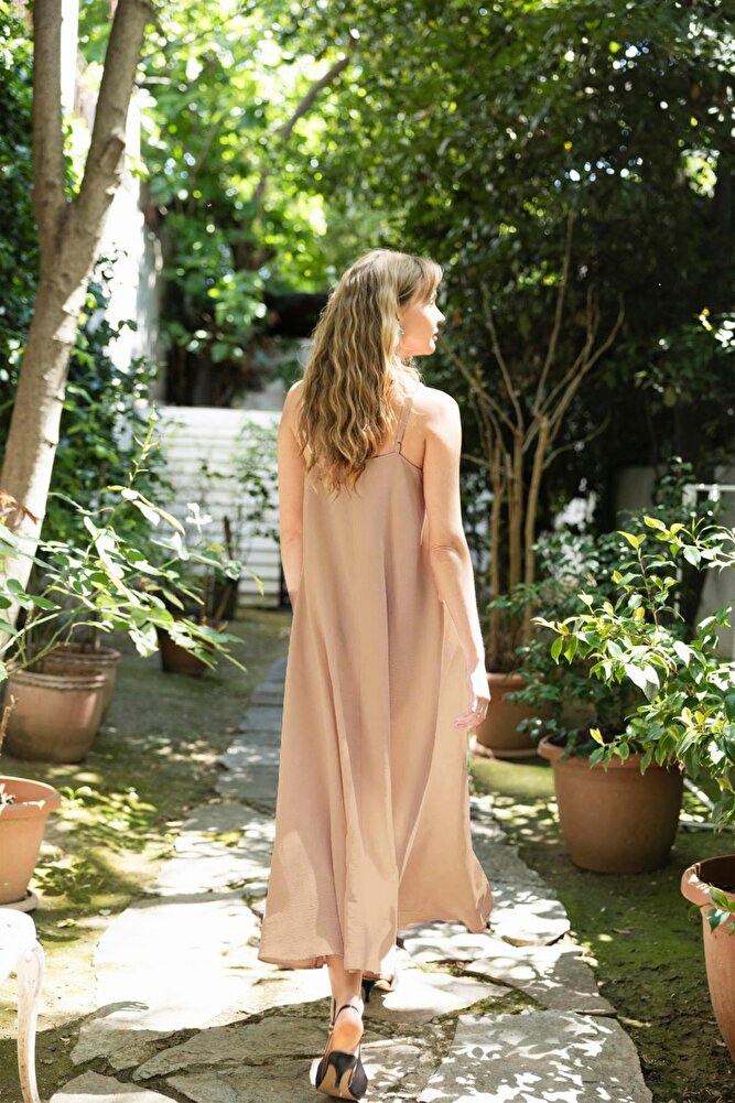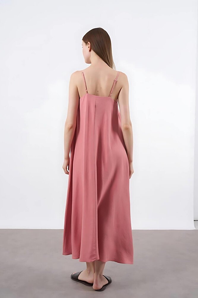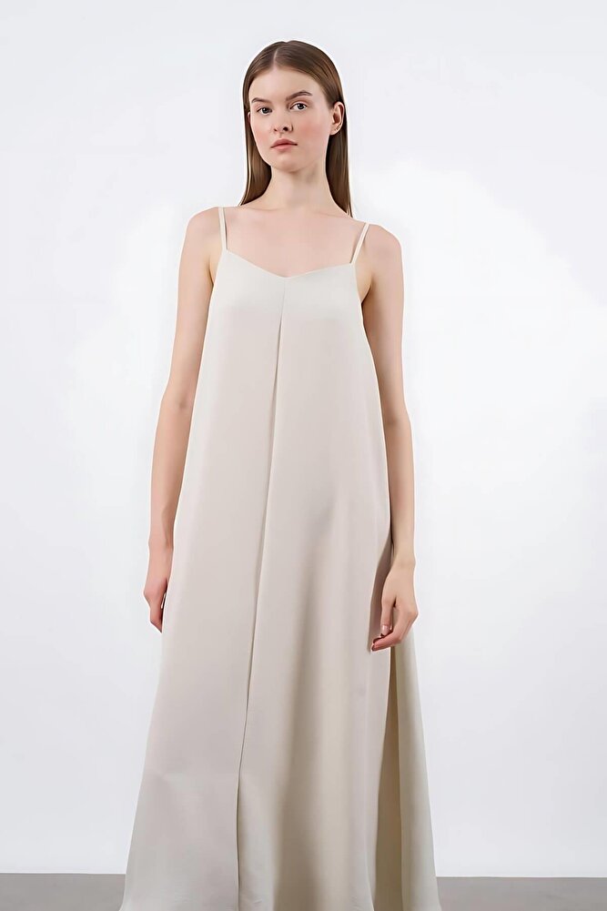 Kadın ip askılı uzun elbise, zarif ve feminen bir stile sahiptir.