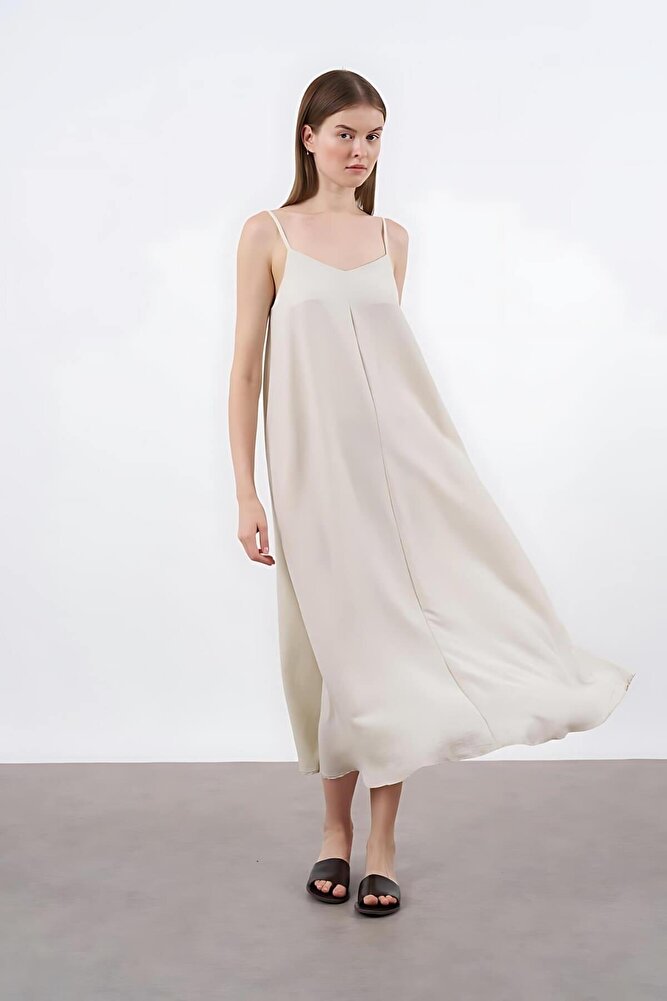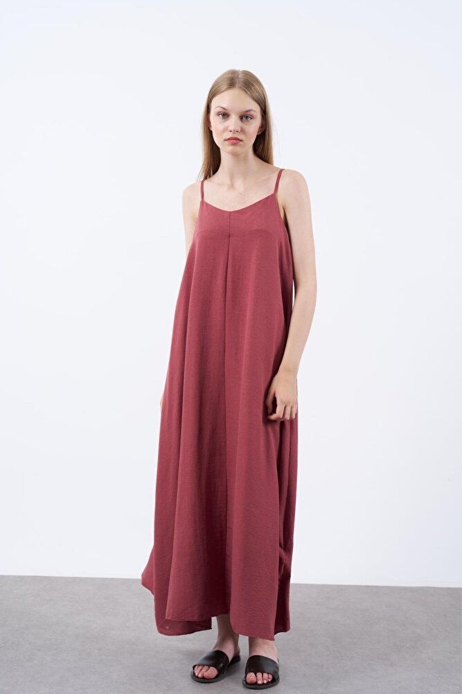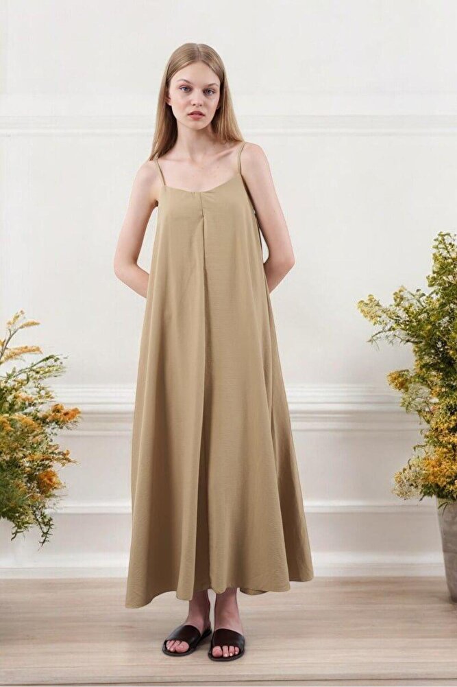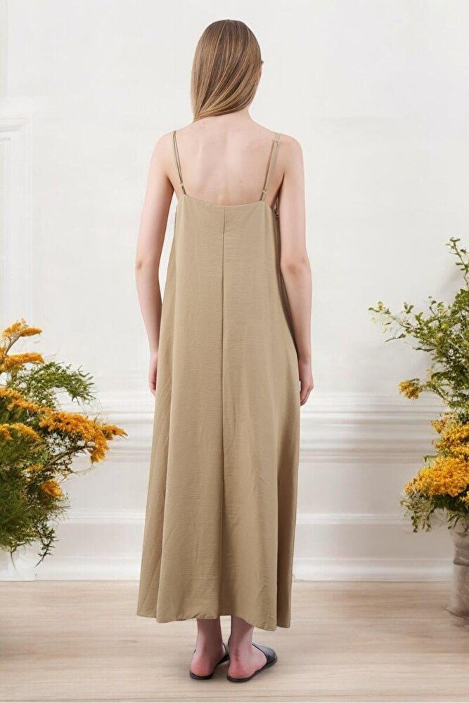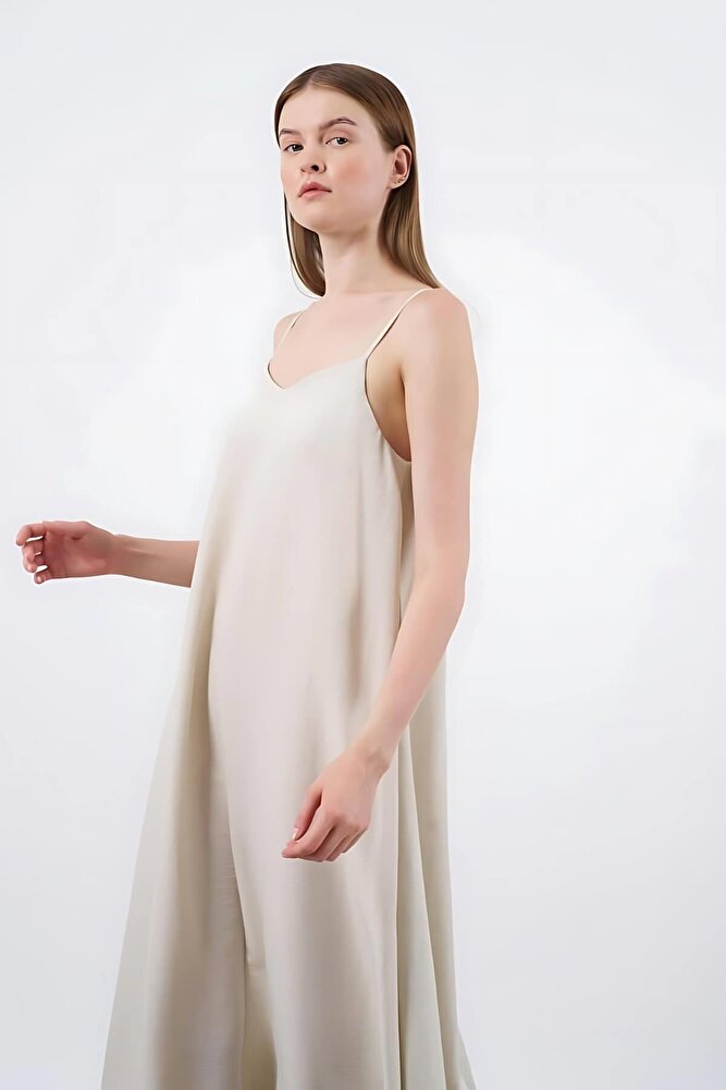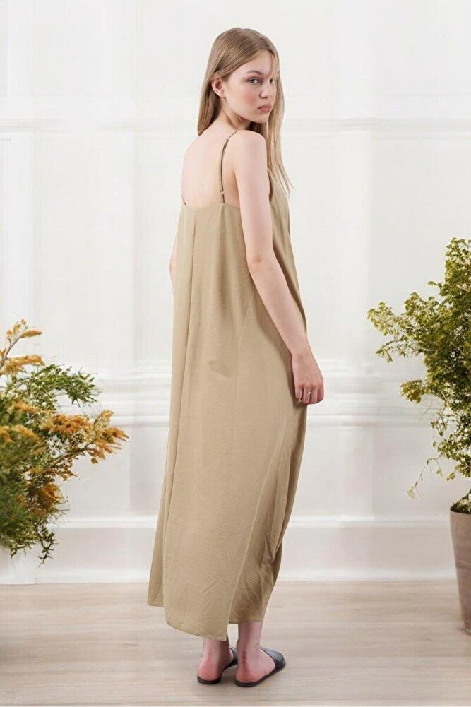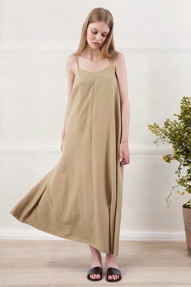 Kadın ip askılı uzun elbise, zarif ve feminen bir stile sahiptir.