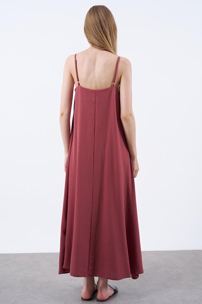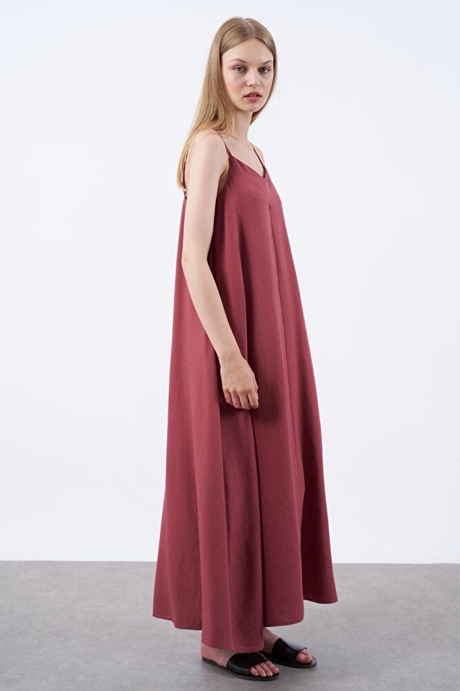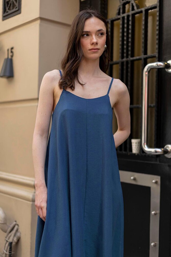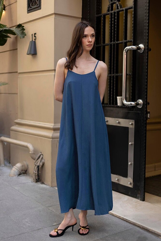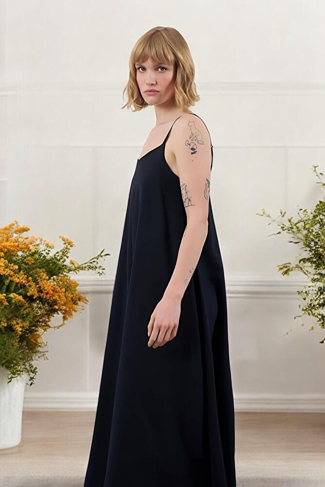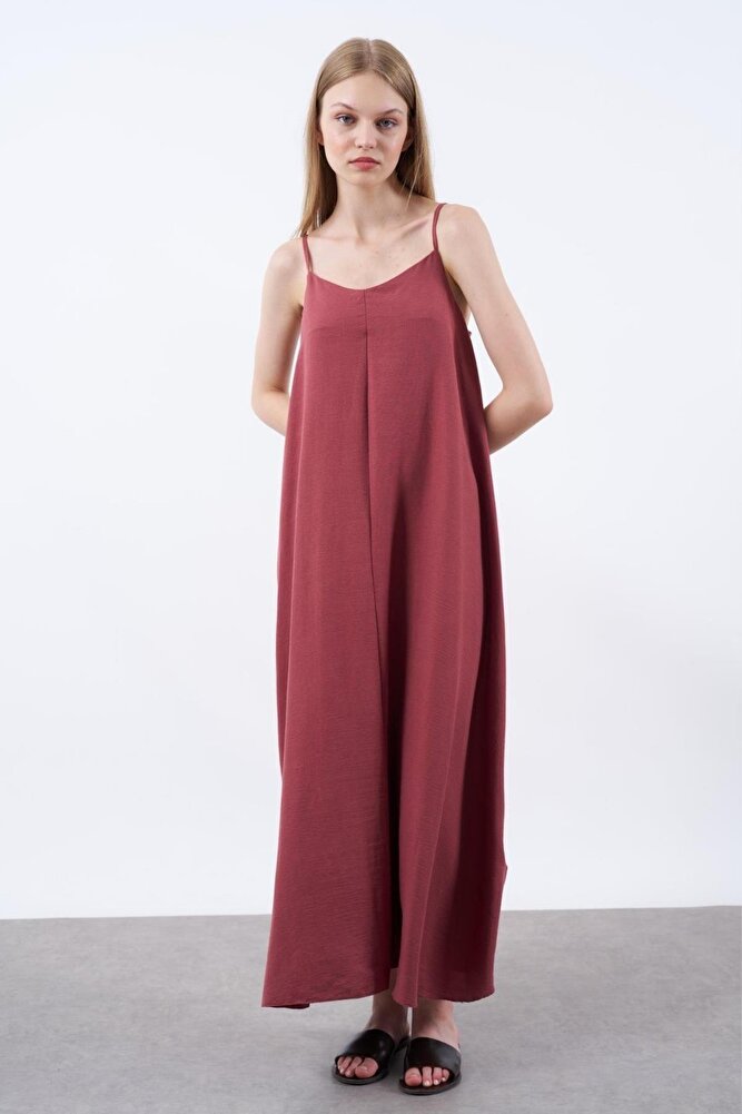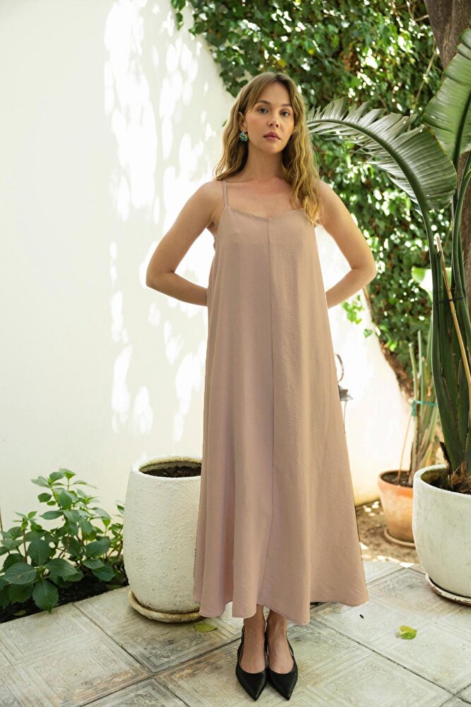 Kadın ip askılı uzun elbise, zarif ve feminen bir stile sahiptir.