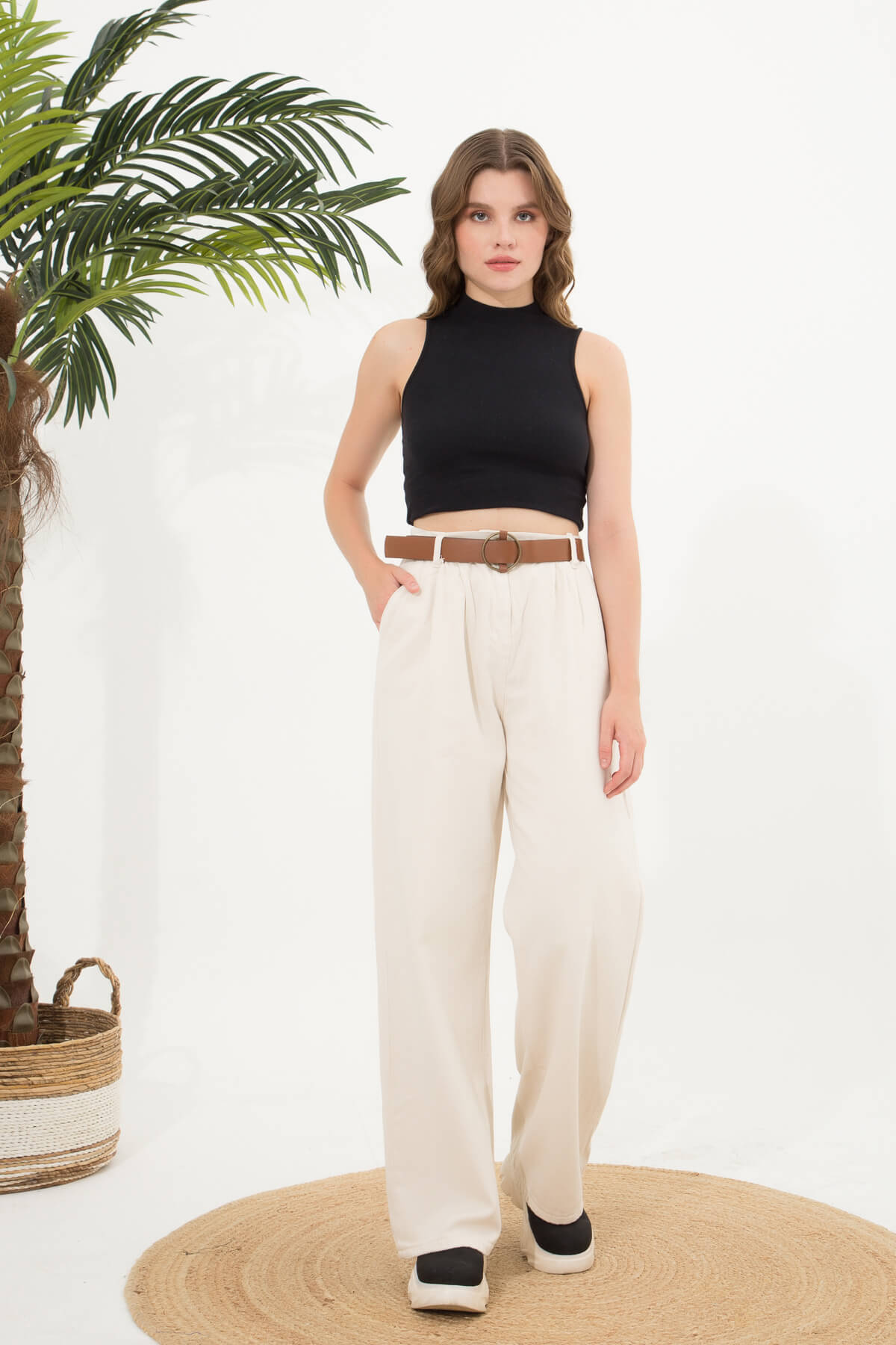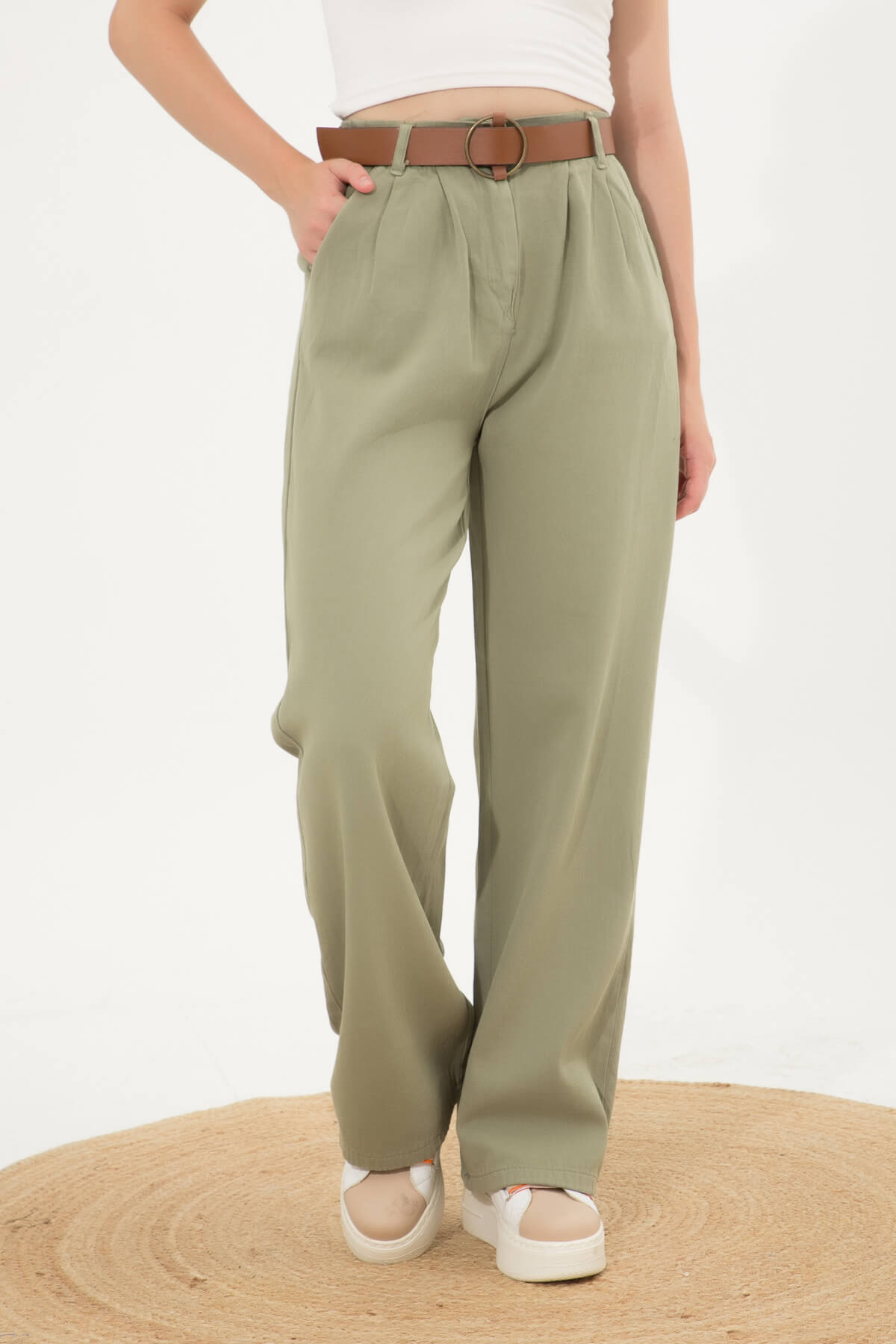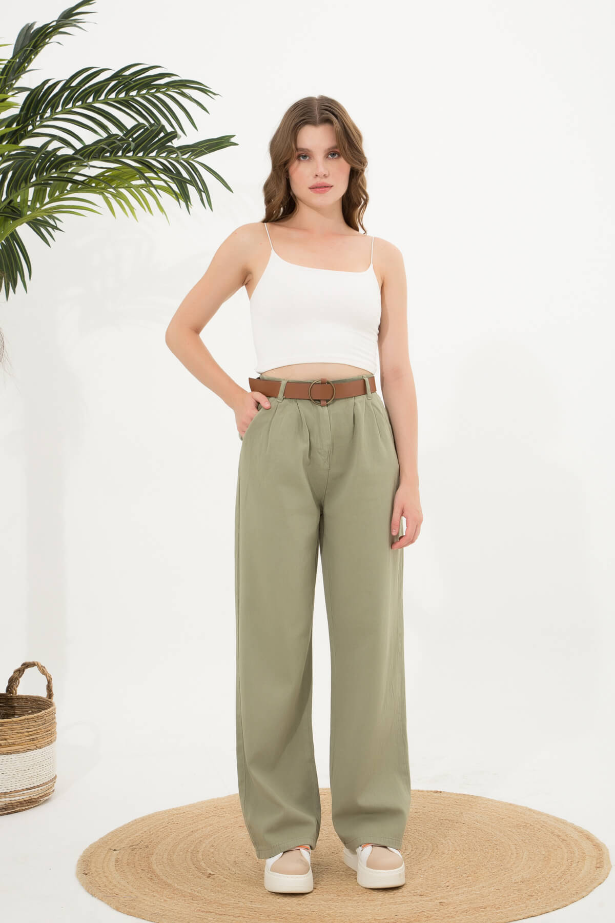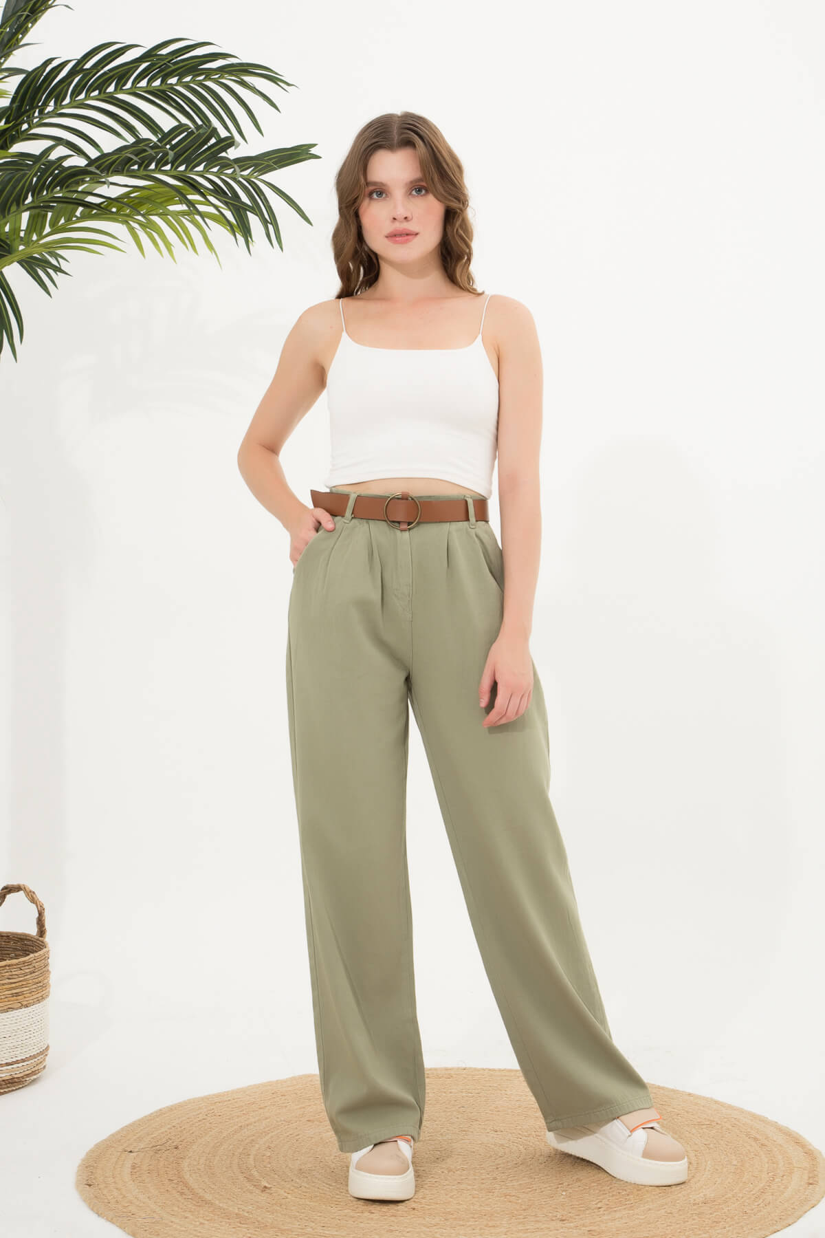 Kadın kemerli pileli palazzo pantolon, zarif ve modern bir stile sahiptir.
