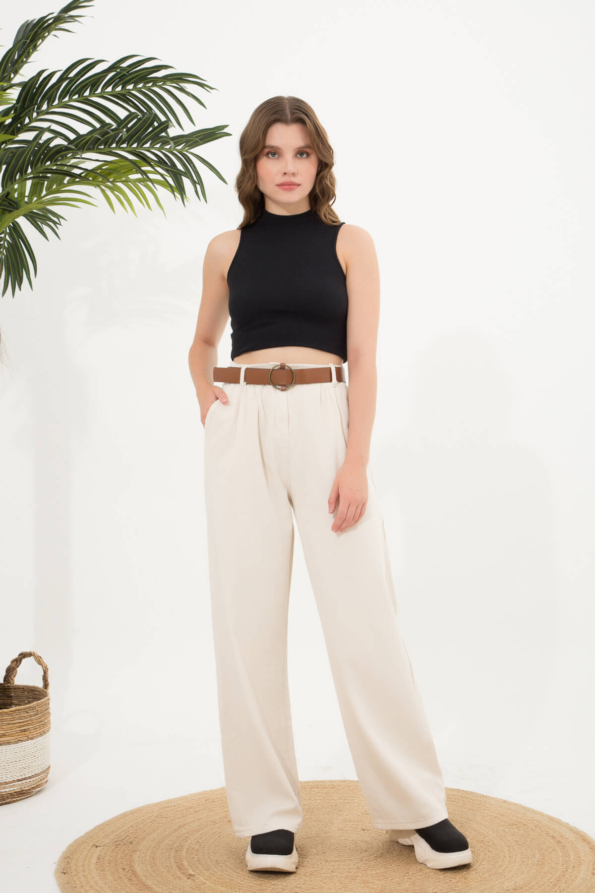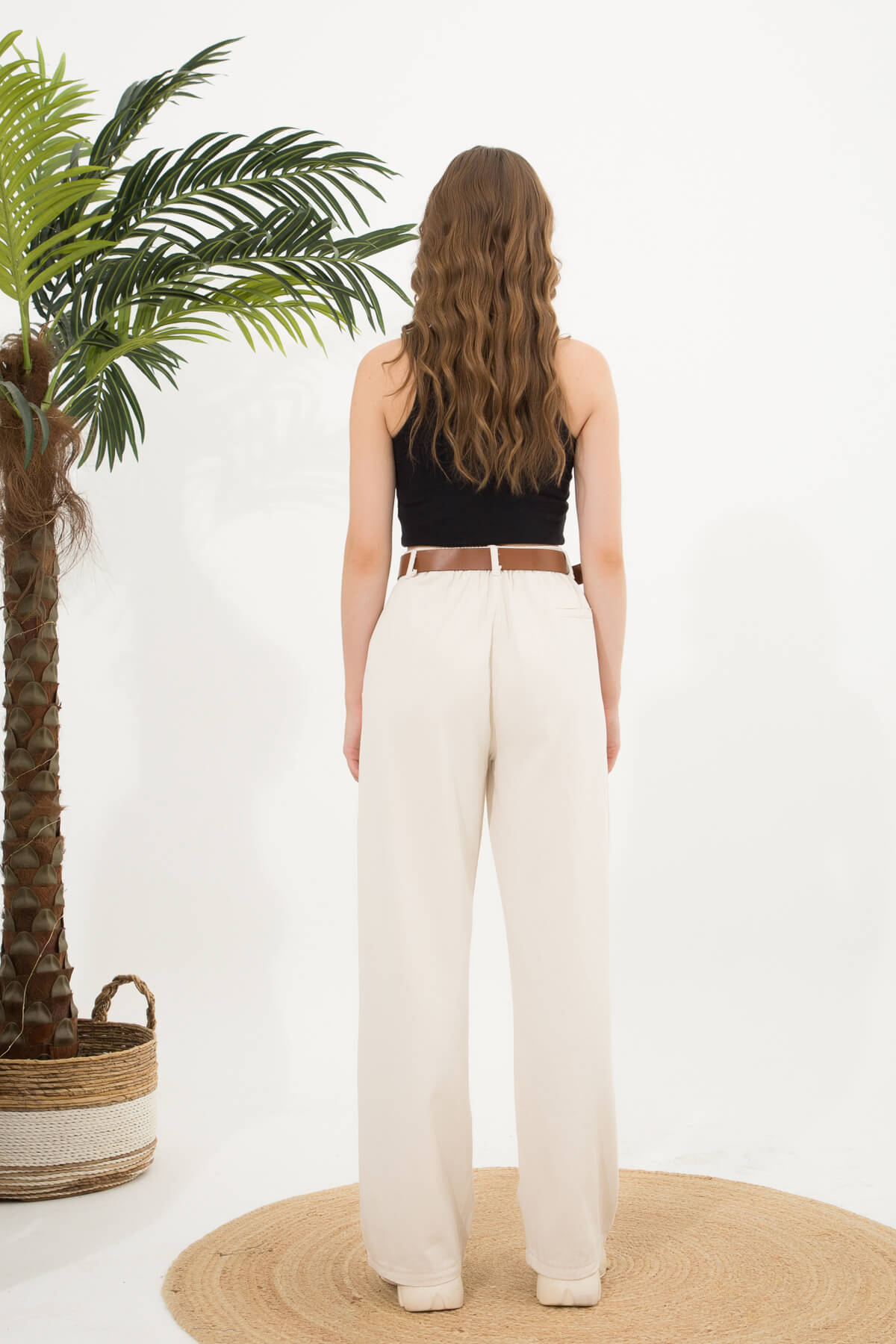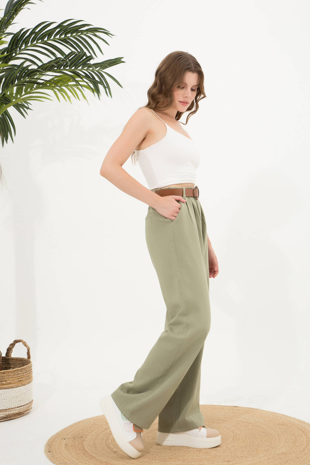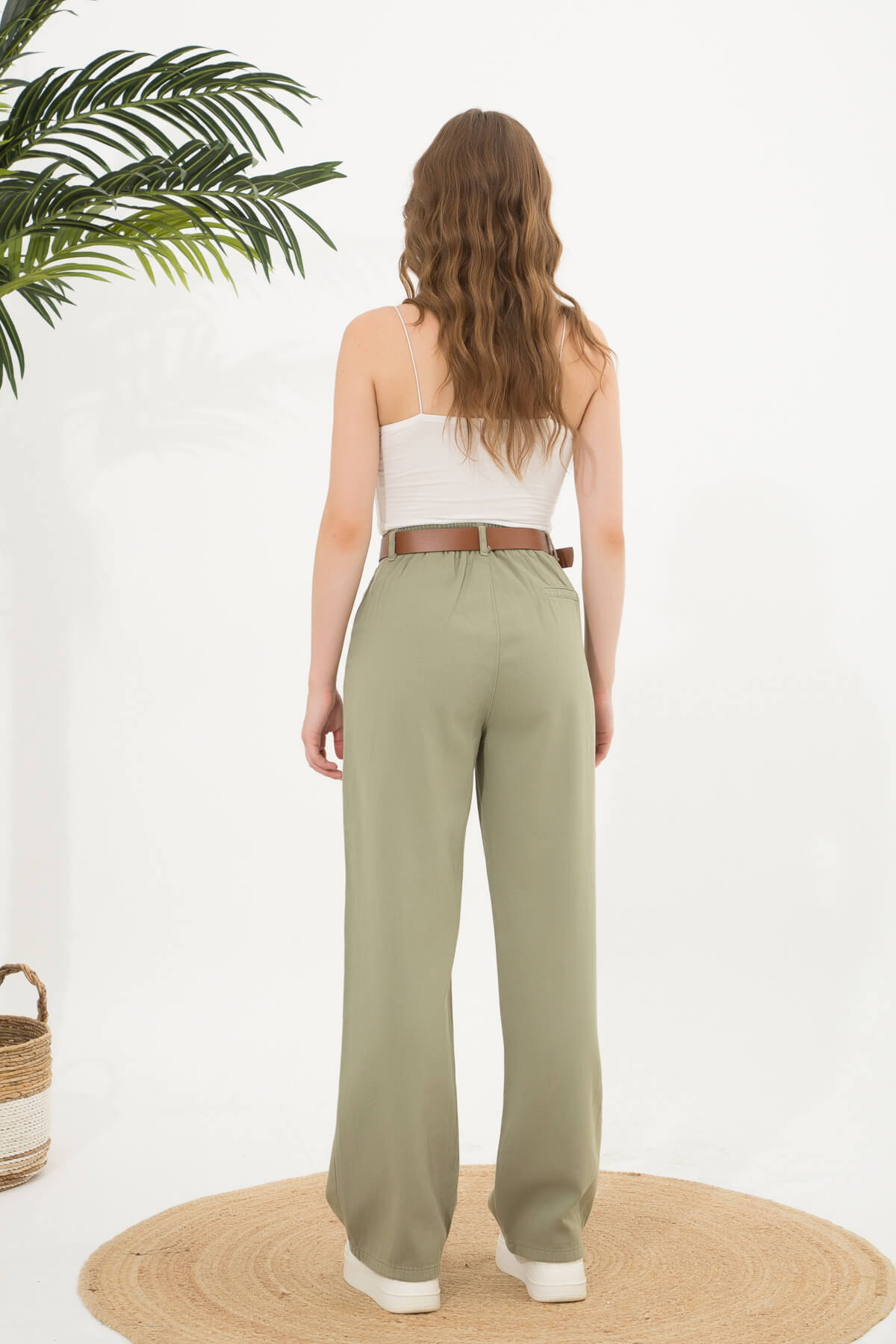Kadın kemerli pileli palazzo pantolon, zarif ve modern bir stile sahiptir.