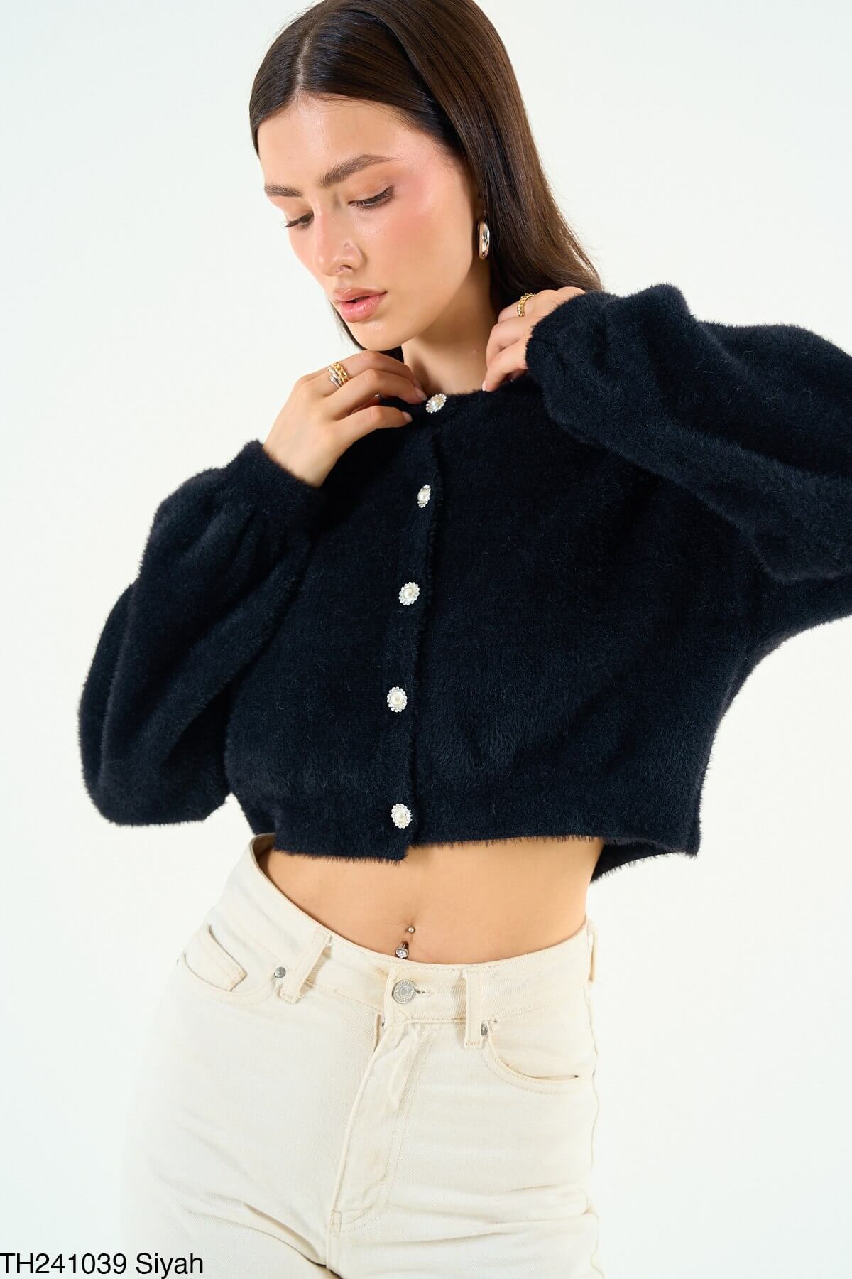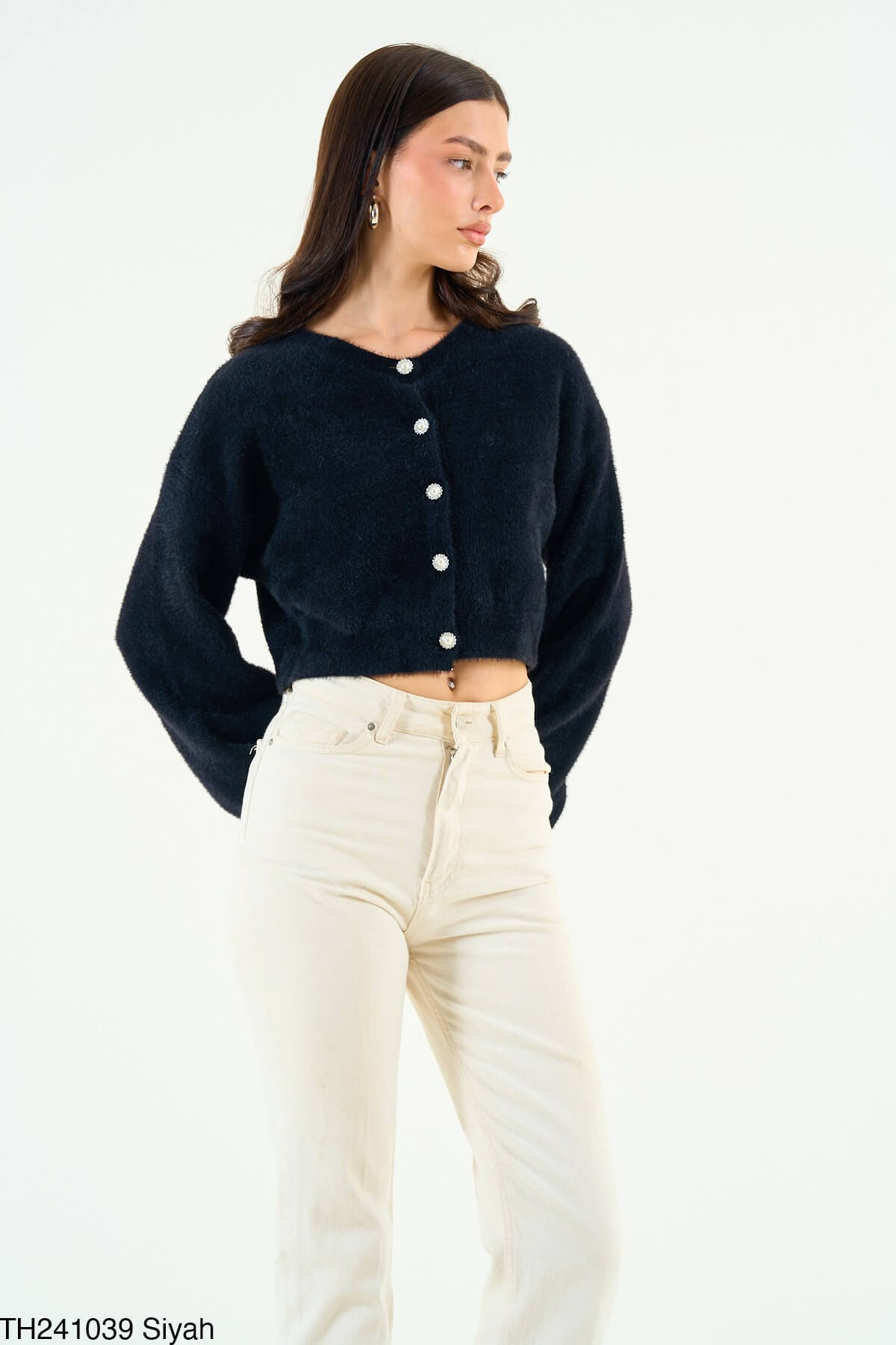 Kadın İnci Taşlı Düğmeli Yumoş Hırka