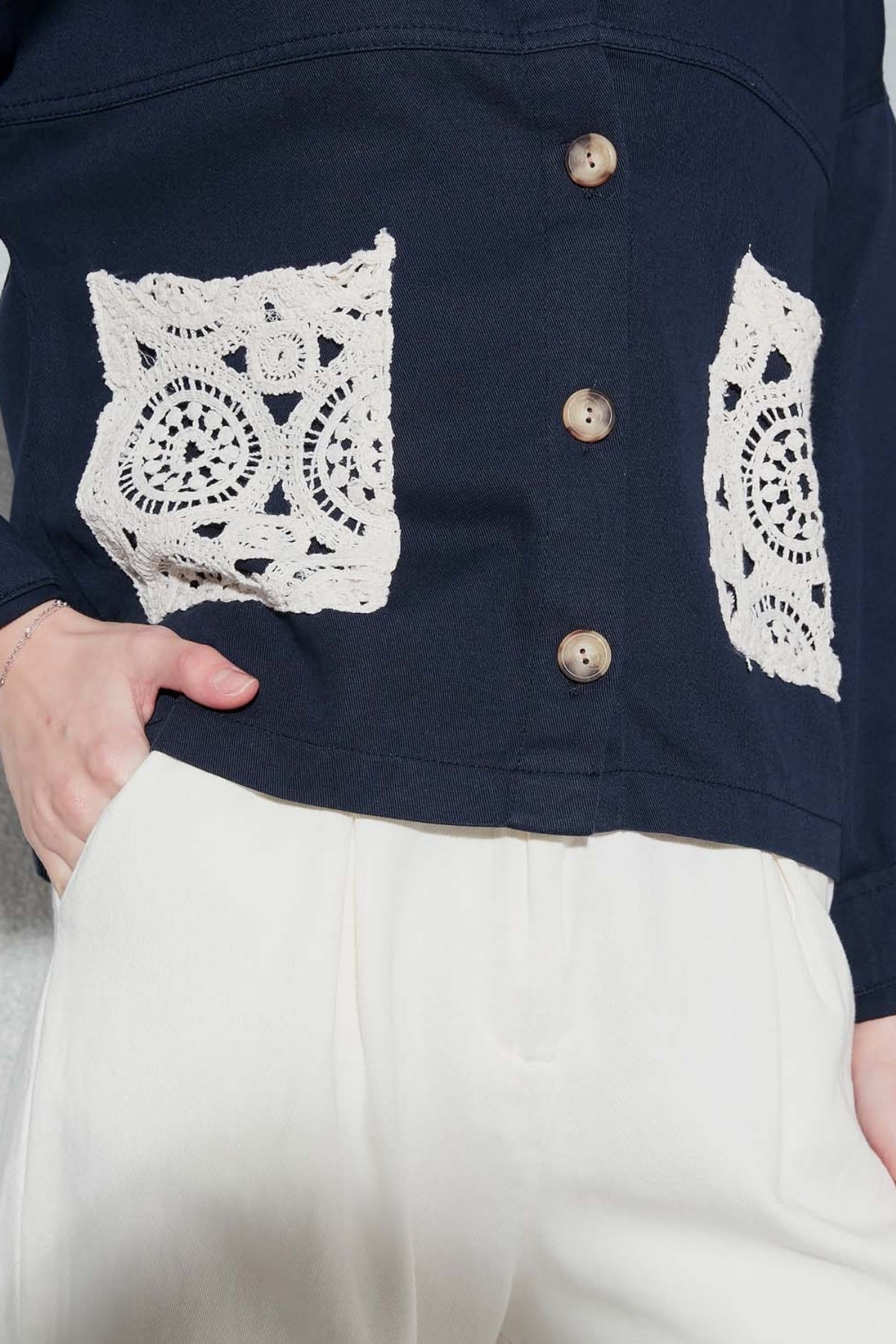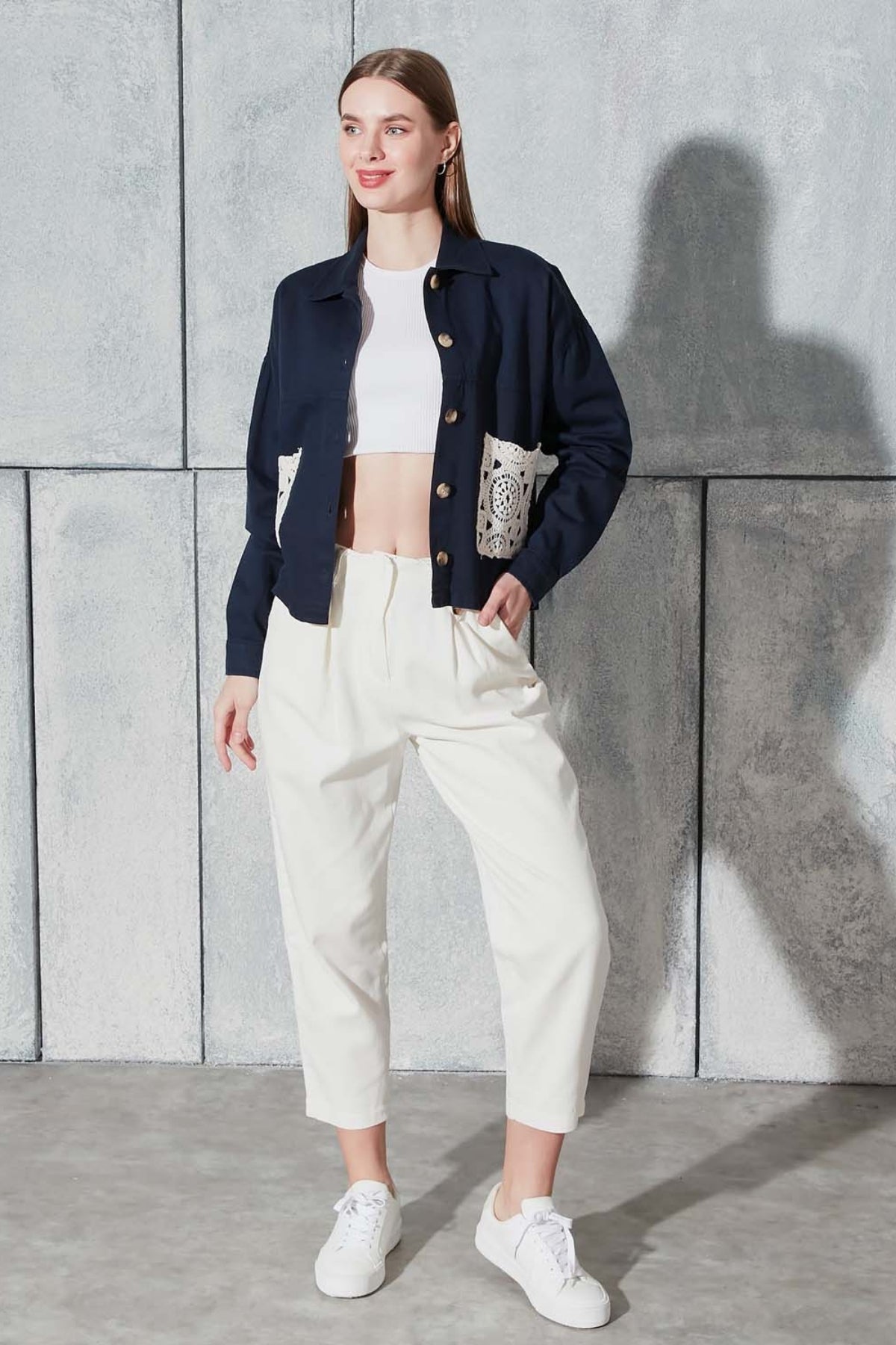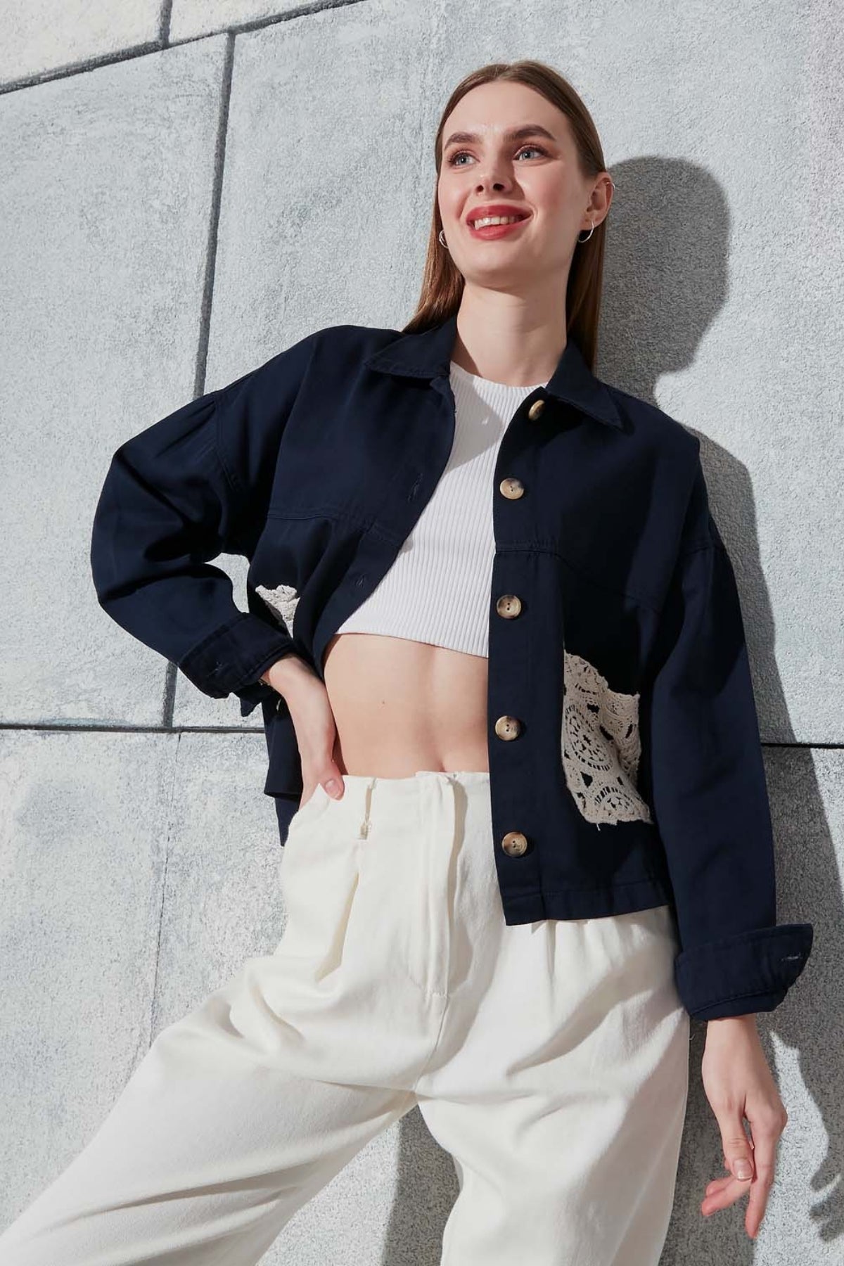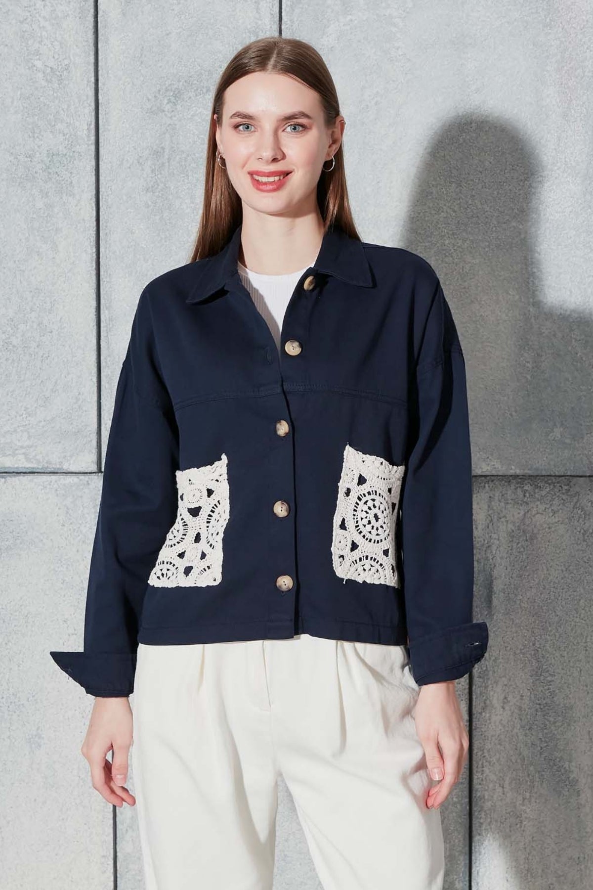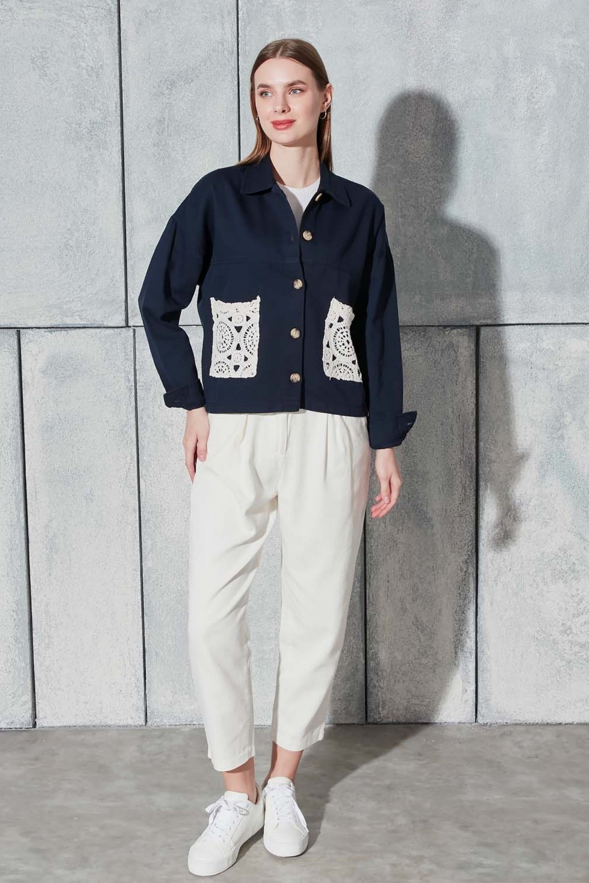 Kadın lacivert gabardin ceket, zamansız ve şık bir dış giyim parçasıdır.