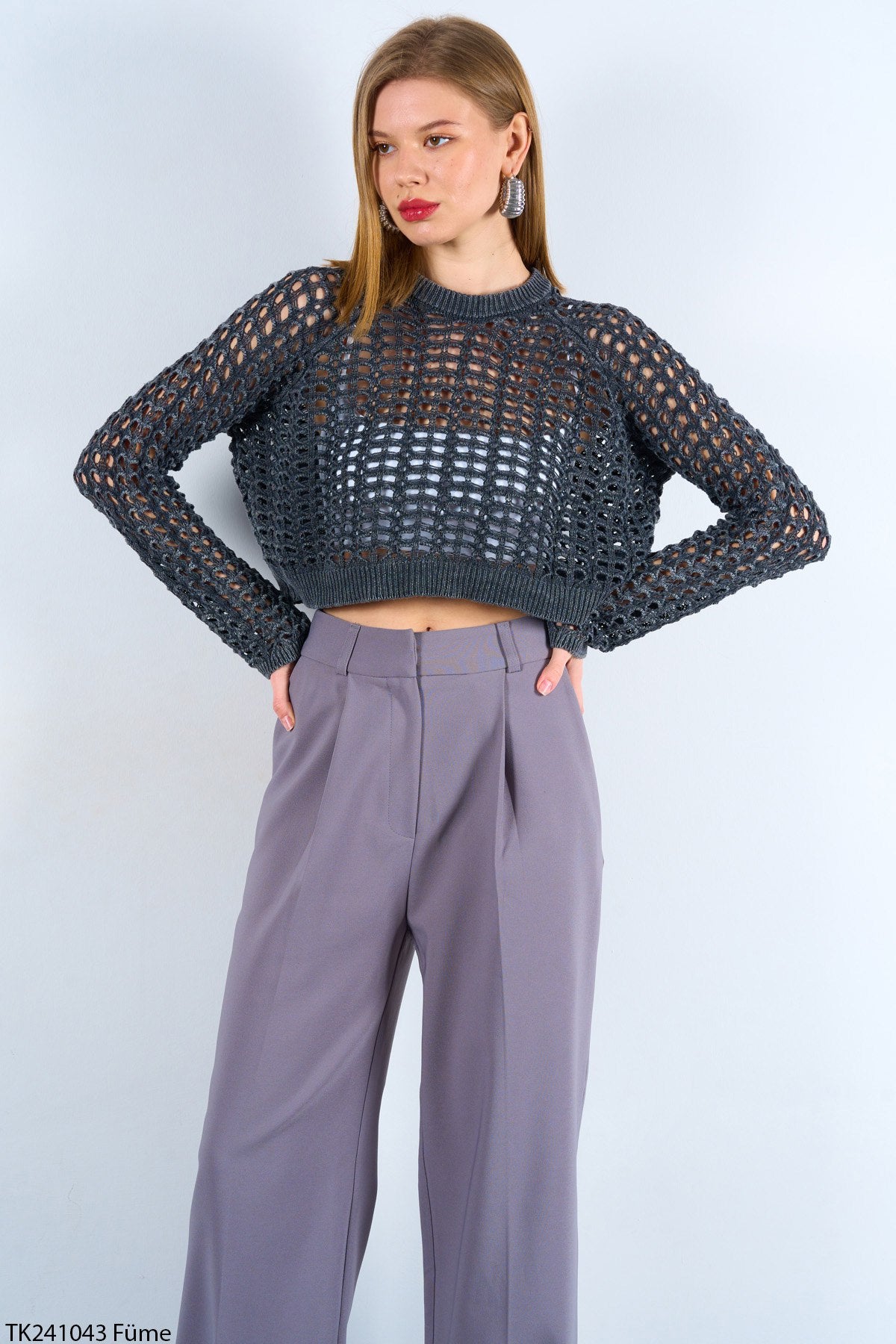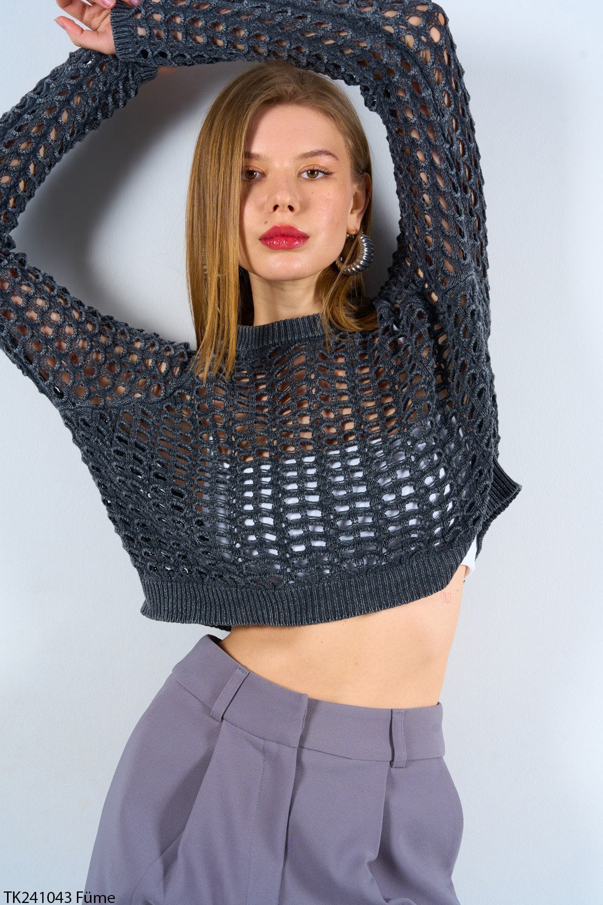 Kadın mevsimlik ajurlu triko crop kazak, hafif dokusuyla konfor ve şıklığı bir arada sunar.
